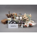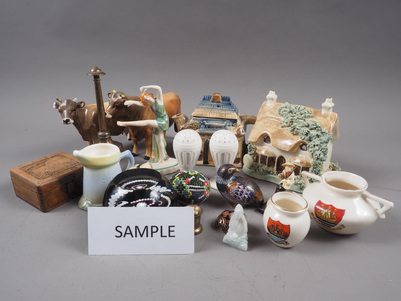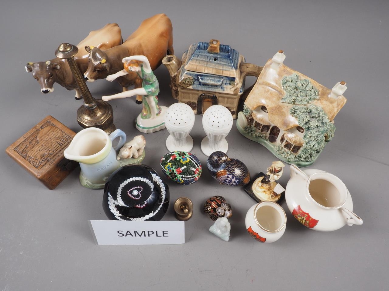 Two Beswick head of cattle, a cottage teapot, a cottage money box, an Art Deco dancer, a Caithness paperweight and other decorative items