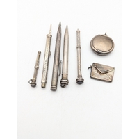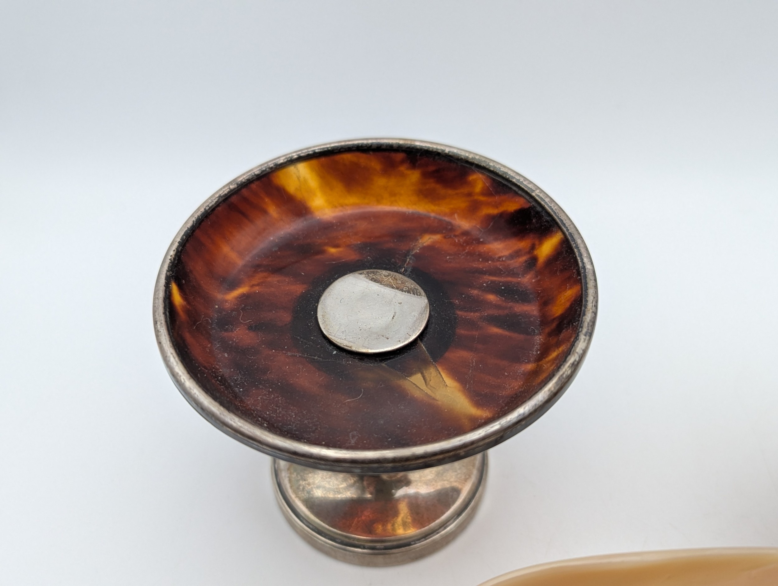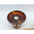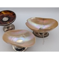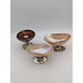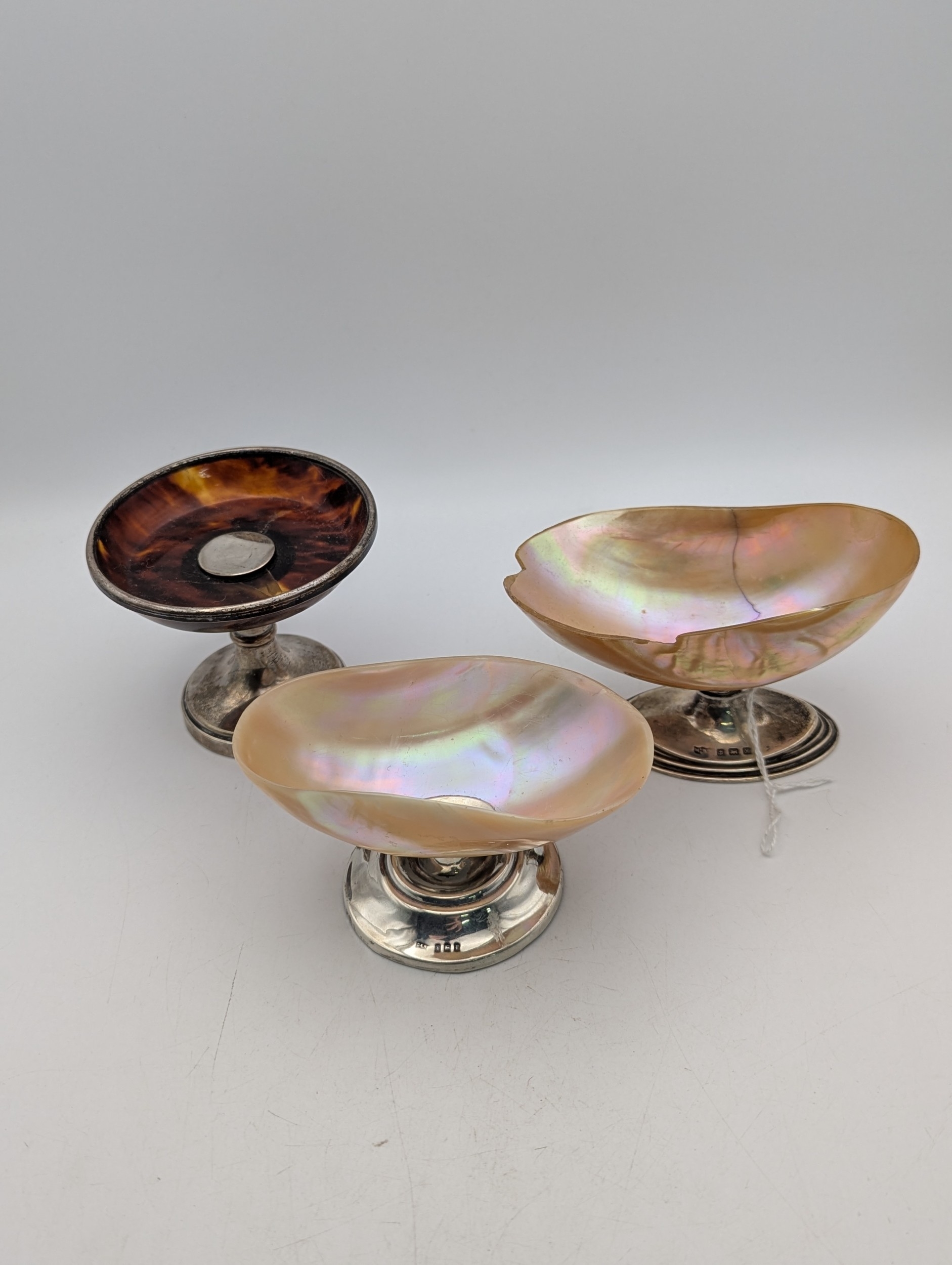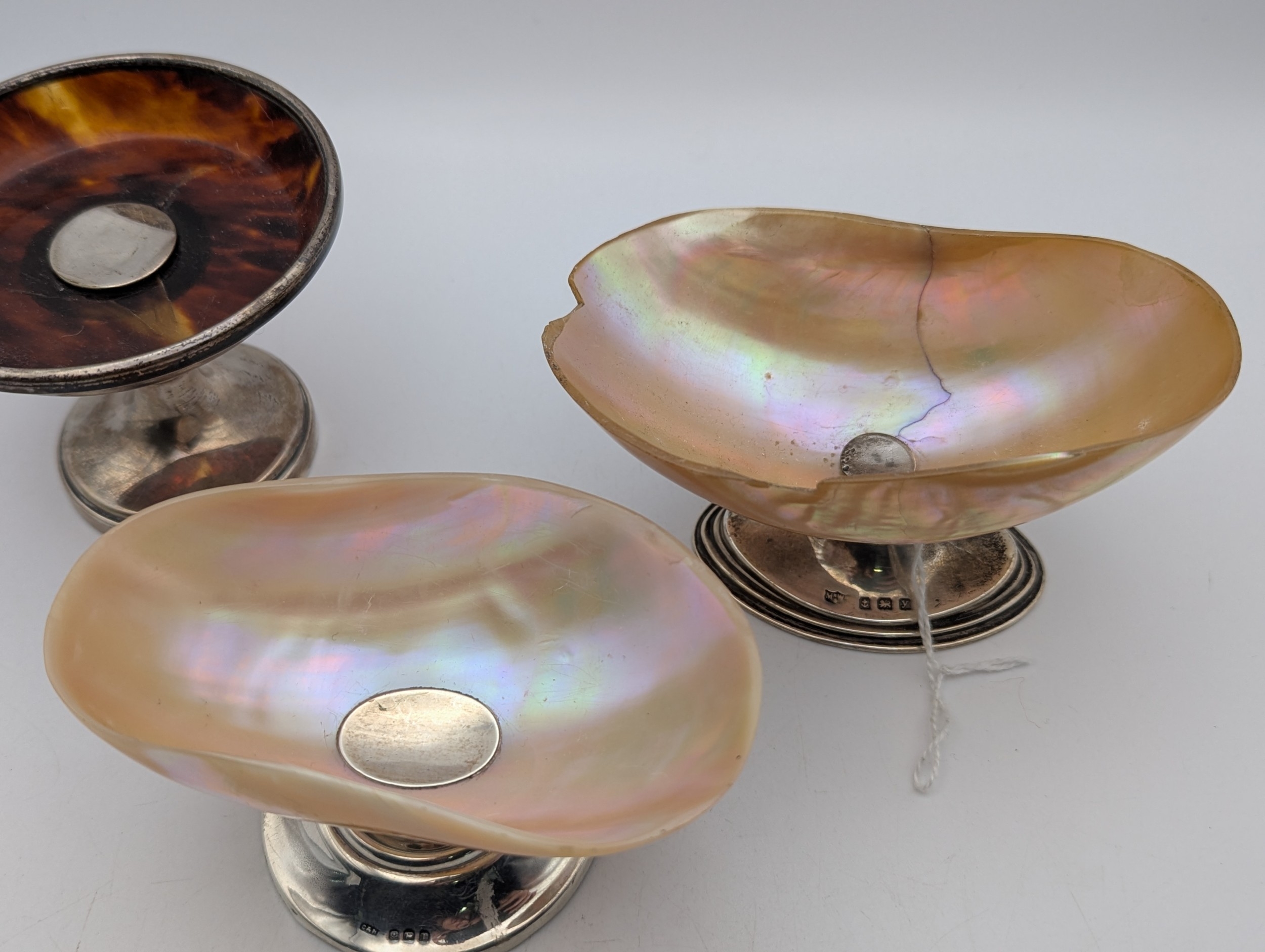 Two silver and mother of pearl salt dishes, together with a silver and tortoise shell pedestal pin dish, all having weighted base