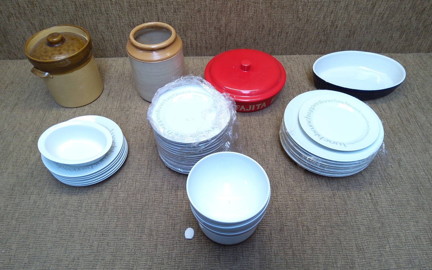 Large lot of new modern dinner plates, bowls, and a Fajita heater