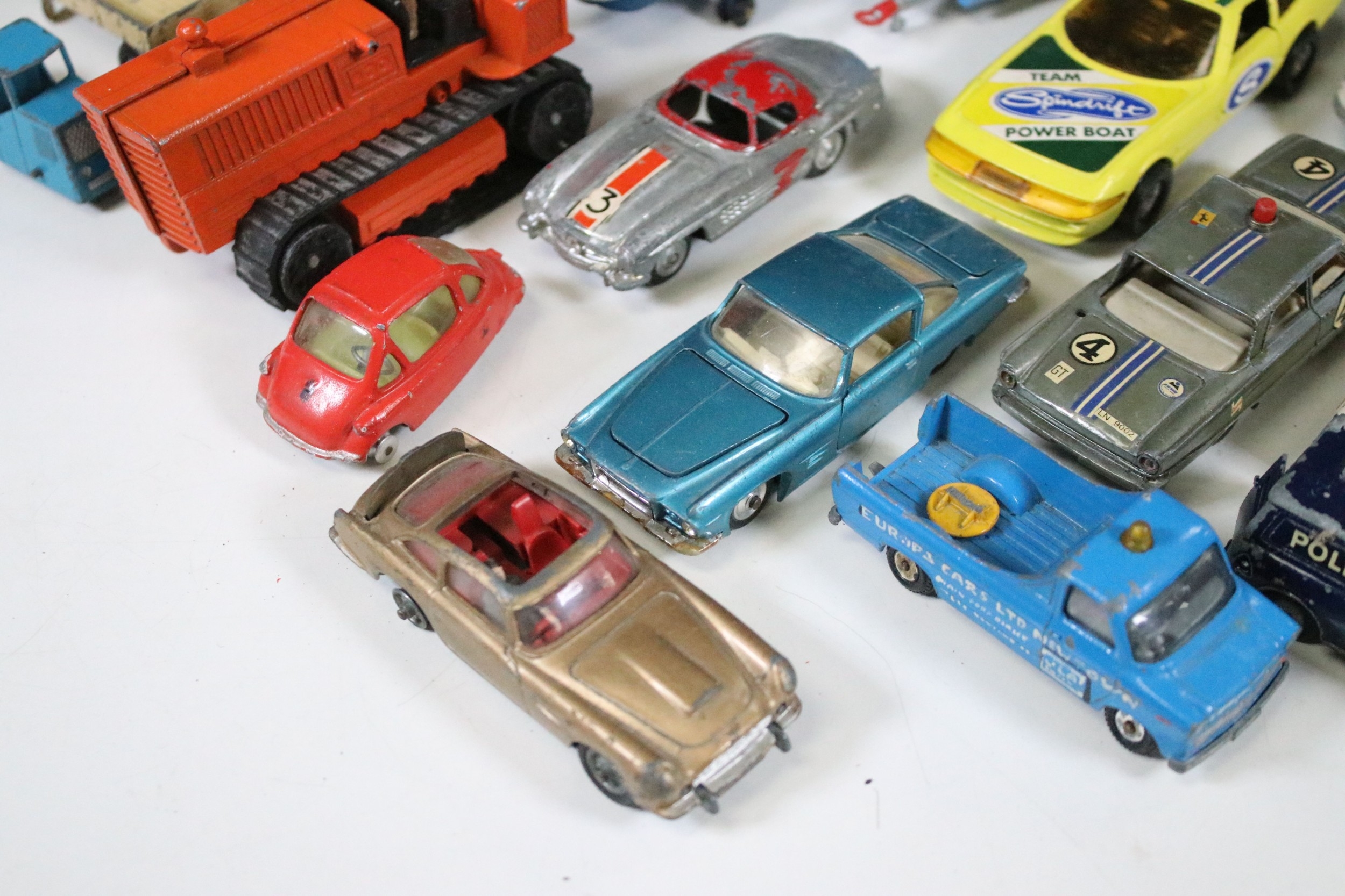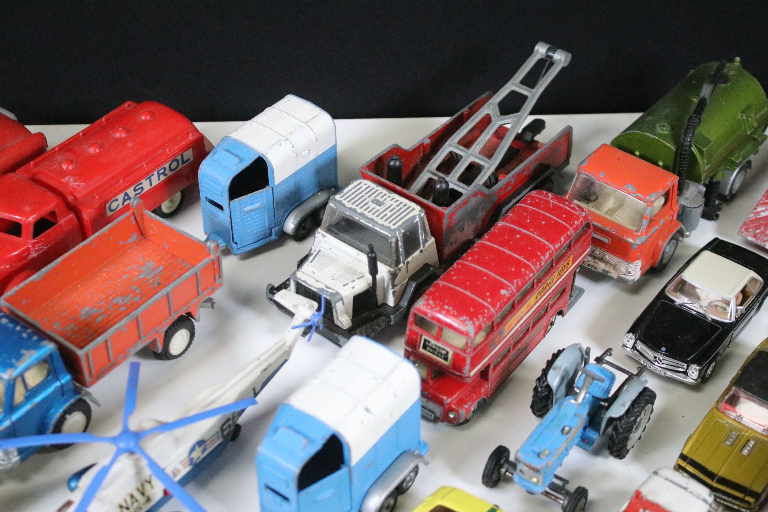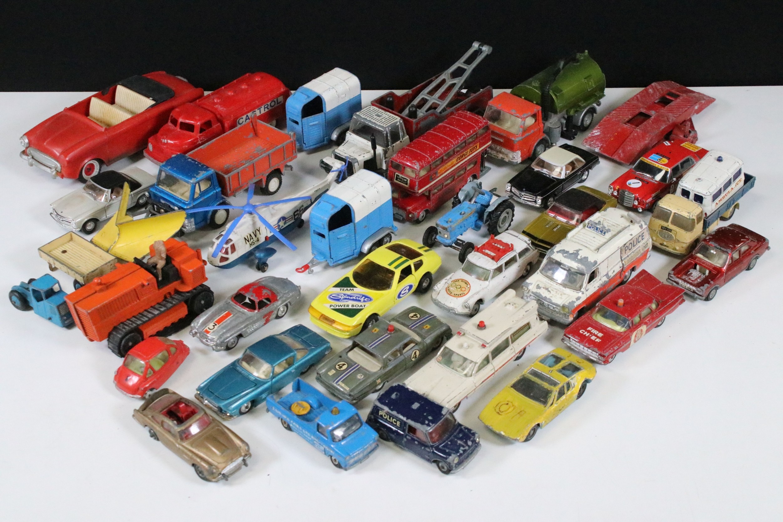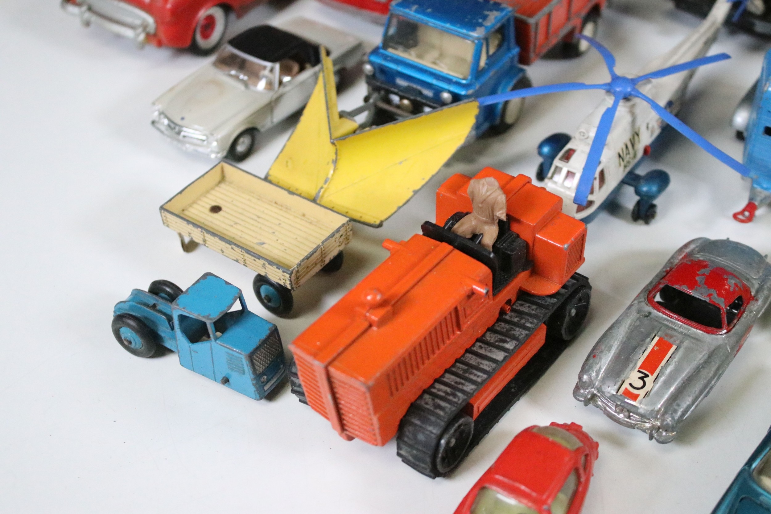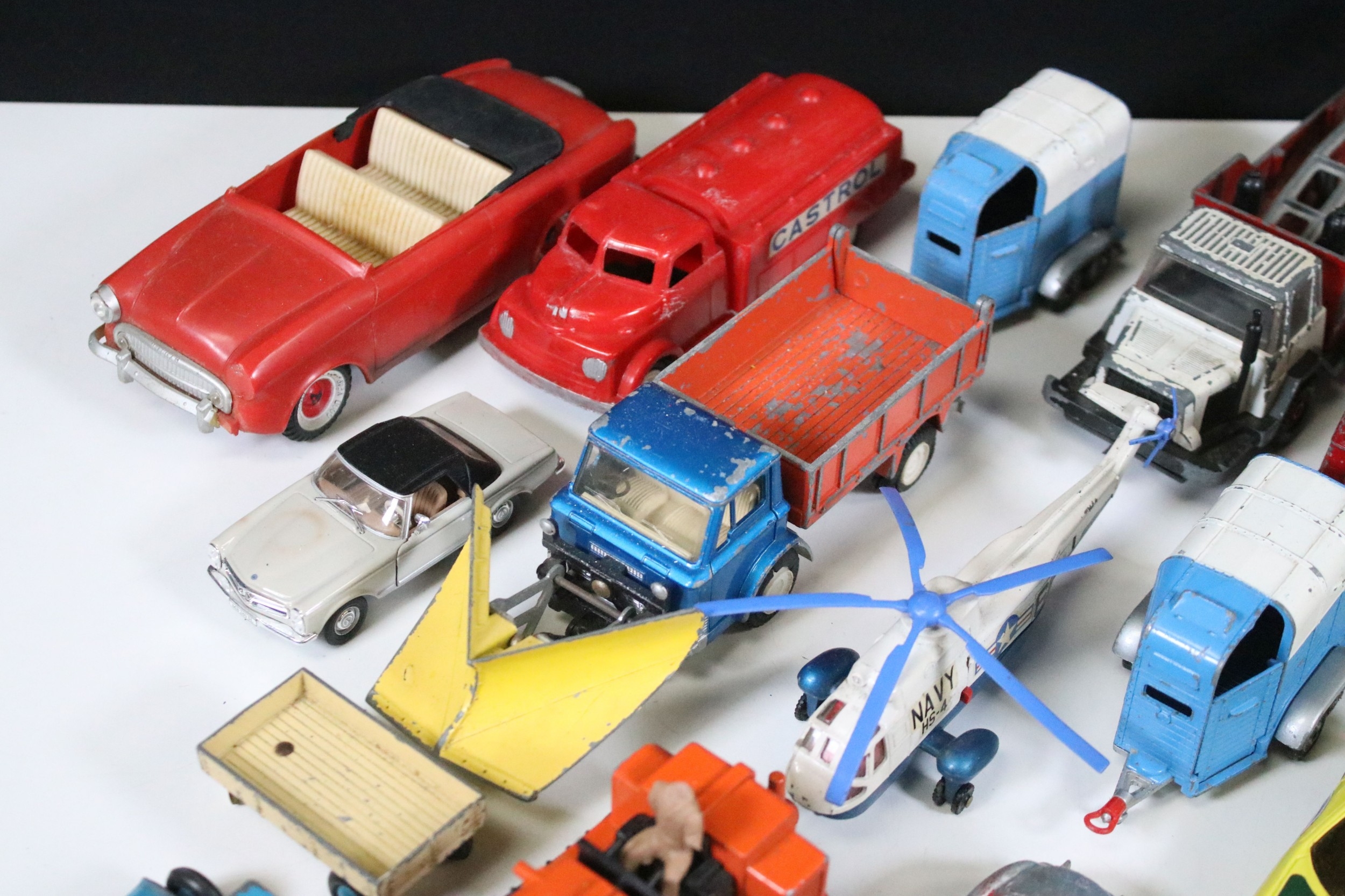 Over 30 mid 20th C play worn diecast & plastic models to include Dinky, Corgi, Lonestar etc