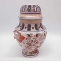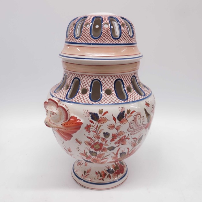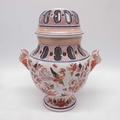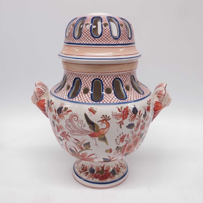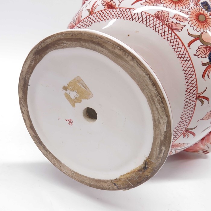 Continental lampbase, baluster twin handled form, the faux cover with reticulated detail, painted in Imari pallette with birds, flowers and leaves. 35cm high