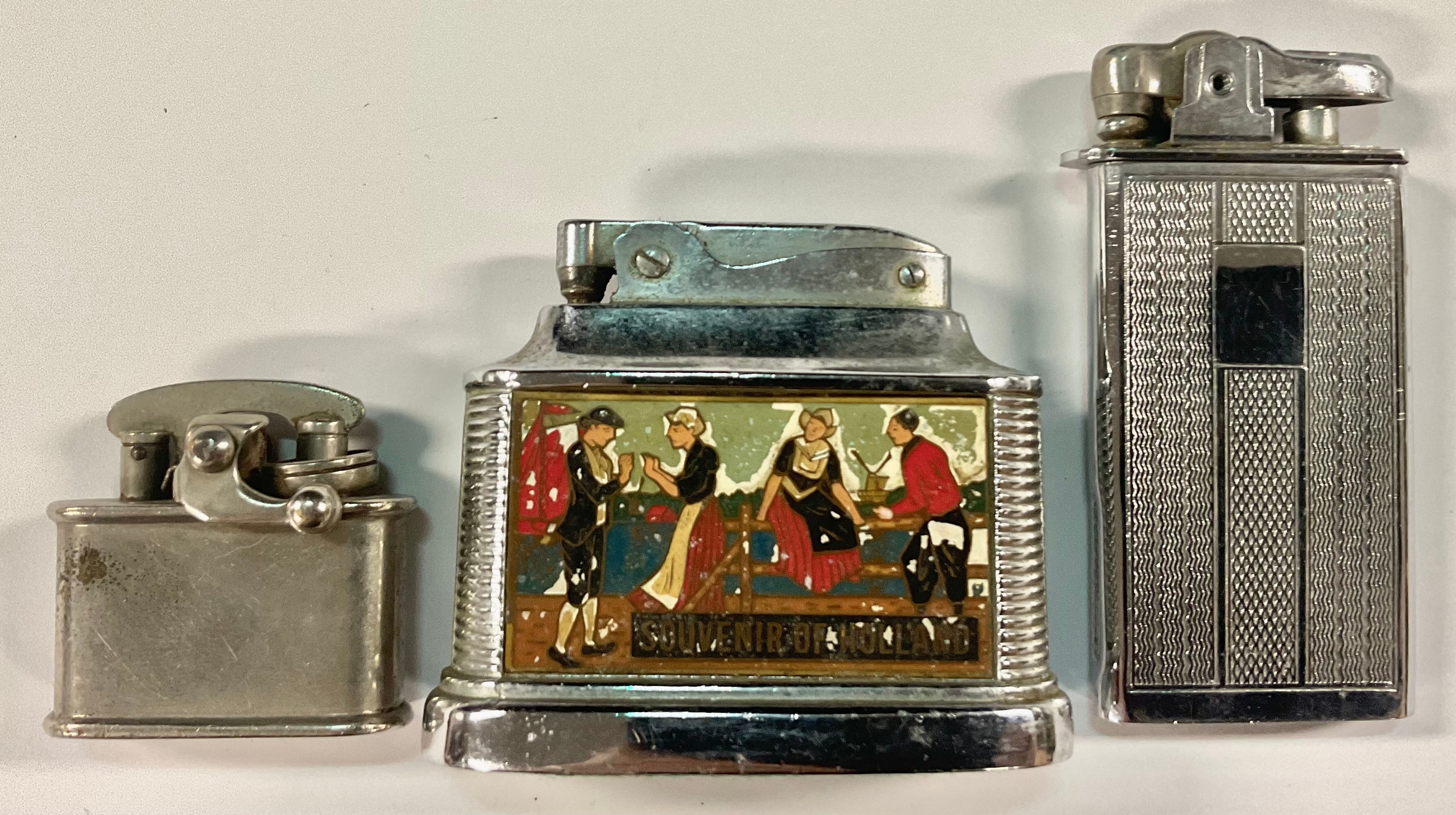 A 20th century Colibri pocket lighter, 4cm high; others, an Art Deco Kingcraft lighter, 7.5cm high; a novelty lighter, inscribed souvenir of Holland, 5.5cm high (3)