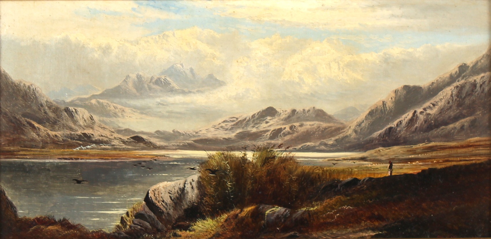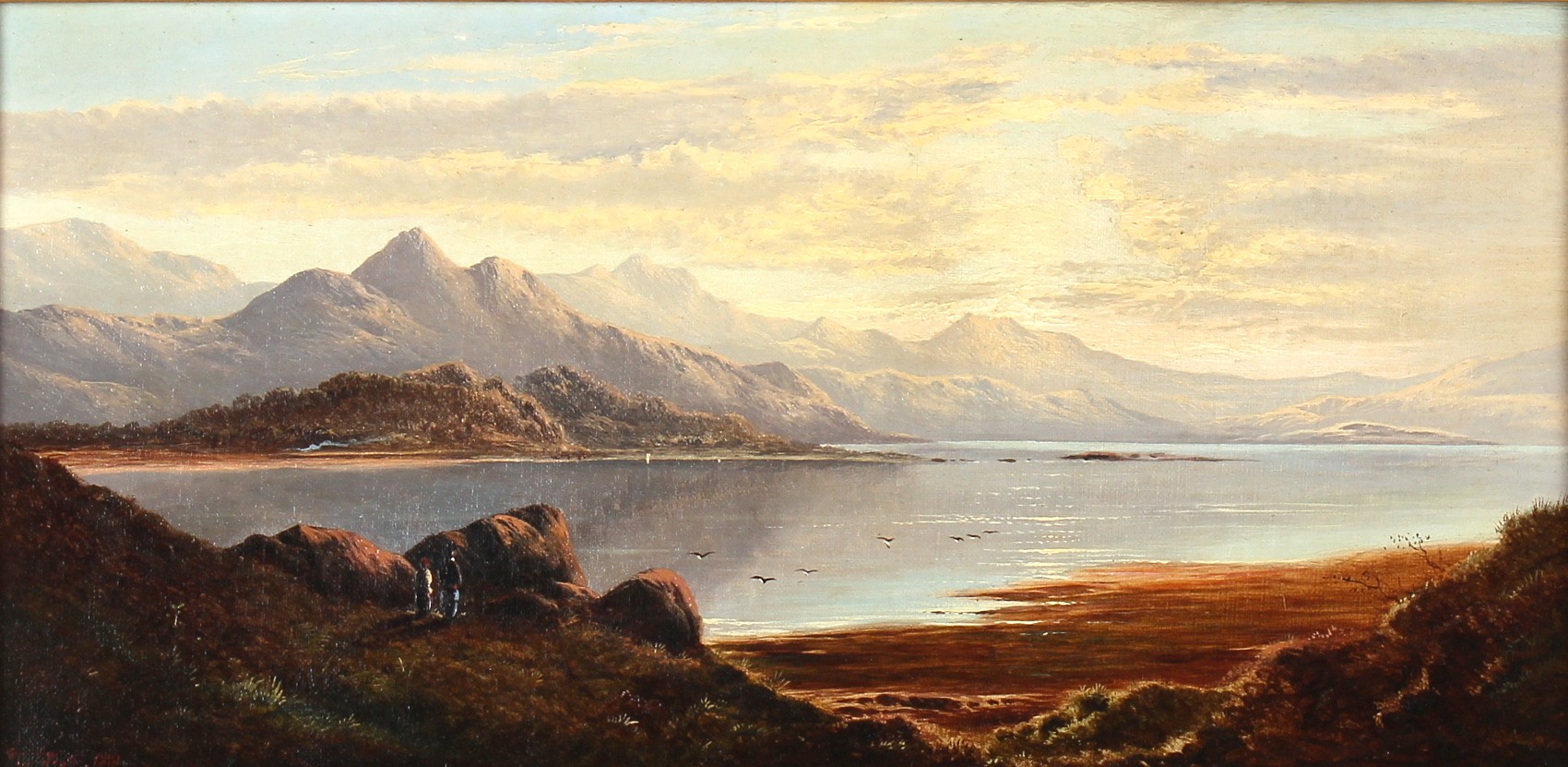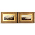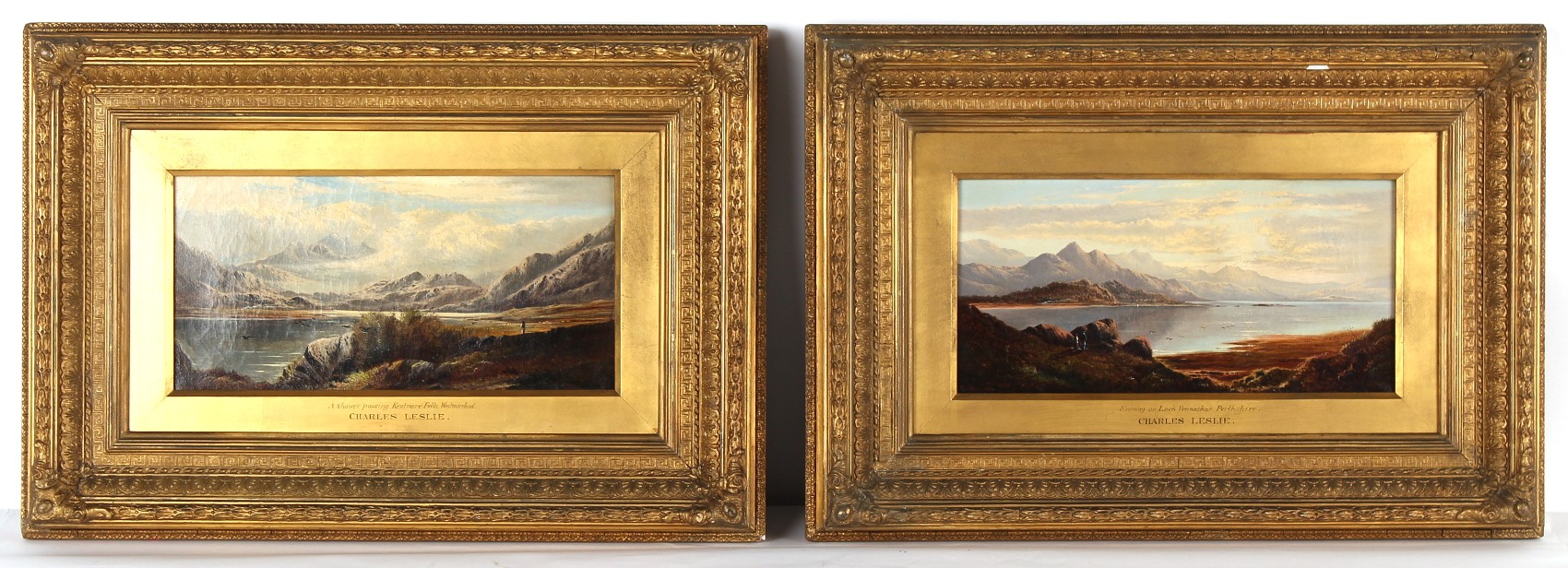 Property of a deceased estate - Charles Leslie (1839-1886) - 'A SHOWER PASSING KENTMERE FELLS, WESTMORELAND' and 'EVENING ON LOCH VENNACHAR, PERTHSHIRE' - a pair, oils on canvas, each 8 by 16ins. (20.3 by 40.6cms.), in gilt composition frame - both signed in red & dated 1881 (2).