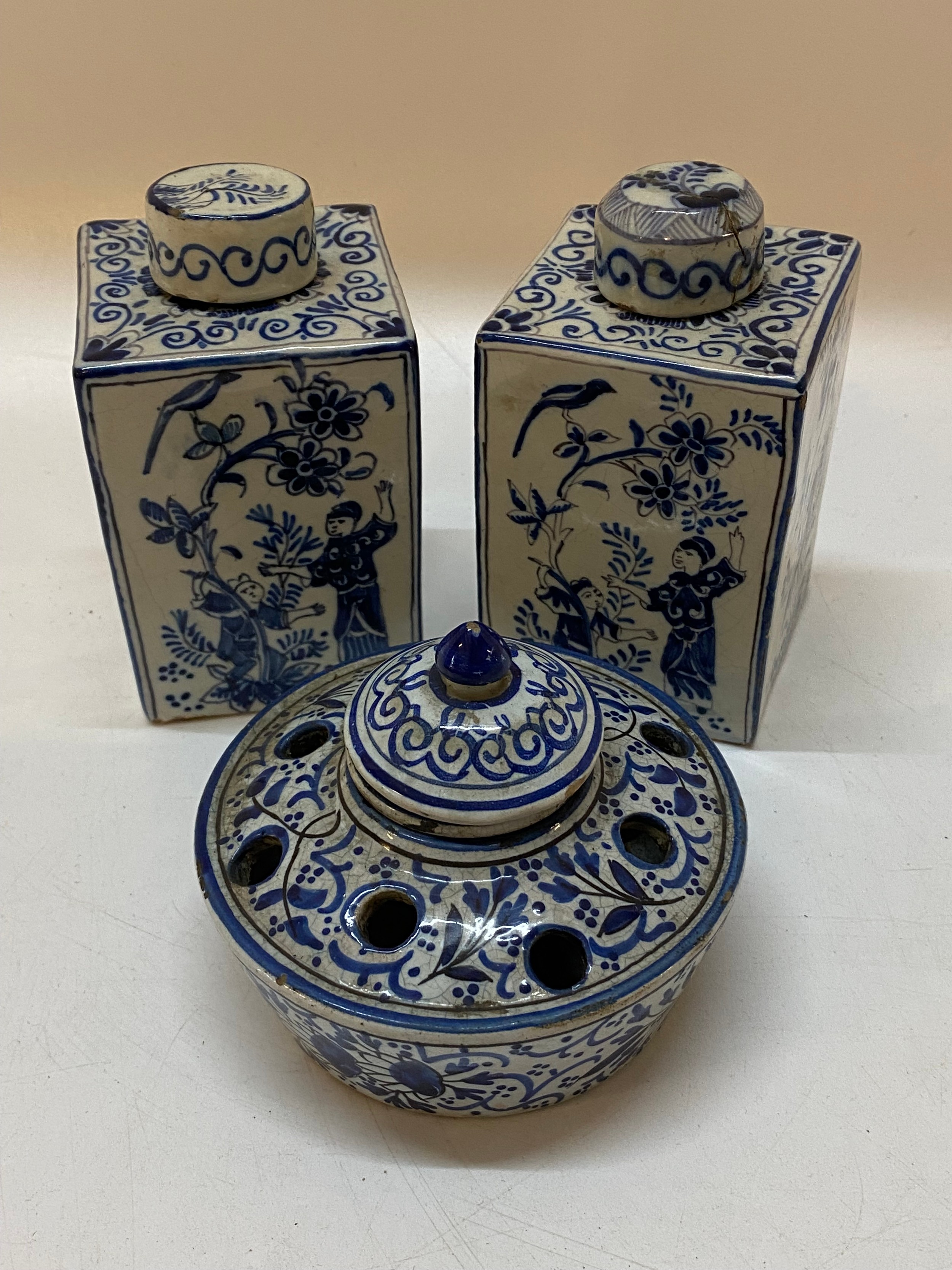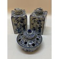 A pair of antique Delft Faience tea canisters of square form decorated in the Oriental taste with figures and birds - 4 1/2in. high and a similar inkstand painted flowers - 3 3/4in. dia.