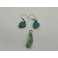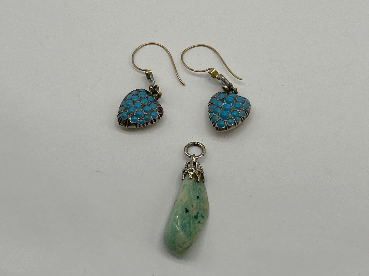 A pair of turquoise heart ear-rings 1 stone missing and jade pendant