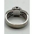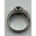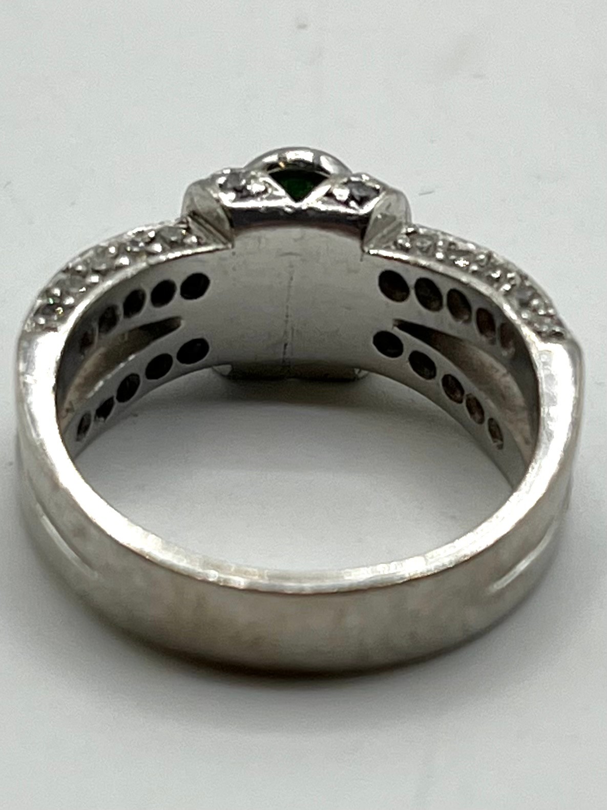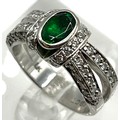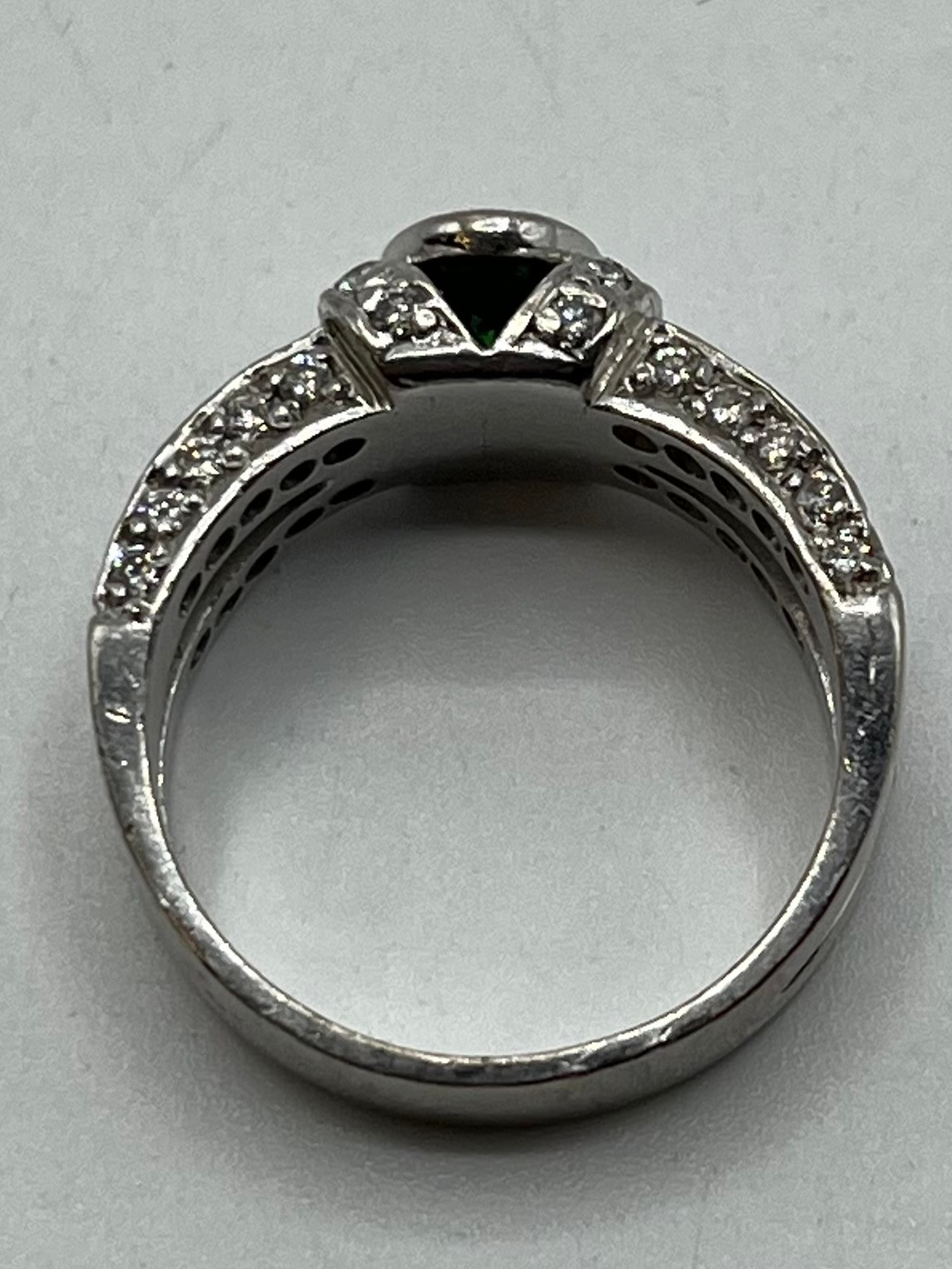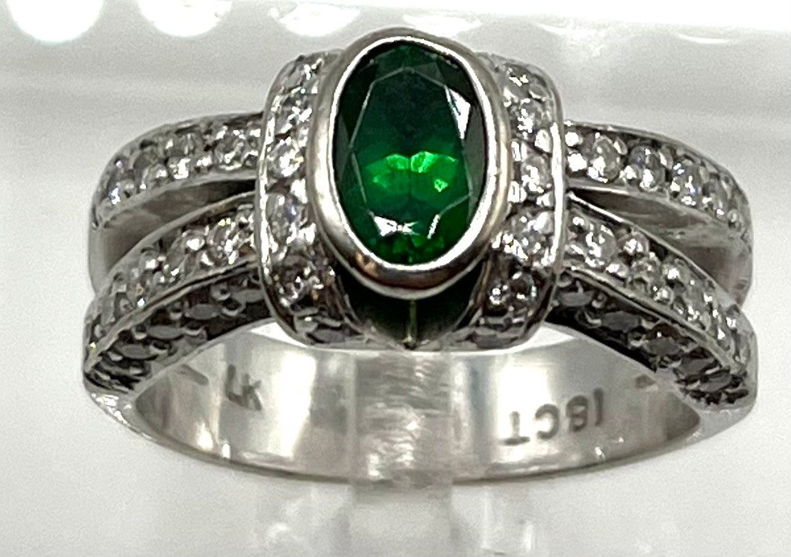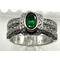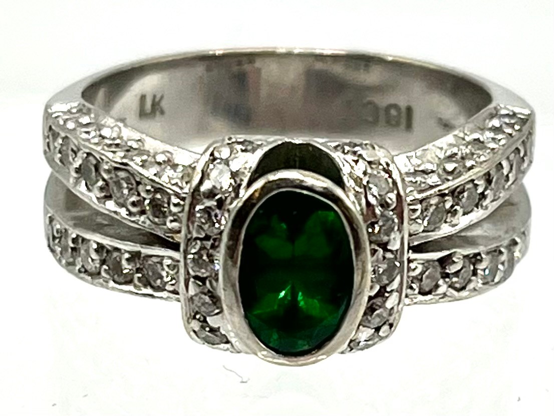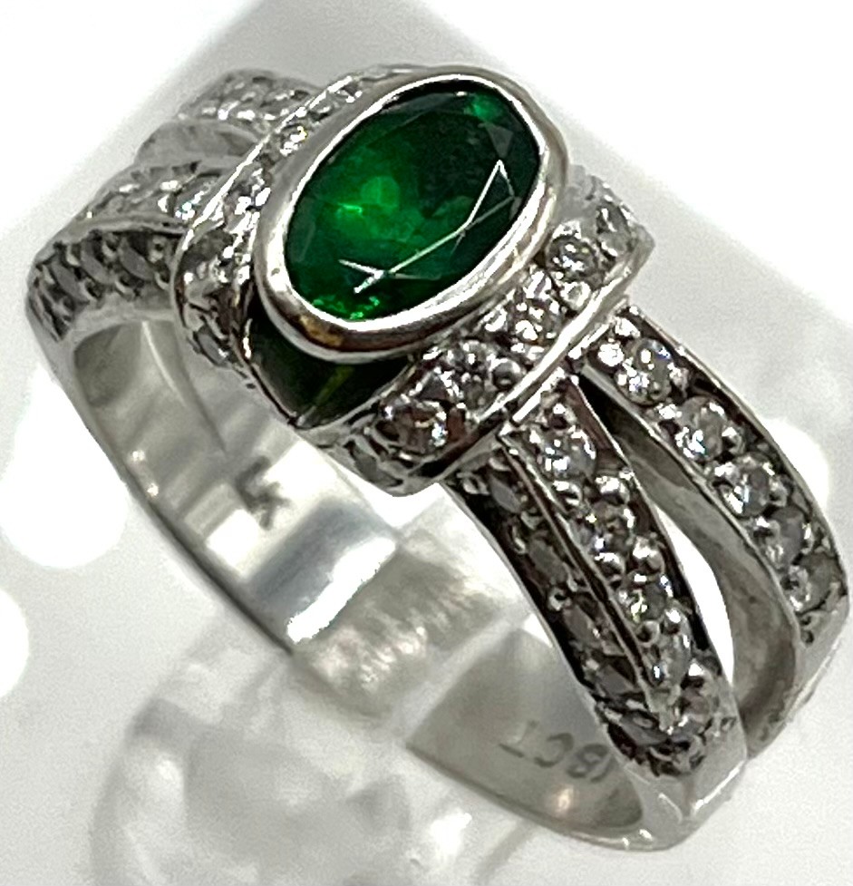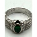 An 18ct white gold emerald and diamond dress ring. Central oval free cut emerald in a rub over setting with single cut diamond shoulders. Size L. 8.00g.