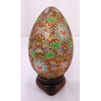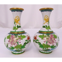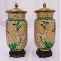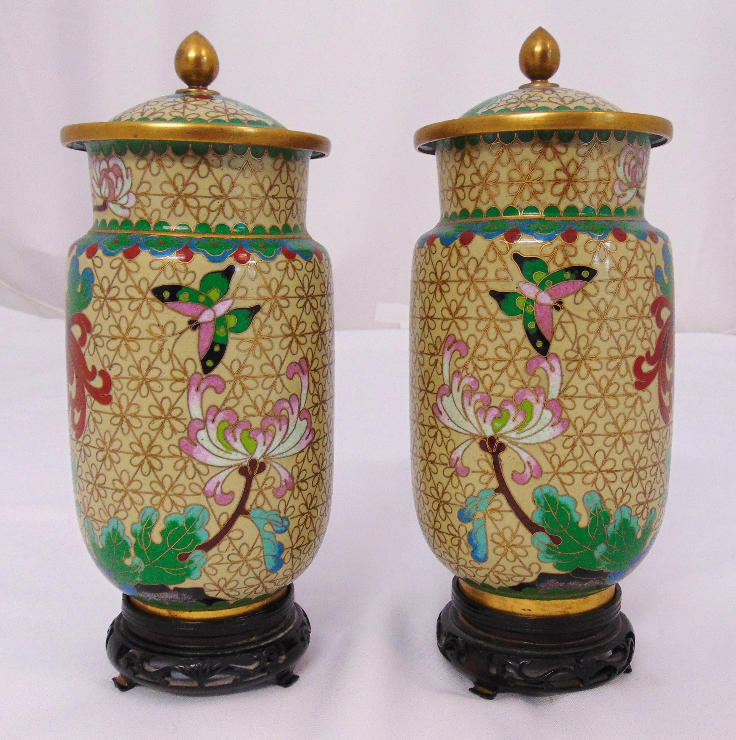 A pair of Chinese cloisonné vases and covers, the ovoid bodies decorated with butterflies, flowers and leaves with domed pull off covers to include carved hardwood stands, 25cm (h)