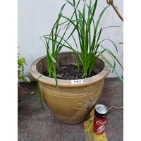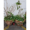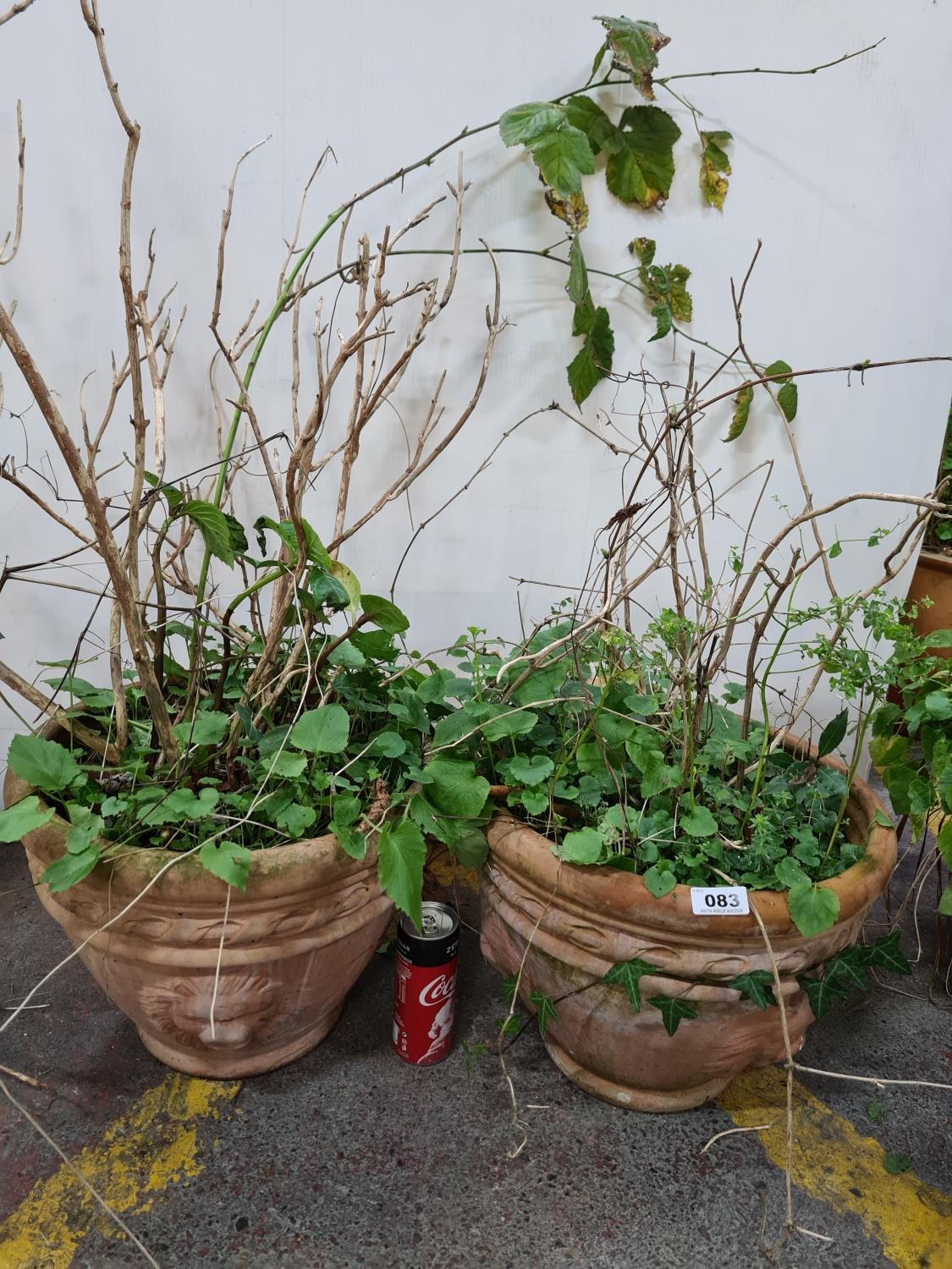 Two large Heavy Terracoota plant pots with lion mask faces in relief.