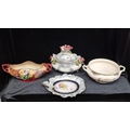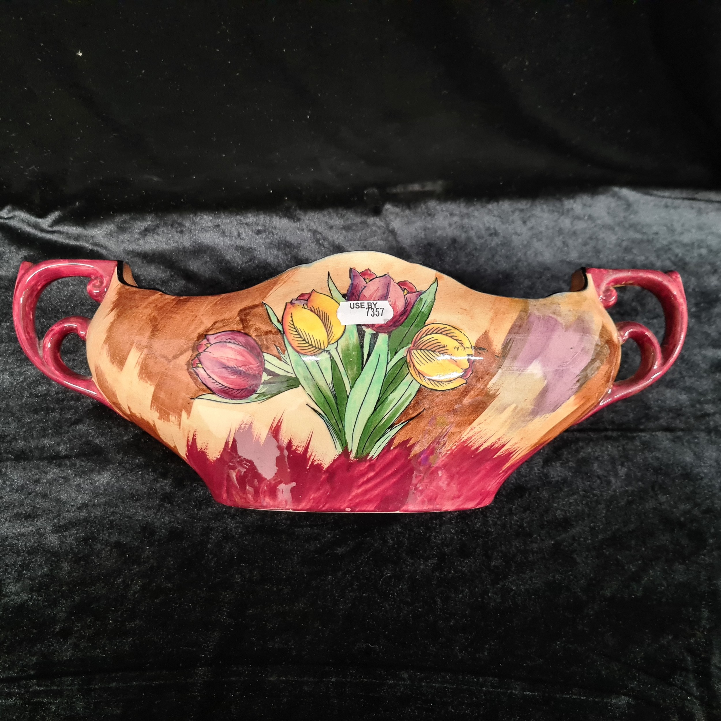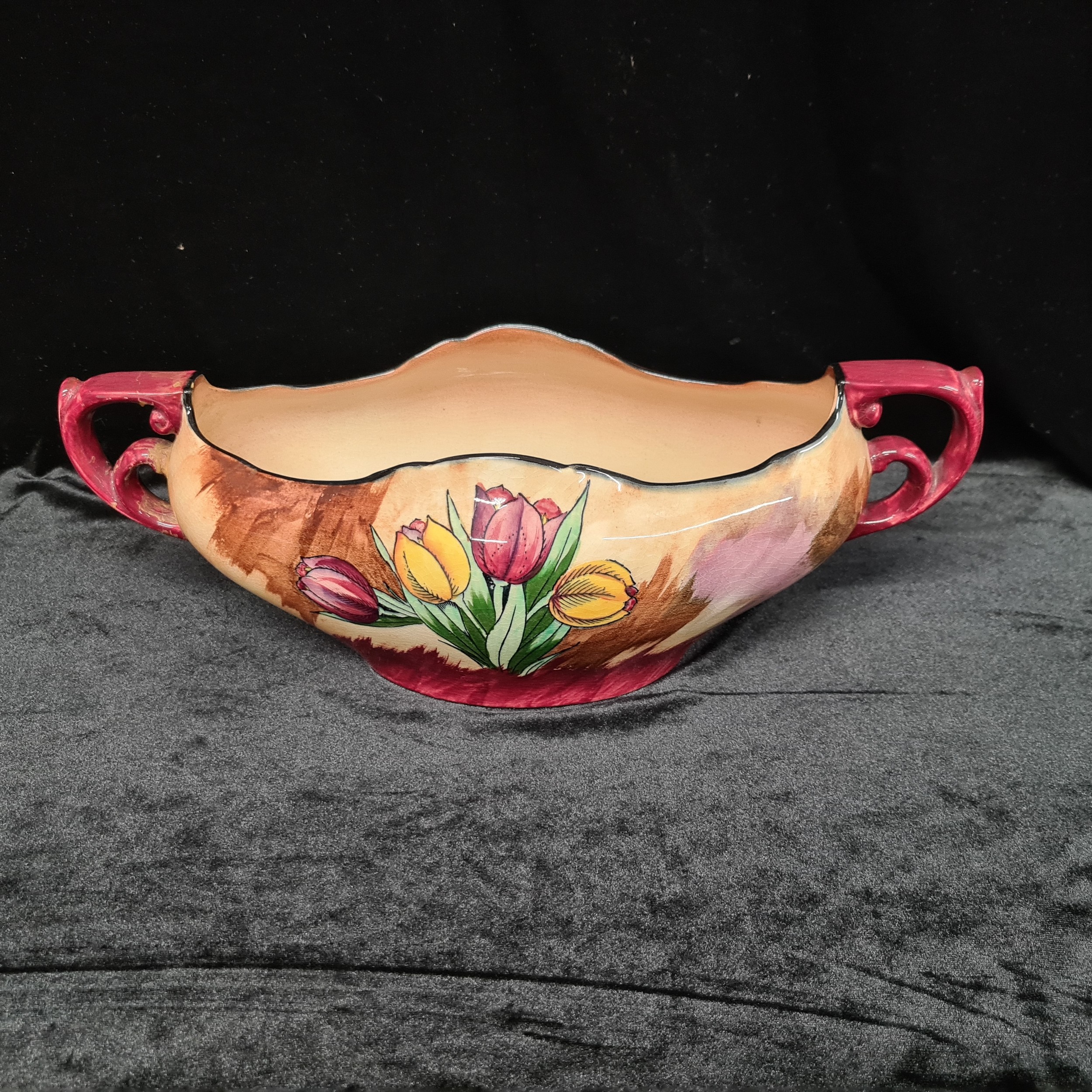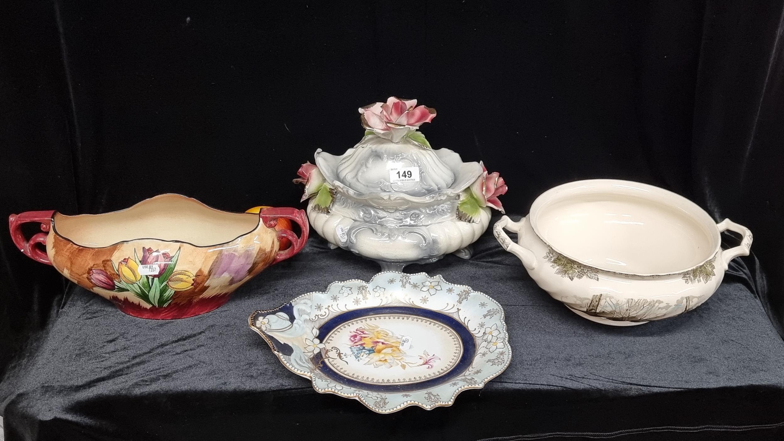 Four vintage ceramic items including an Art Deco Hollinshead & Kirkham two handled flower bowl in the "Tuliptime" pattern, circa 1939, in great condition. Selling for £120 on PremierAntiques.co.uk and three other pieces.