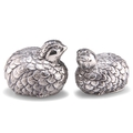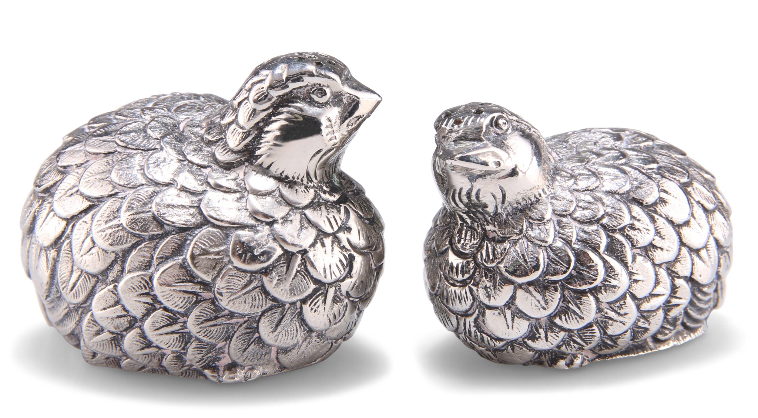 A PAIR OF SILVER-PLATED NOVELTY PEPPER POTS,Êby Gucci, in the form of quail. (2) Largest 5.1cm high