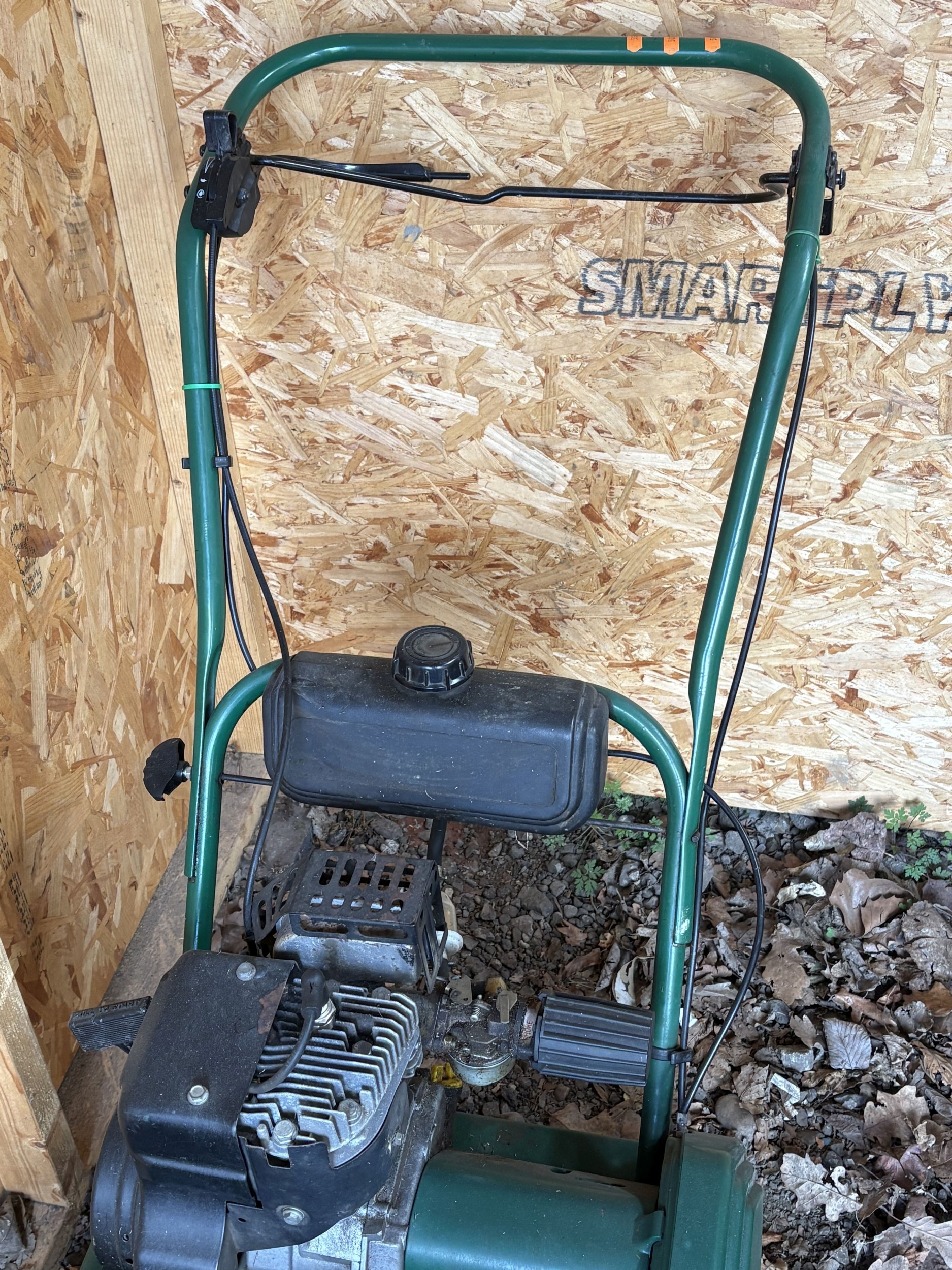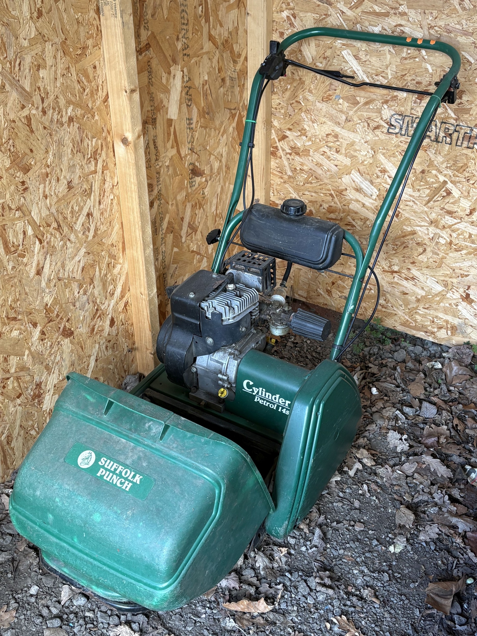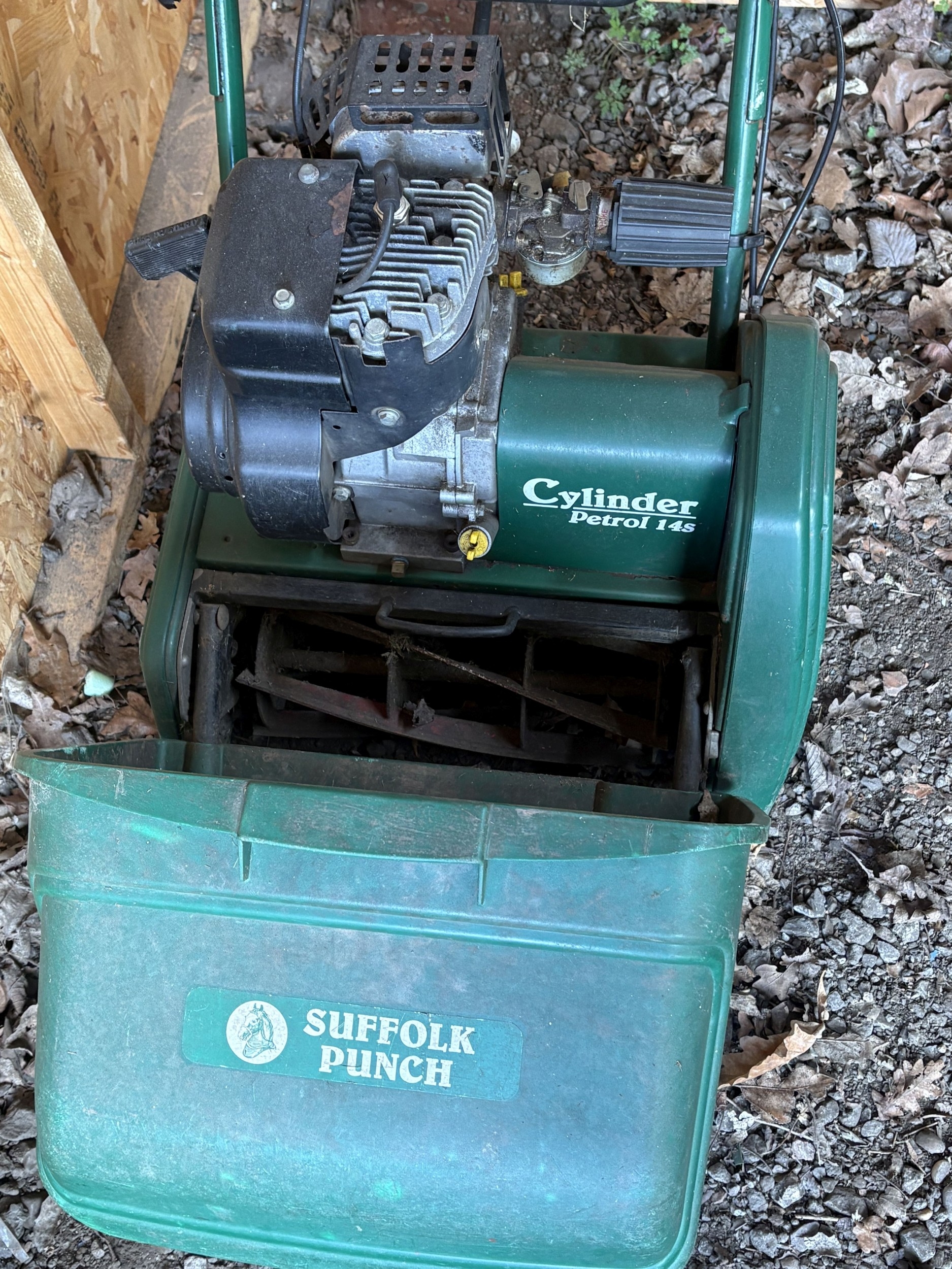 A SUFFOLK PUNCH 14s PETROL CYLINDER LAWNMOWER, engine turns but has not been tested