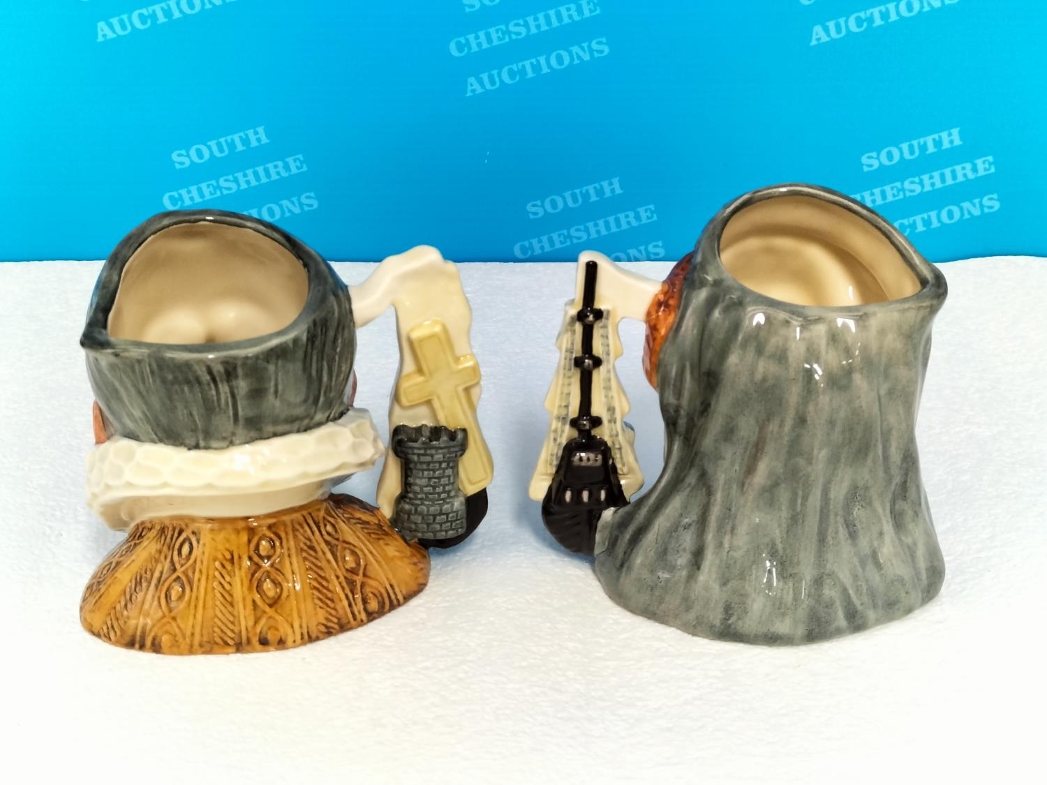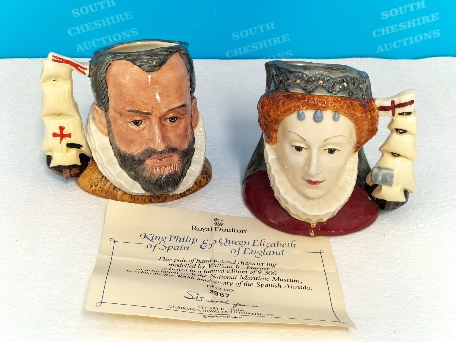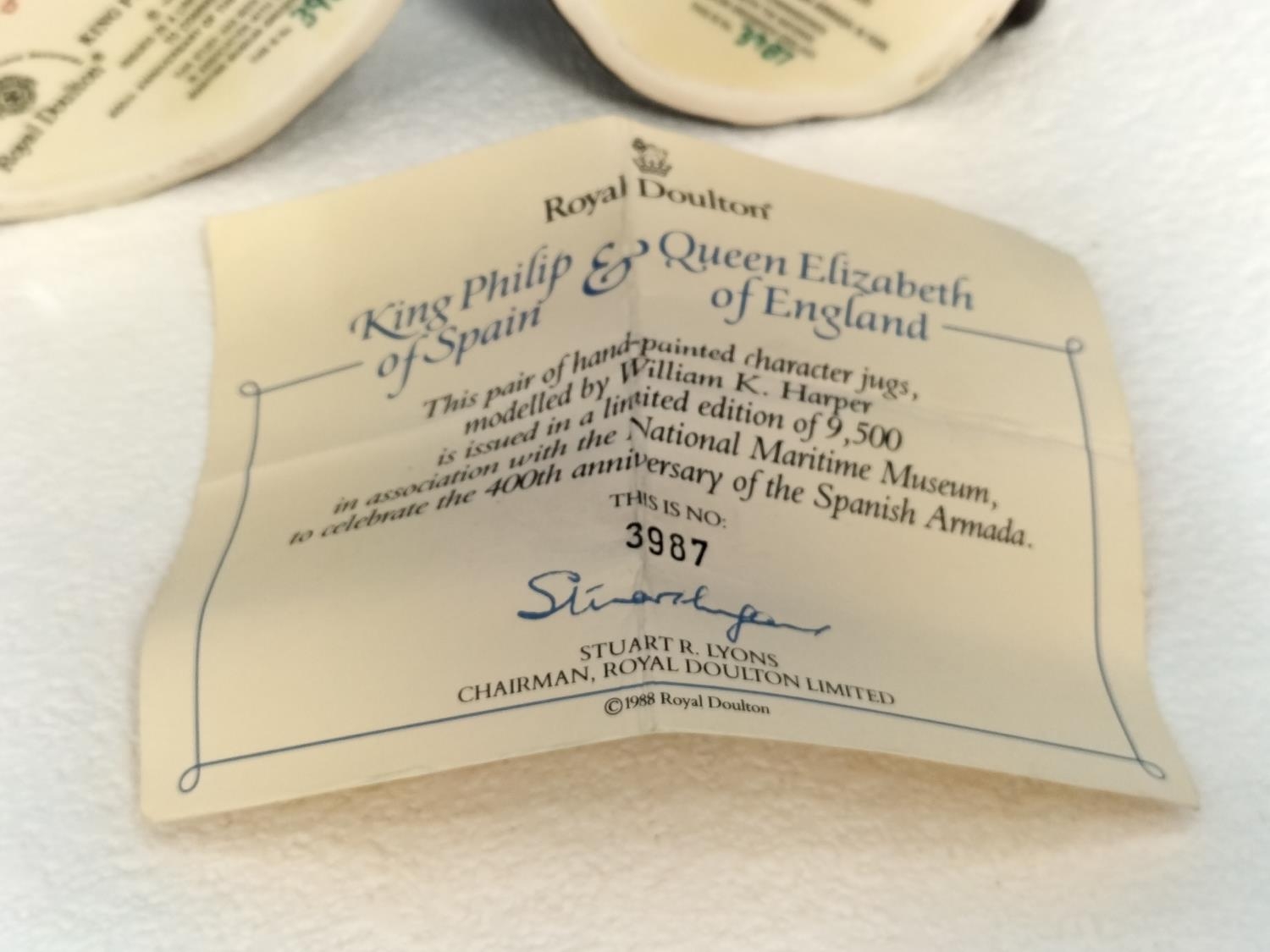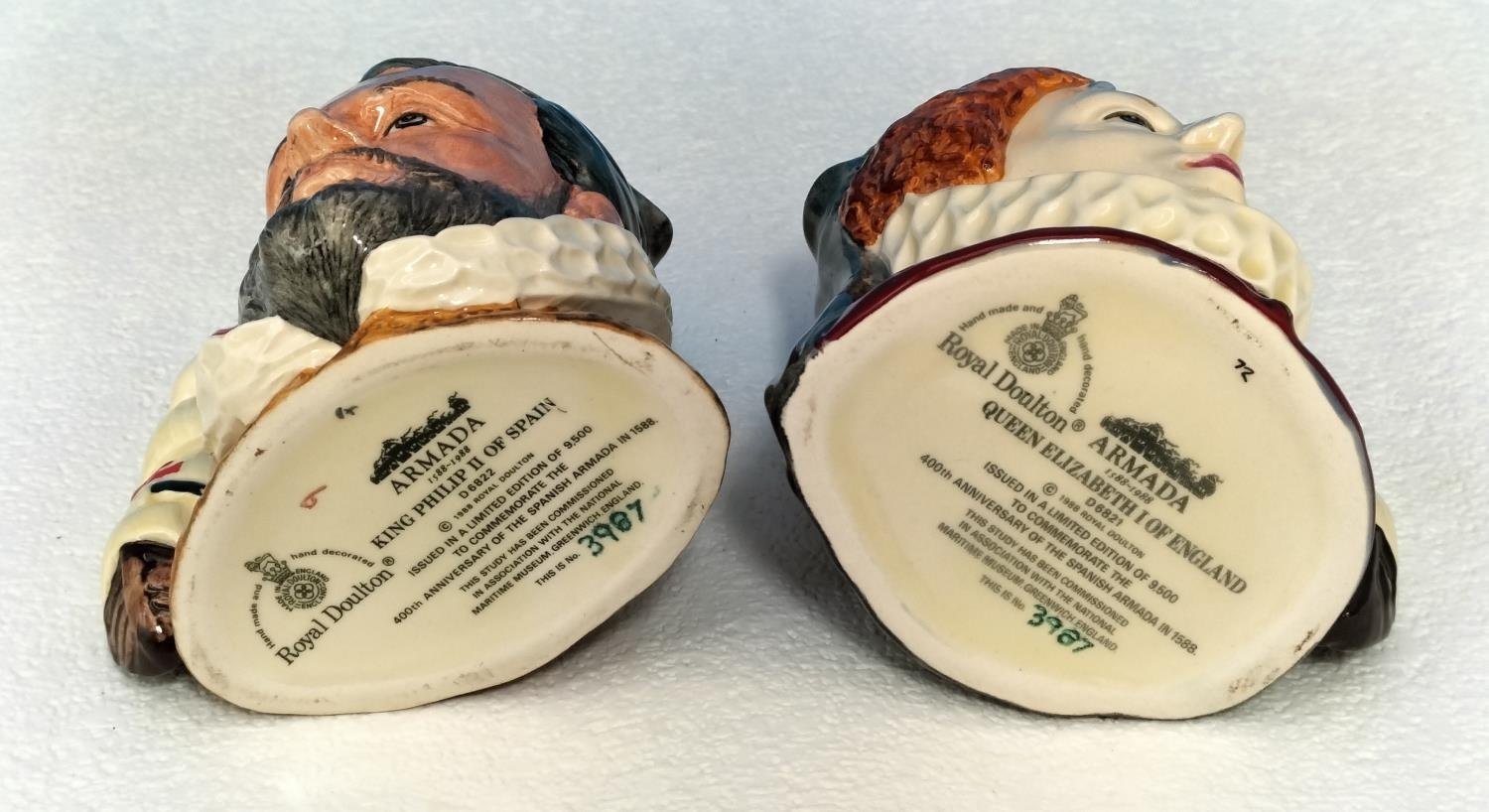 Royal Doulton Limited Edition 3987/9500 Character Jug Set to include 'King Philip II of Spain' D6822 and 'Queen Elizabeth II of England' D 6821 to Commemorate the 400th Anniversary of the Spanish Armada in 1588