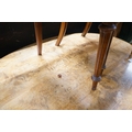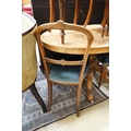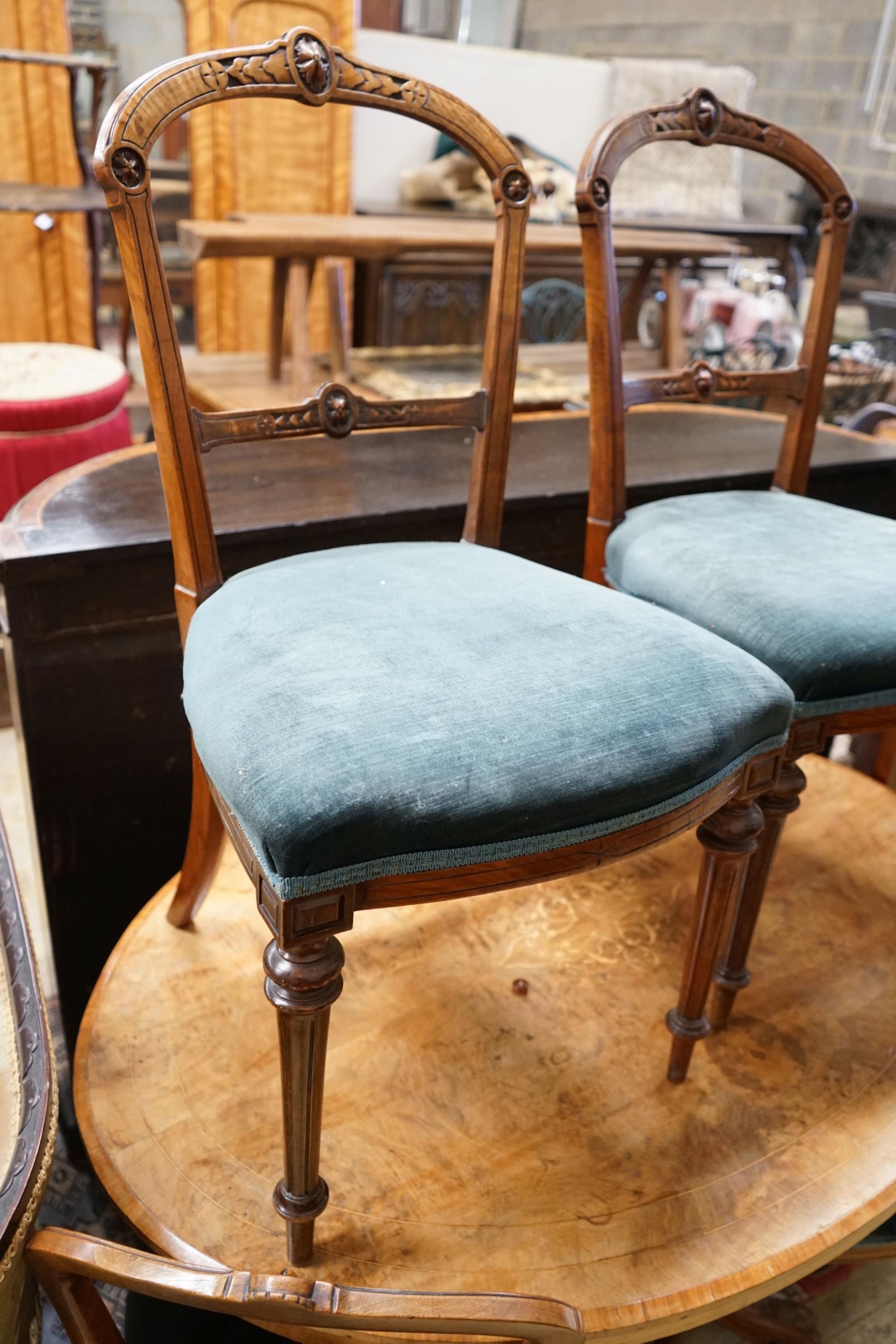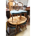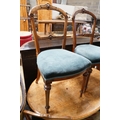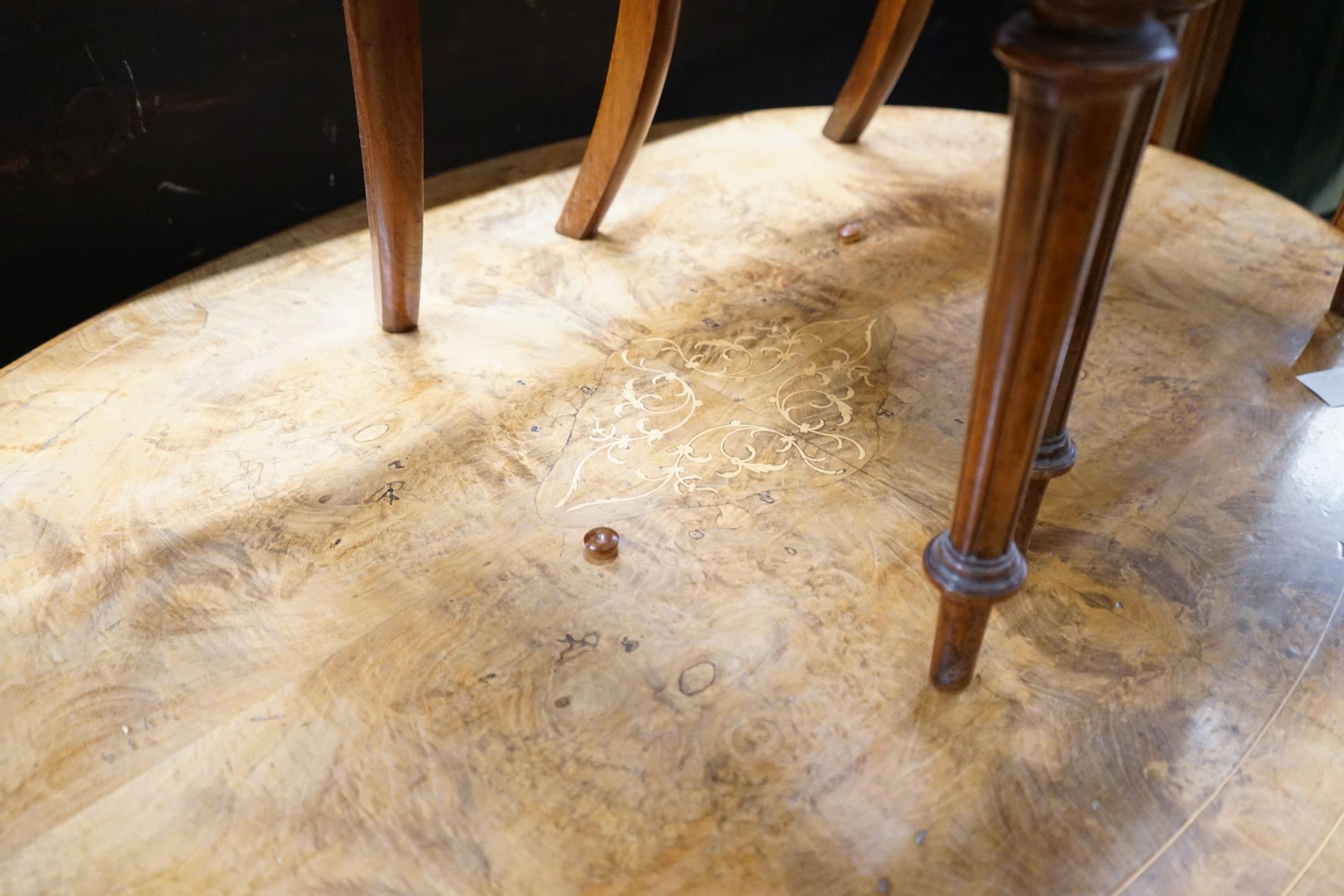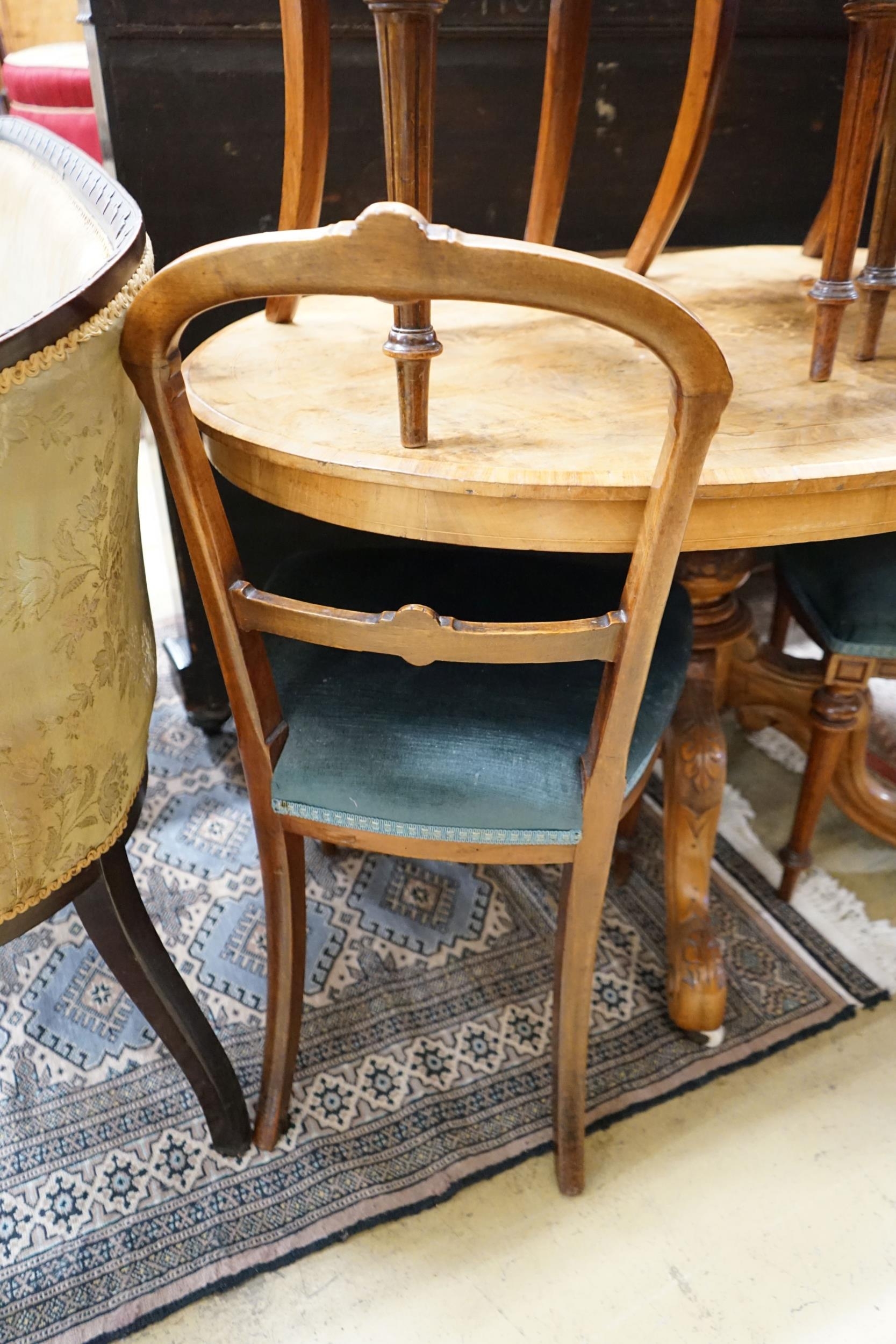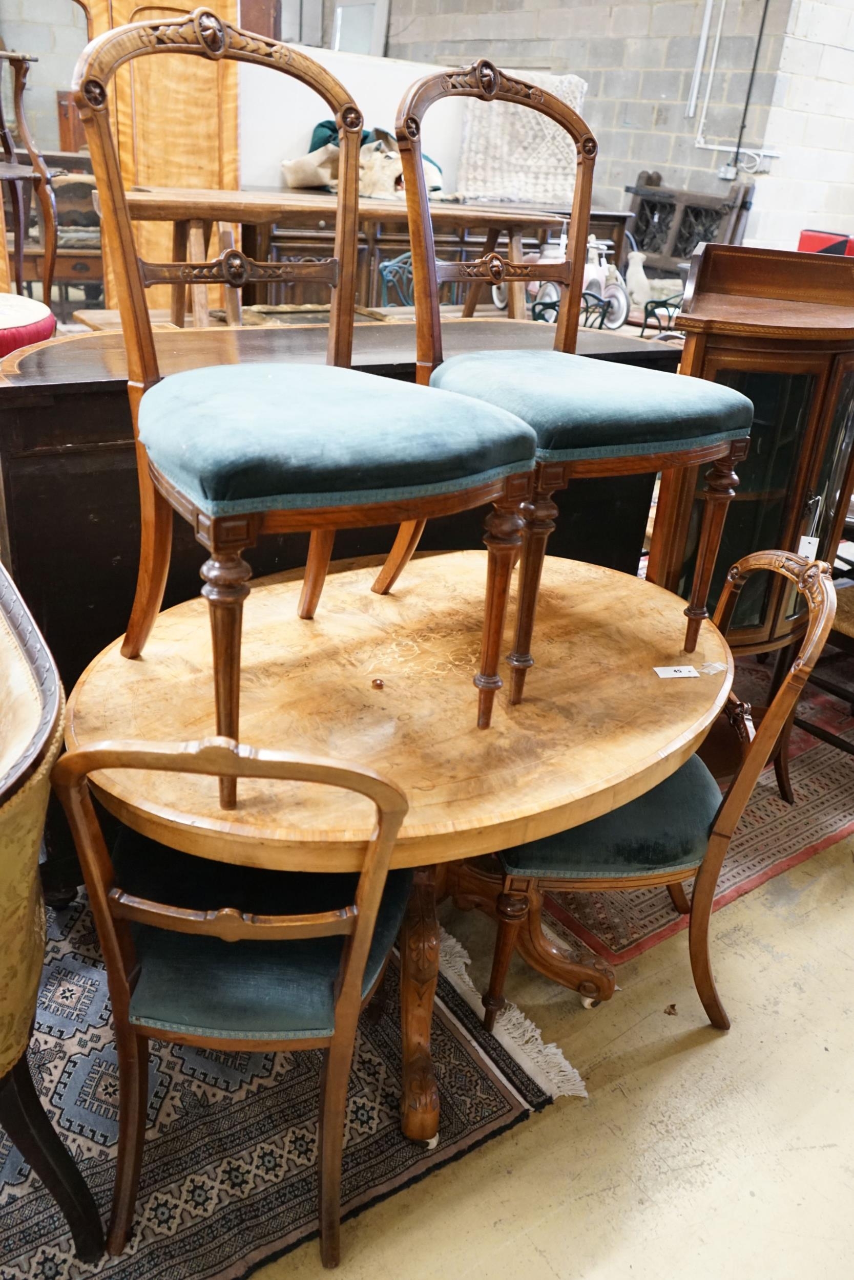 A Victorian burr walnut oval topped dining table, width 120cm, depth 85cm, height 70cm together with four Victorian walnut dining chairs (5)