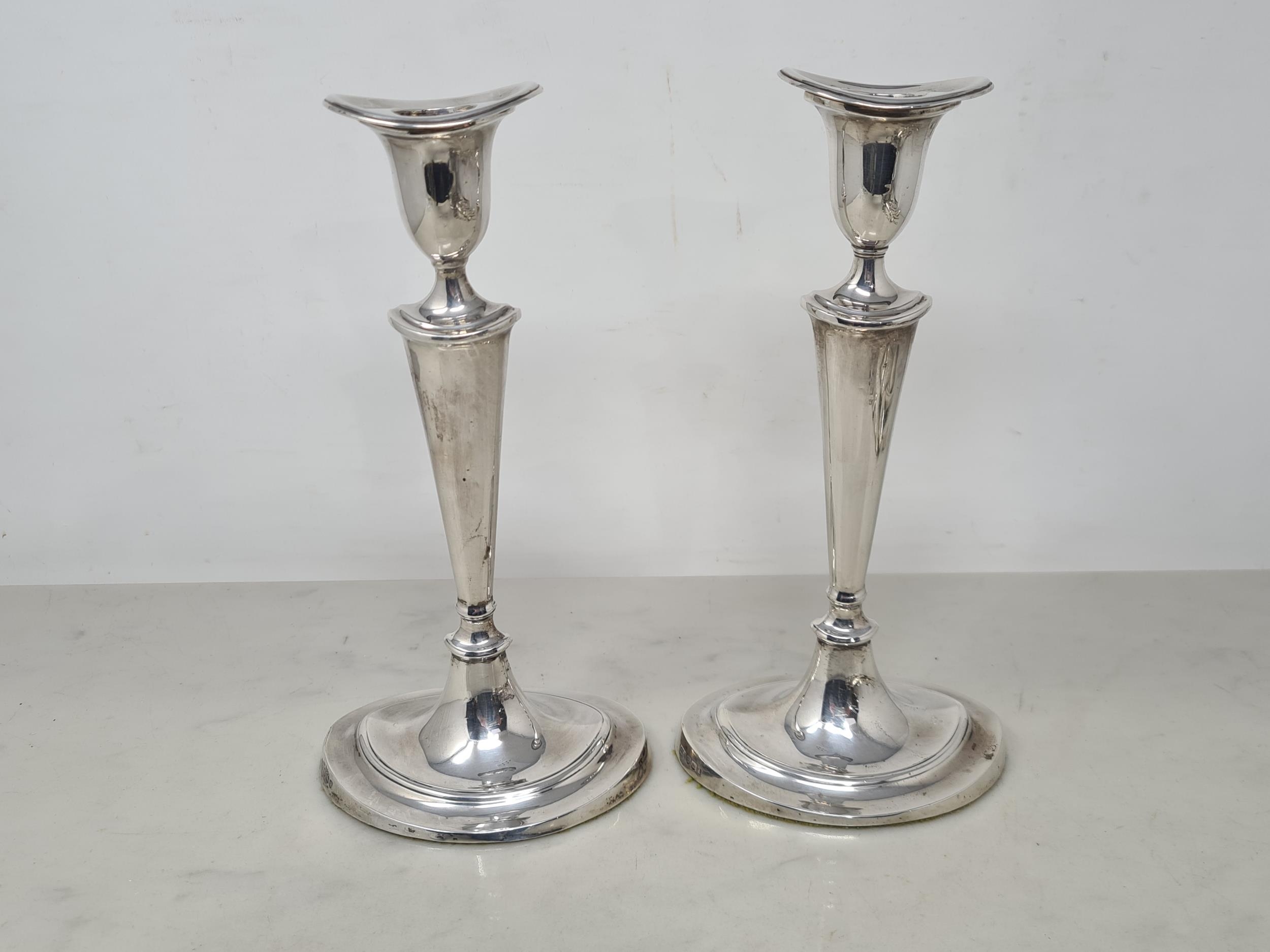 A pair of George V silver Candlesticks with tapering columns on oval bases, Sheffield 1918
