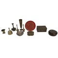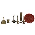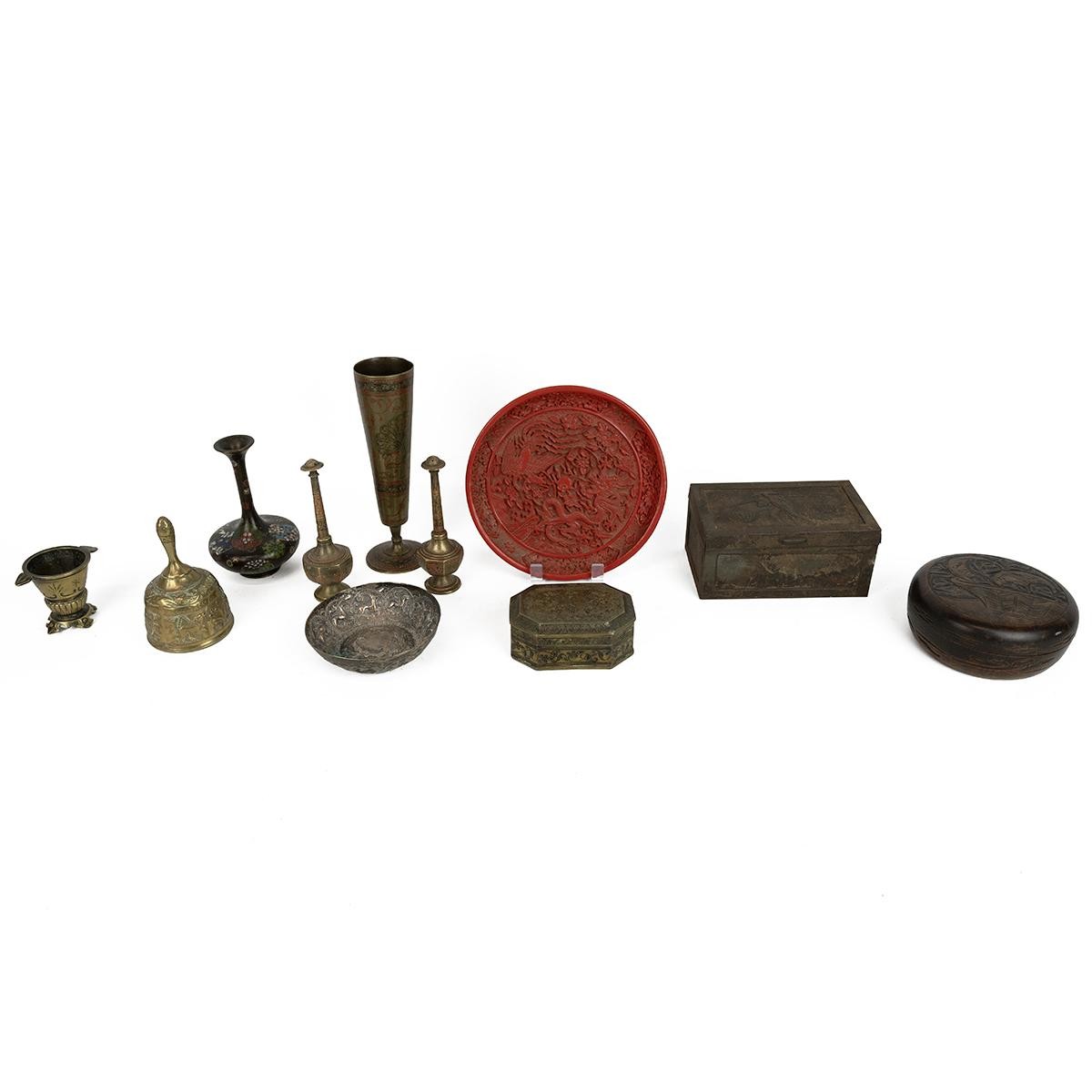 Collection of miscellaneous Oriental items to include nine metal works, one wooden vessel with cover and one red lacquer plate. (11)