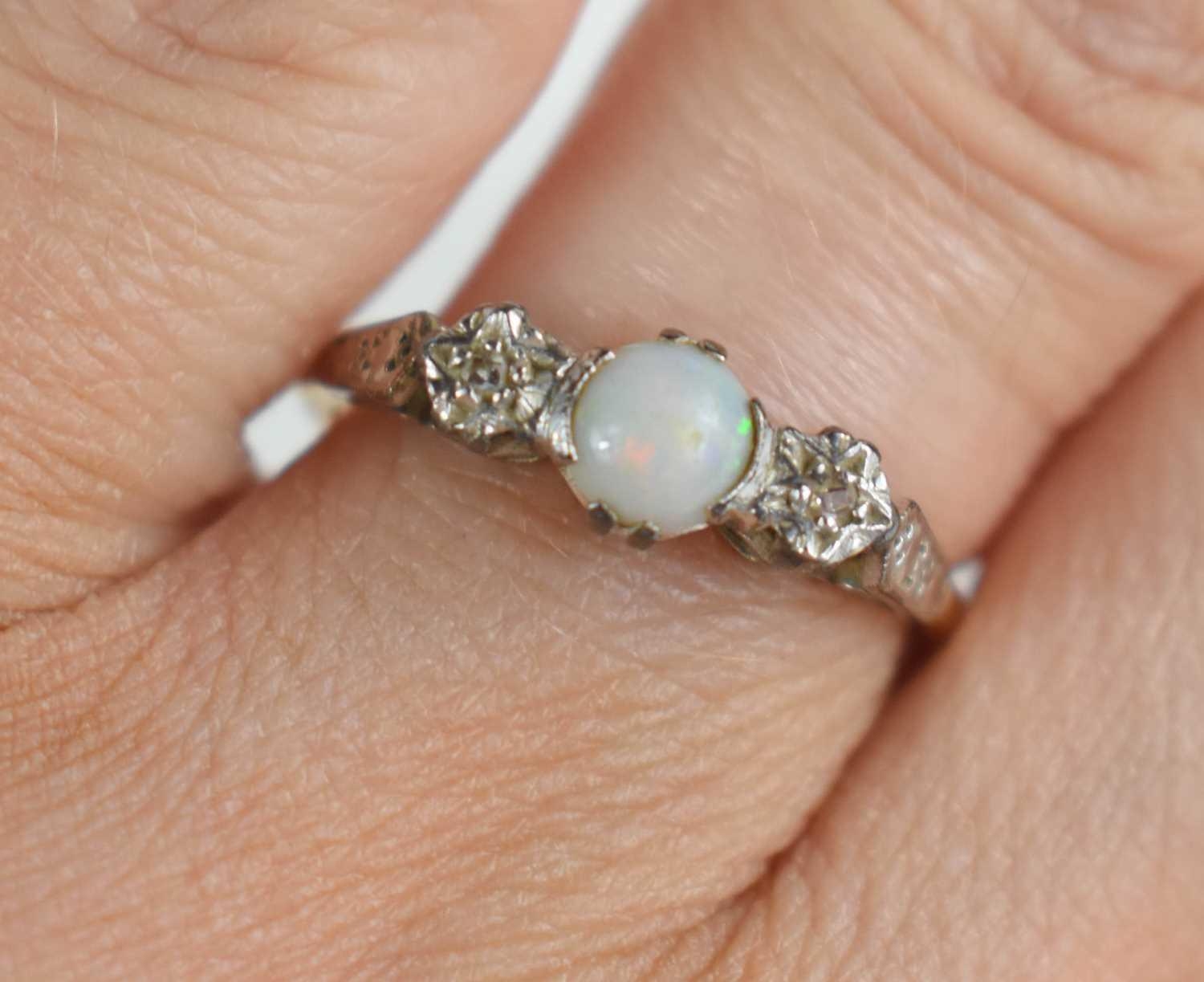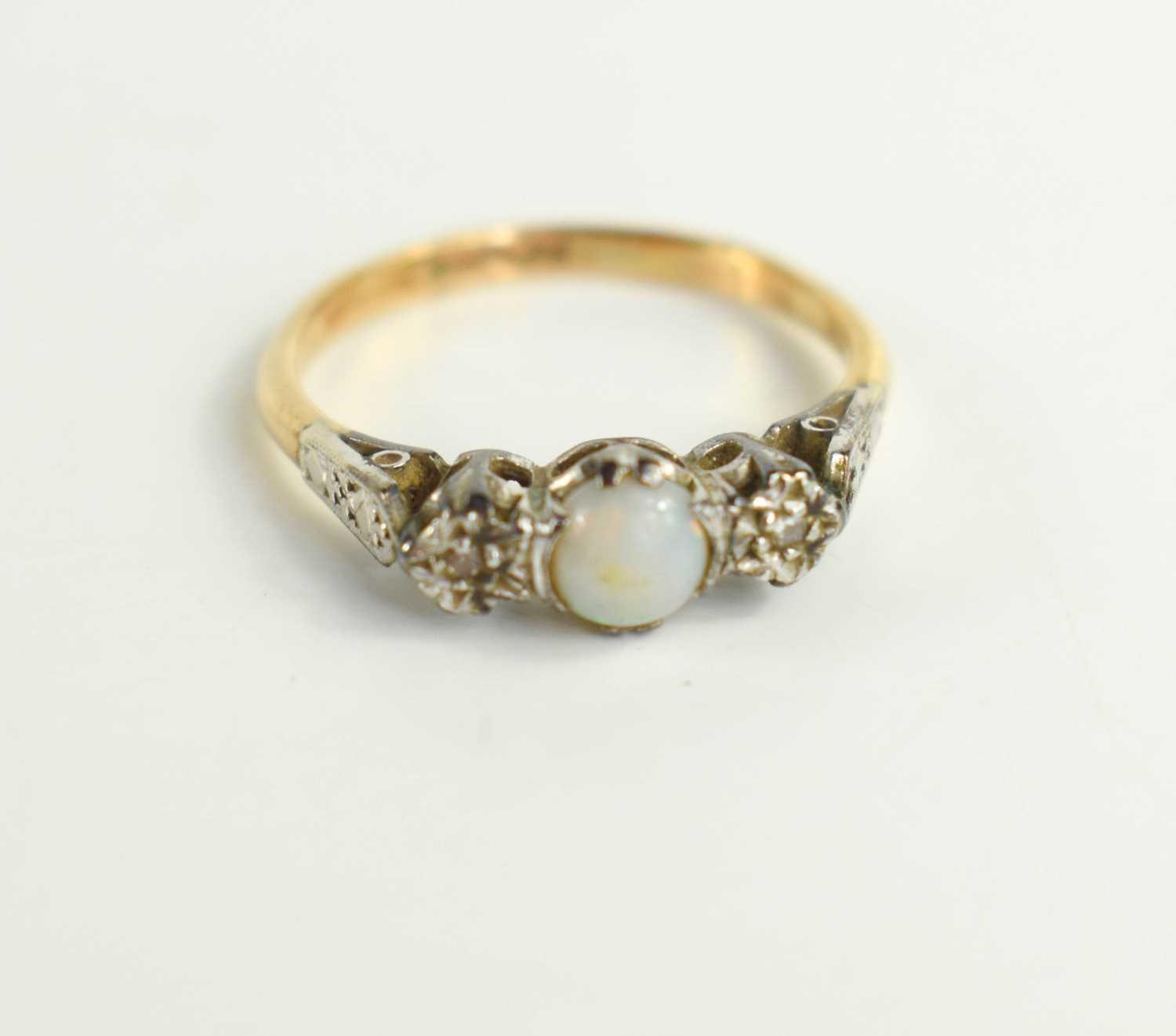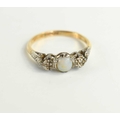 A 9ct gold and platinum dress ring set with central opal with illusion set old cut diamonds either side and a further smaller diamond to the shoulders, size O/P, 2.32g.