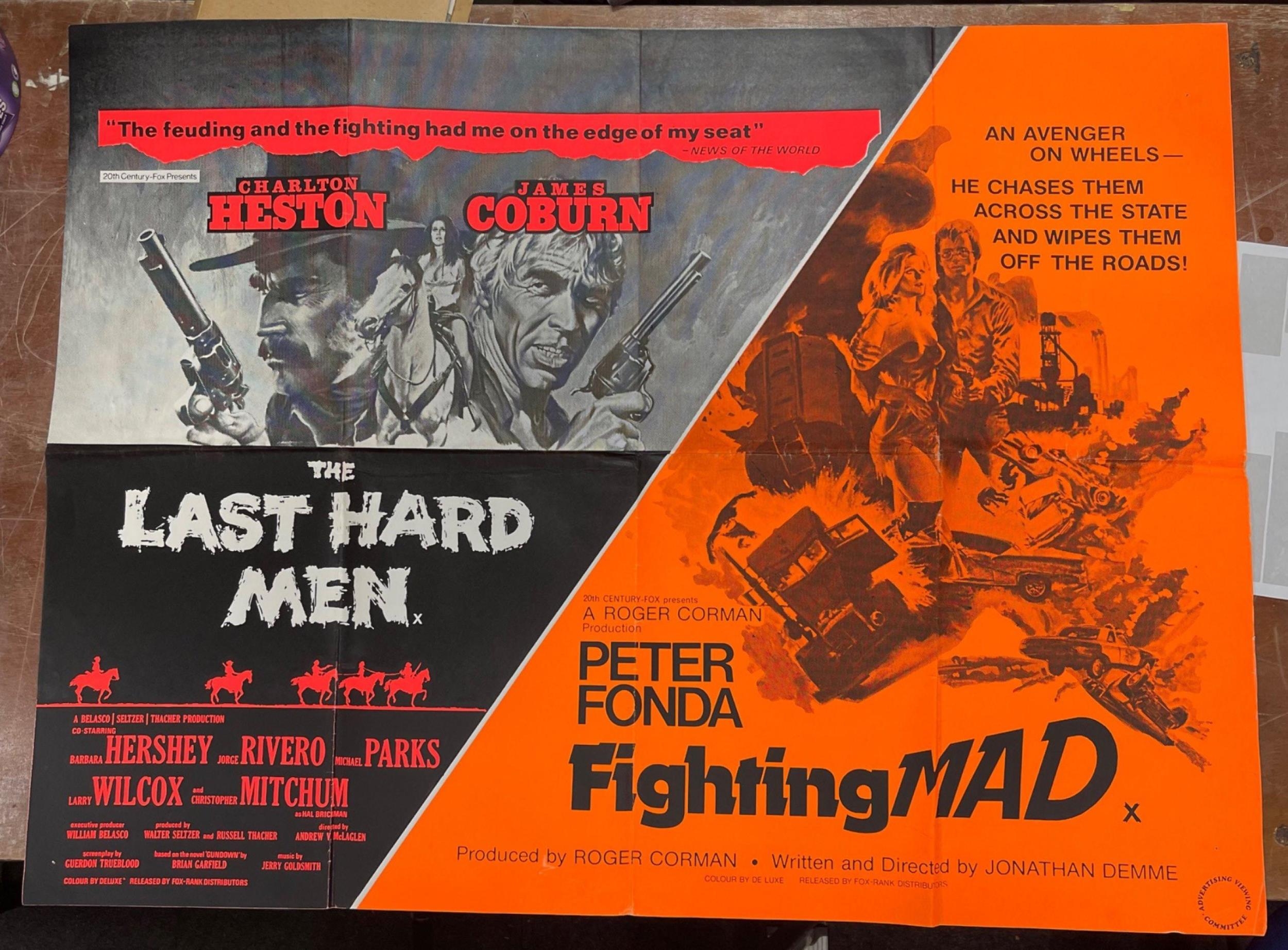 THE LAST HARD MEN Charlton Heston & James Coburn split poster with FIGHTING MAD with Peter Fonda bright orange split with grey and black -c1980's poster - movie released by Rank Distributors the usual folds - in good condition possibly cinema poster? - dimensions 40" x 30" approx
