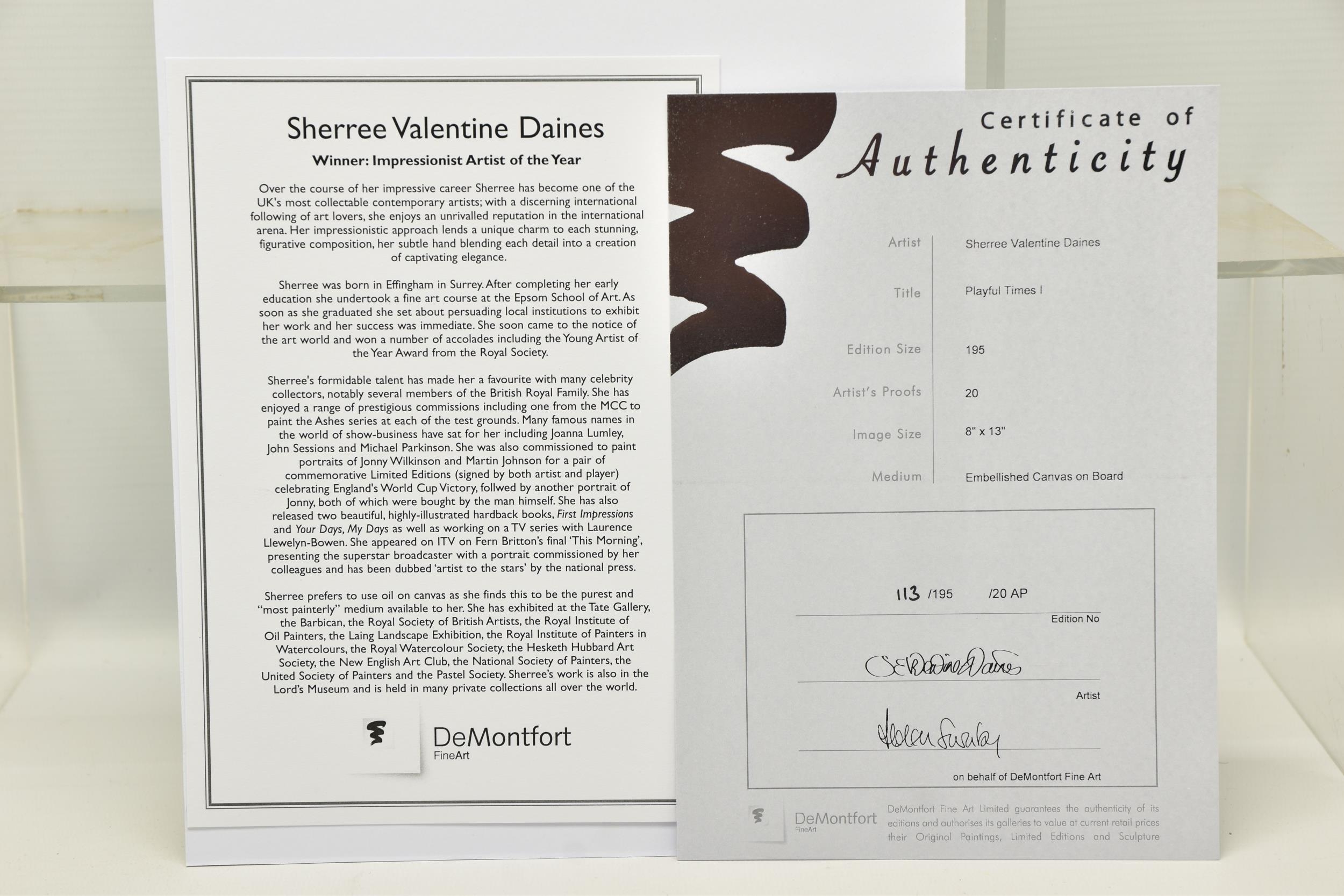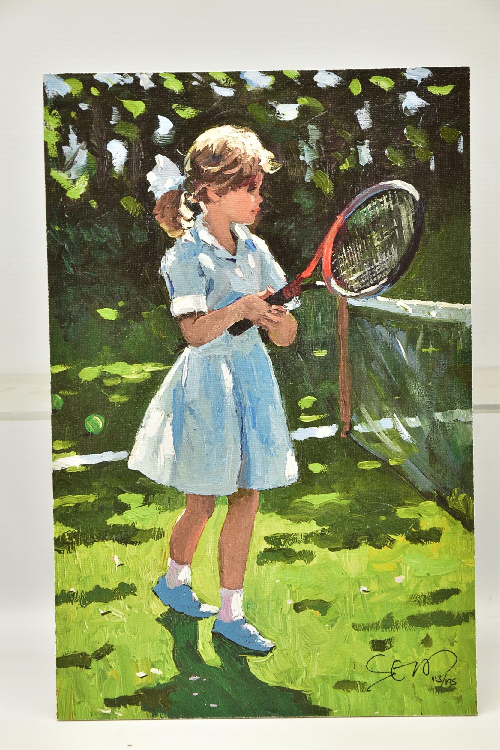SHERREE VALENTINE DAINES (BRITISH 1959) 'PLAYFUL TIMES I', a signed limited edition print depicting a young girl playing tennis, 113/195 with certificate, approximate unmounted size 33cm x 22cm, Condition: no obvious damage (artist resale rights apply)