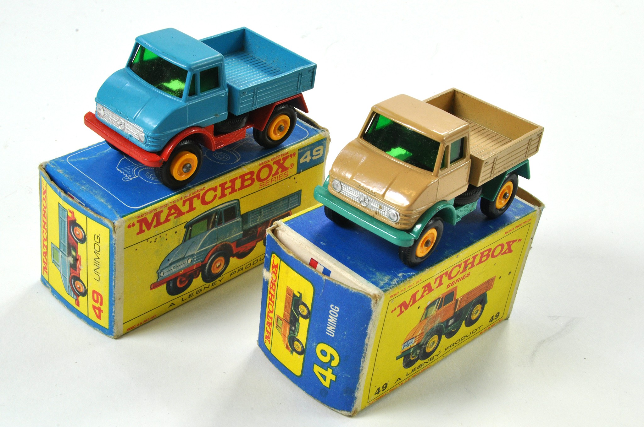 Matchbox Regular Wheels comprising No. 49 Unimog x 2. Good to very good in fair to good boxes.