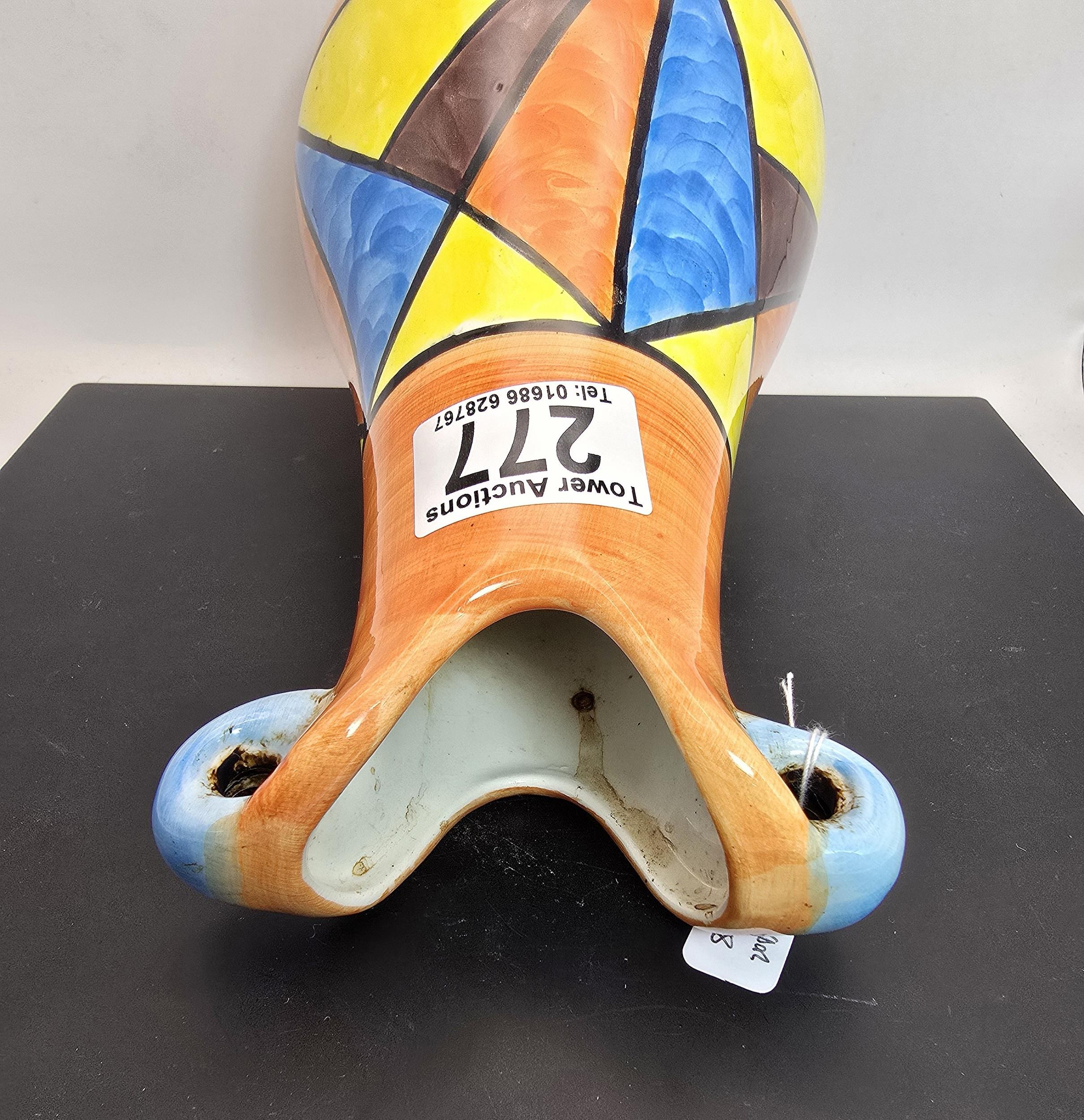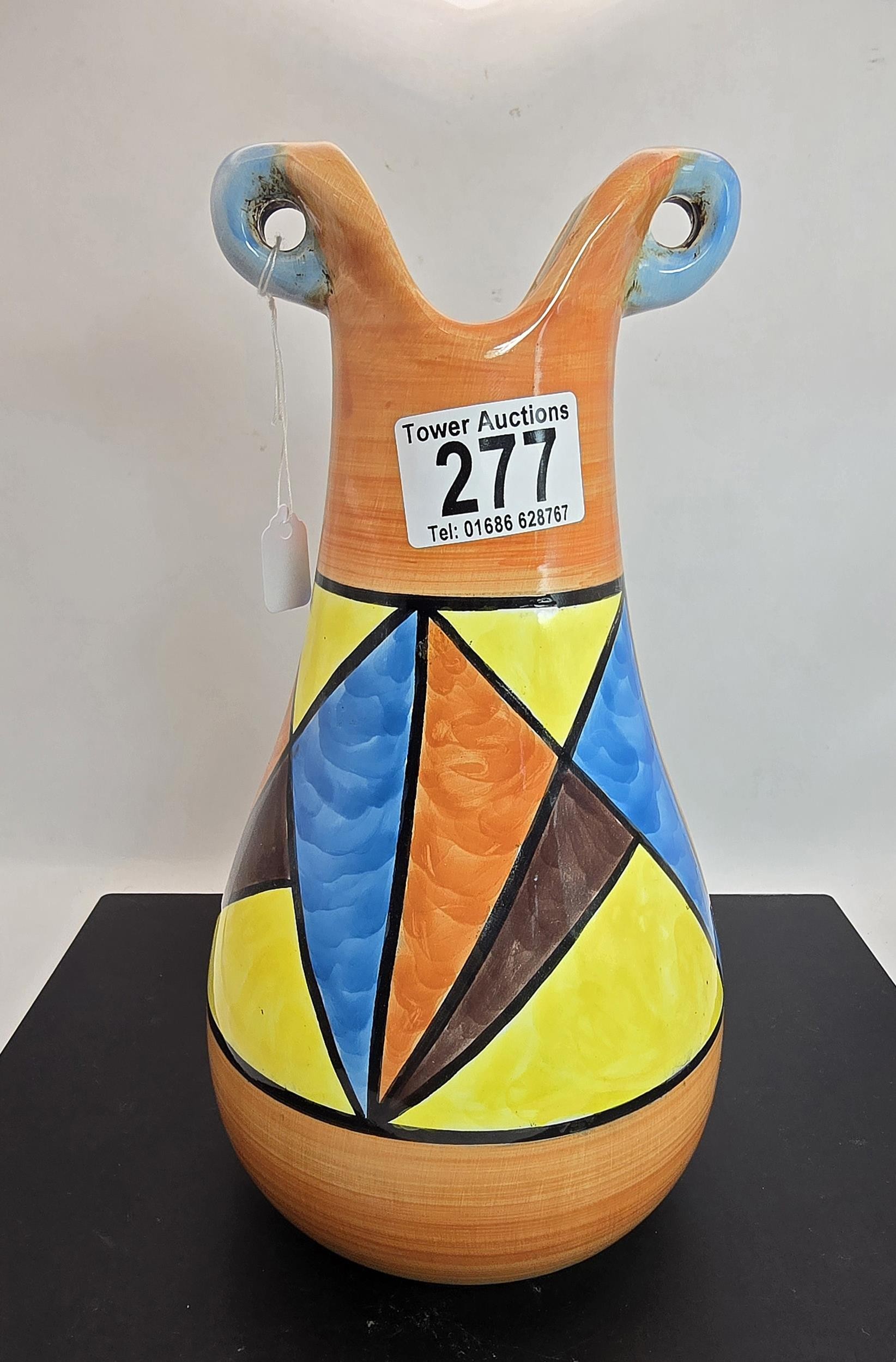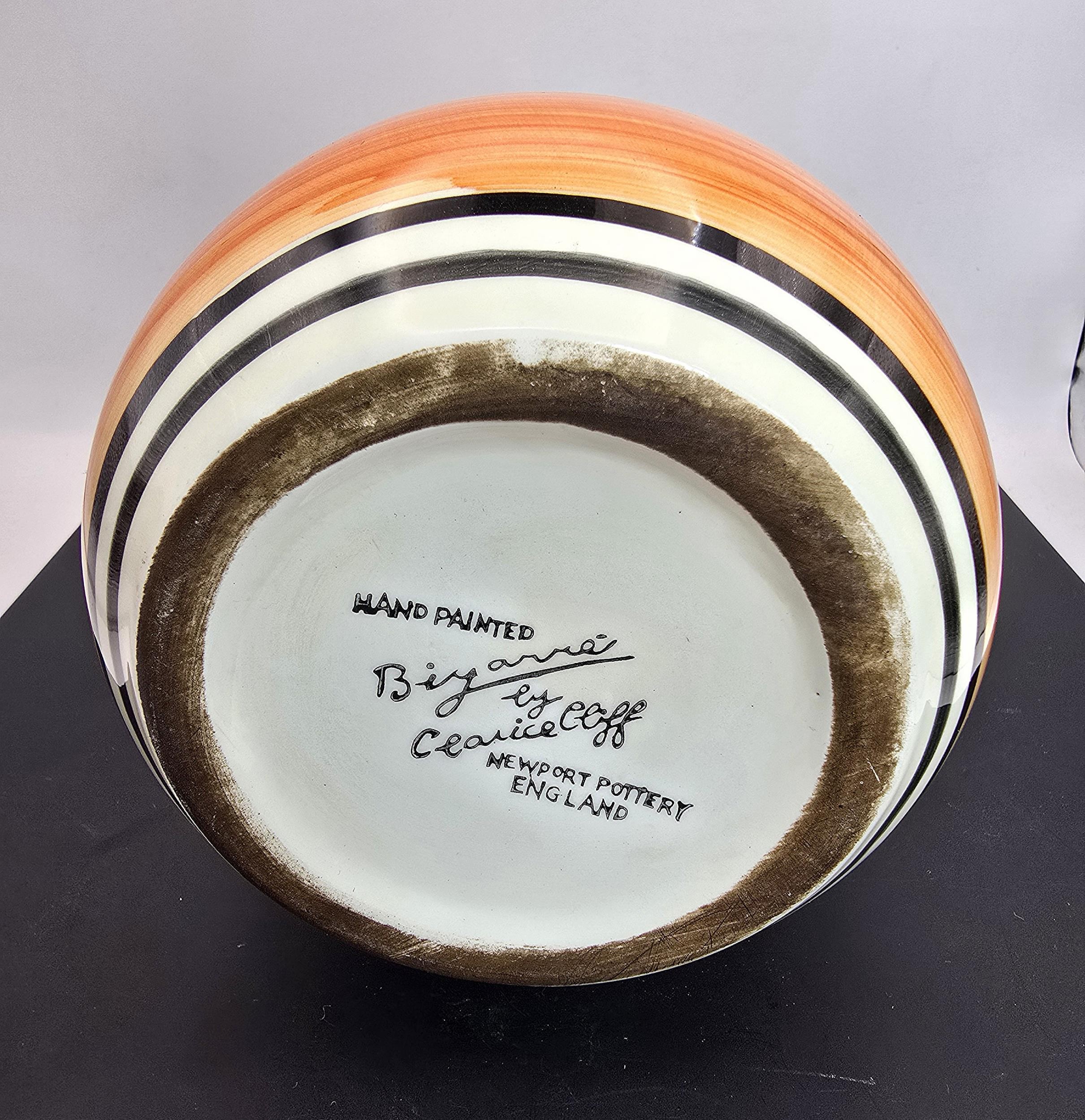 An attractive vintage vase having a vibrant geometric hand painted design, the vase displays nicely and is in good condition with no damage with no repairs, the vase is stamped, Bizarre Clarice Cliff Newport Pottery England has a height of 25cm with a diameter of 13cm.