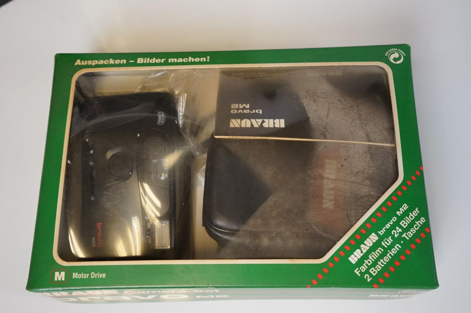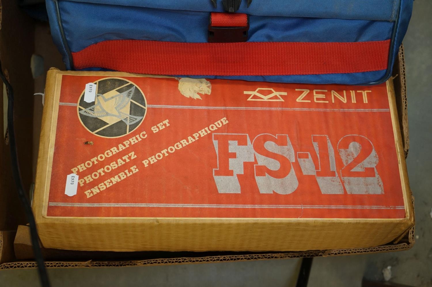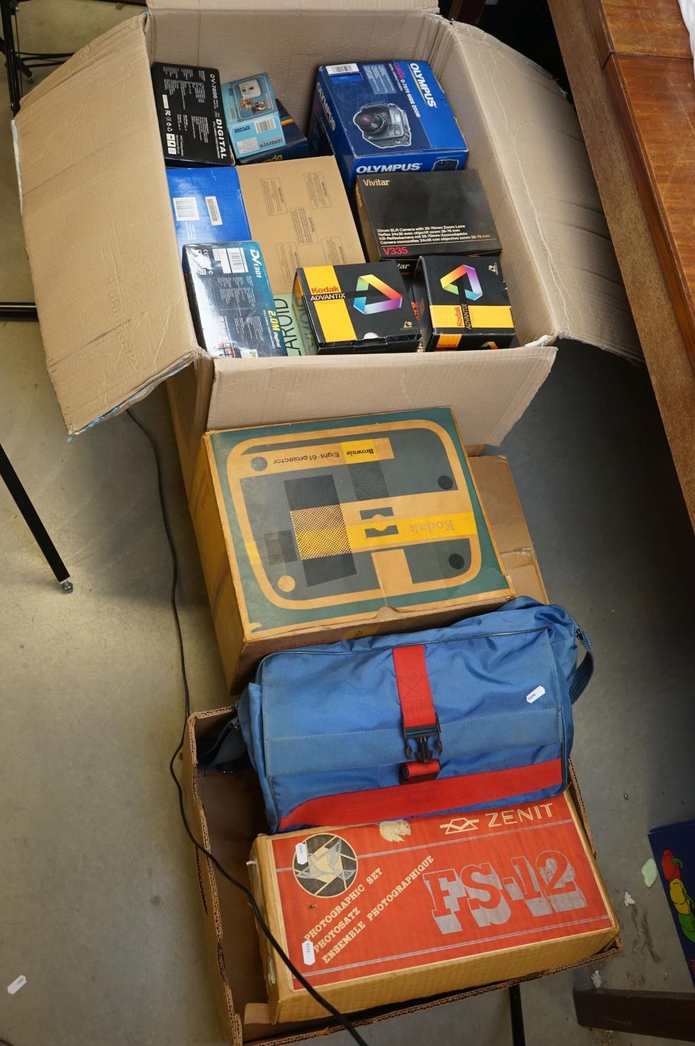 Large Collection of Cameras and Equipment including many boxed cameras, camcorders, Kodak Print Film Cool Bag, USSR Zenit 12S with lens, etc
