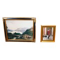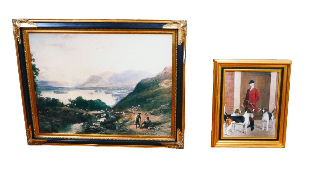 A Brookpace oleograph style print after John Collier (British, 1850-1934): Master of the Meynell Hunt, 49 by 39cm, framed, 67 by 56cm, together with another oleograph print of an Idyllic landscape, 75 by 100cm, framed, 94 by 120cm. (2)