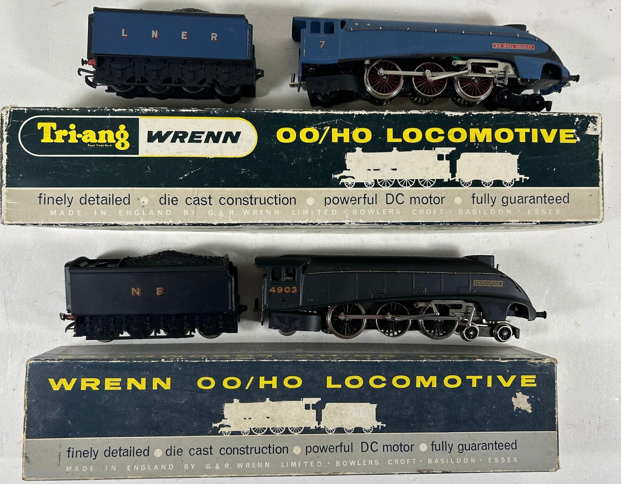 2 Wrenn Railways OO Locomotives. 2 LNER Class A4 4-6-2 tender locomotives. Peregrine 4903 in unlined black livery. Together with Sir Nigel Gresley 7 in unlined Garter blue livery. Both boxed, one associated, some age wear. Contents VGC minor wear.