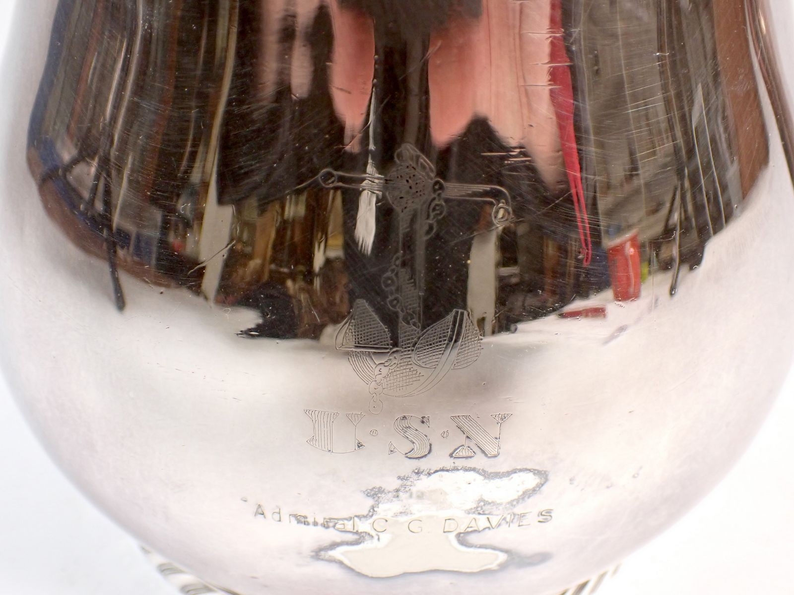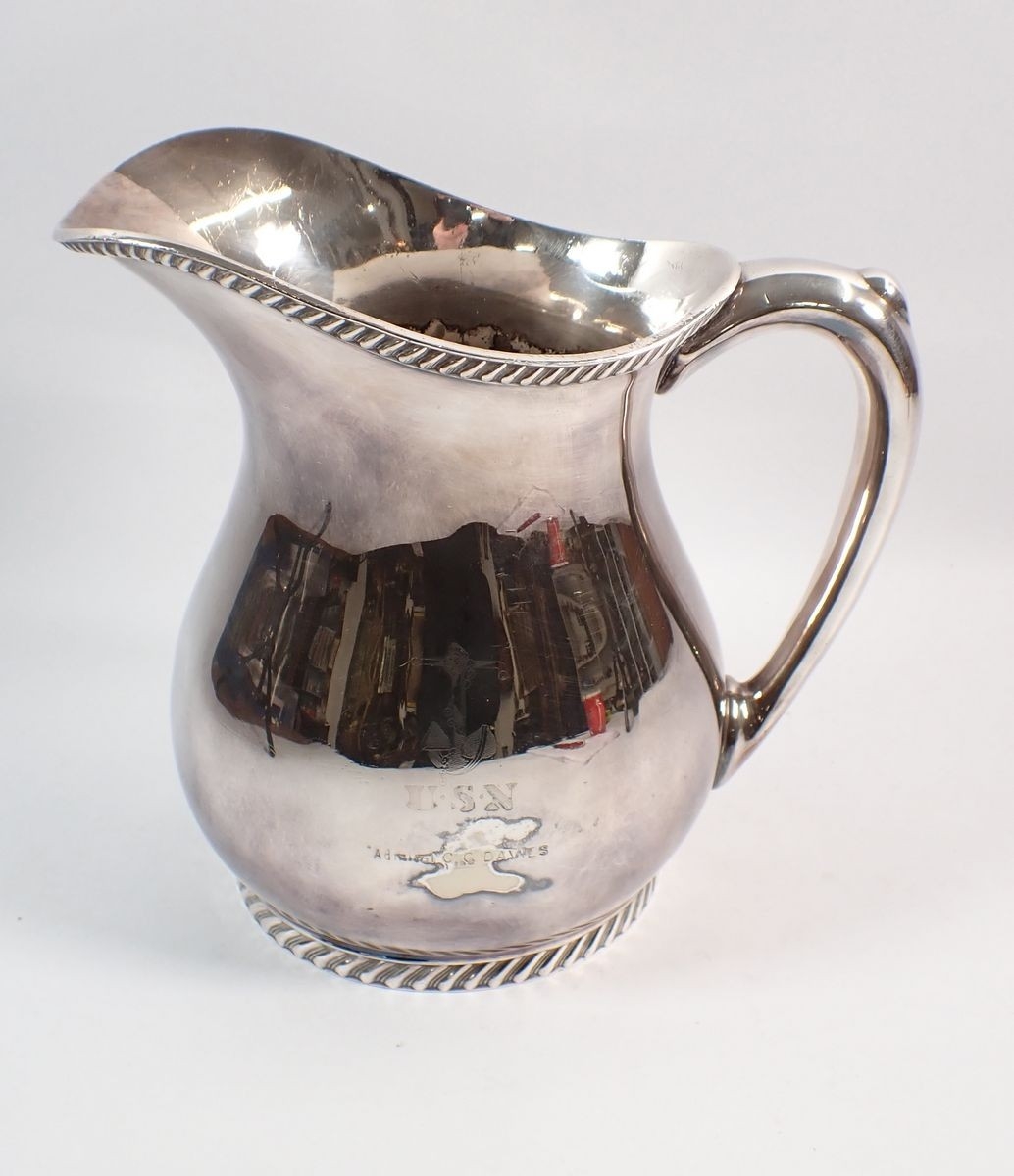 A large silver plated naval table jug embossed anchor and engraved 'Admiral C G Davies' presentation, 23cm tall