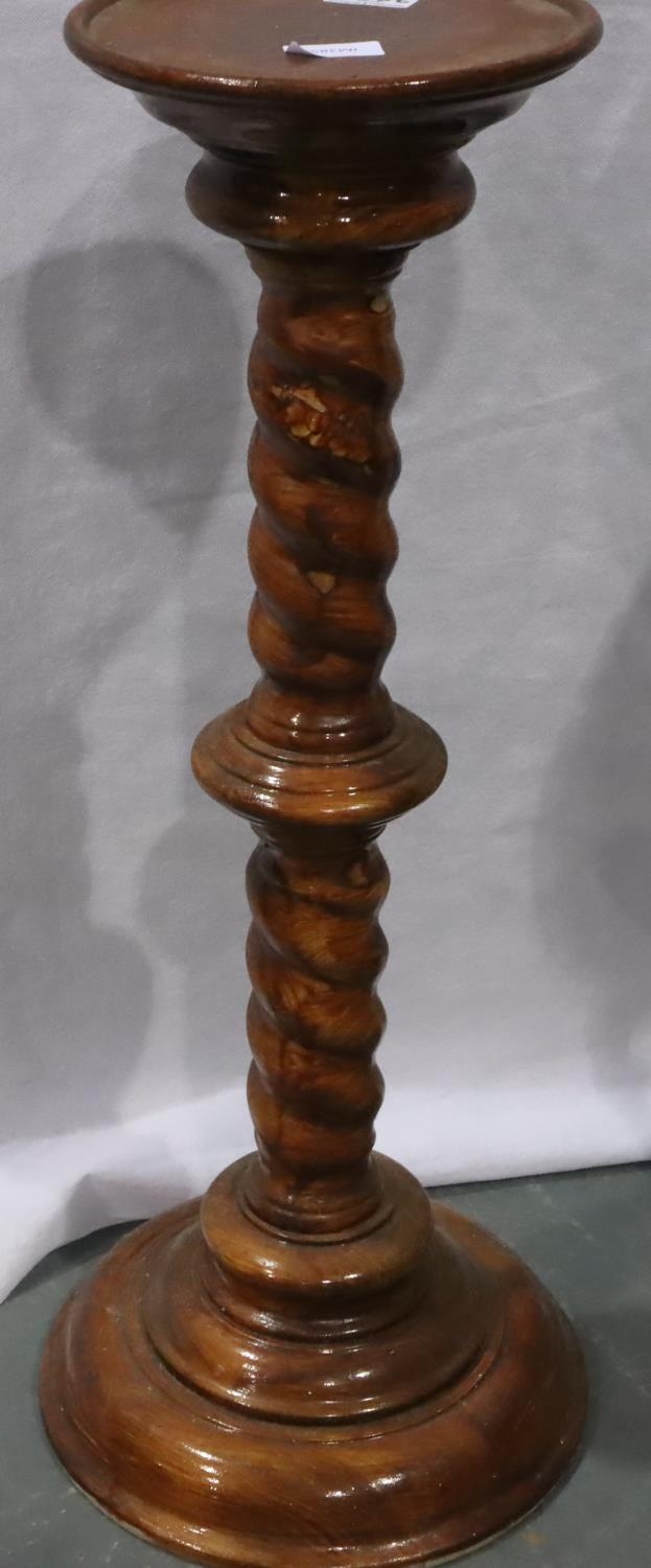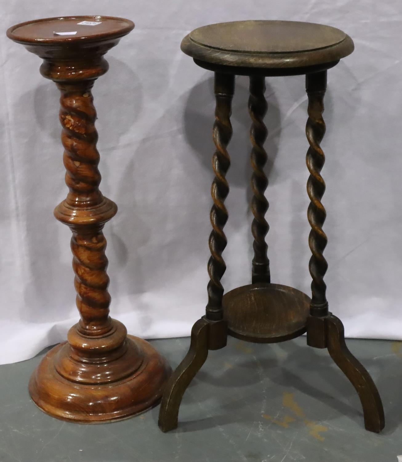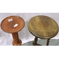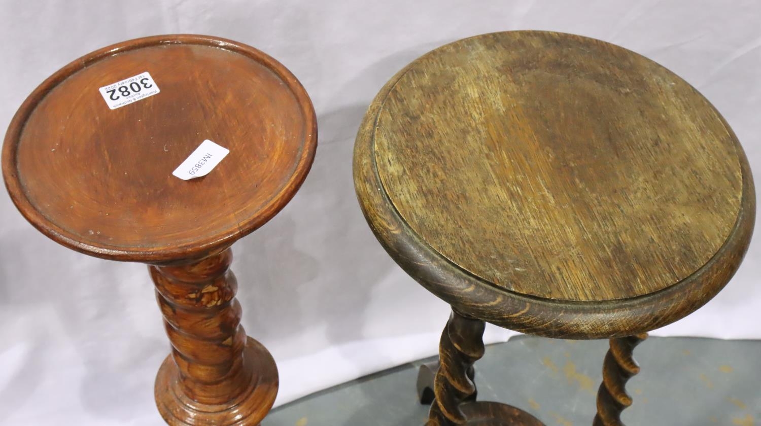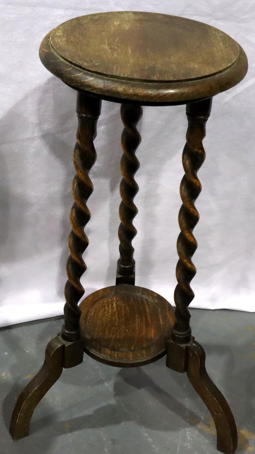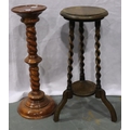 Early 20th century oak plant stand with twist supports and undershelf, together with a turned columnar pedestal, largest H: 71 cm. Not available for in-house P&P, contact Paul O'Hea at Mailboxes on 01925 659133