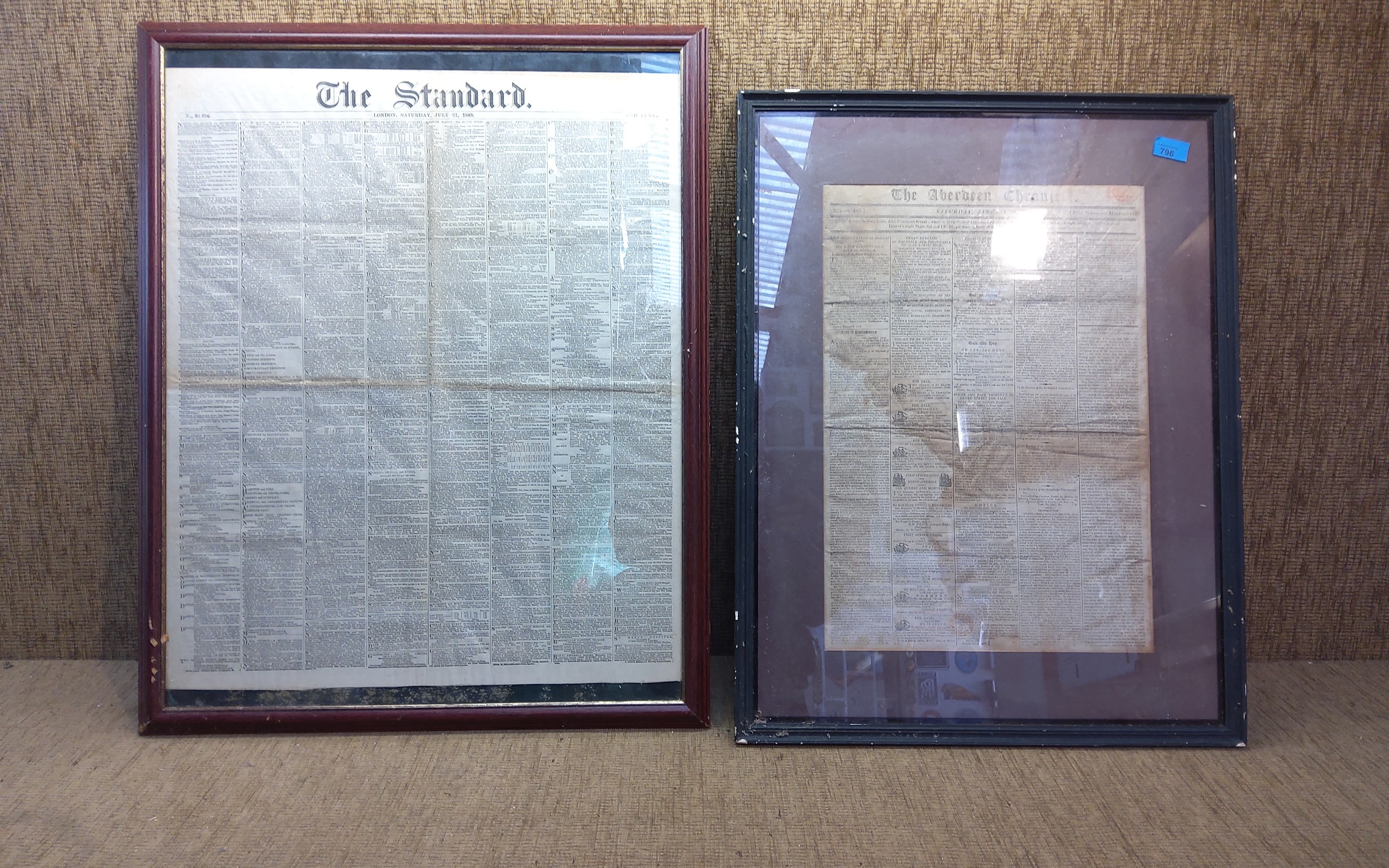 Two Antique framed Newspaper extracts one from The London Standard 1889 and one from The Aberdeen Chronicle 1816.