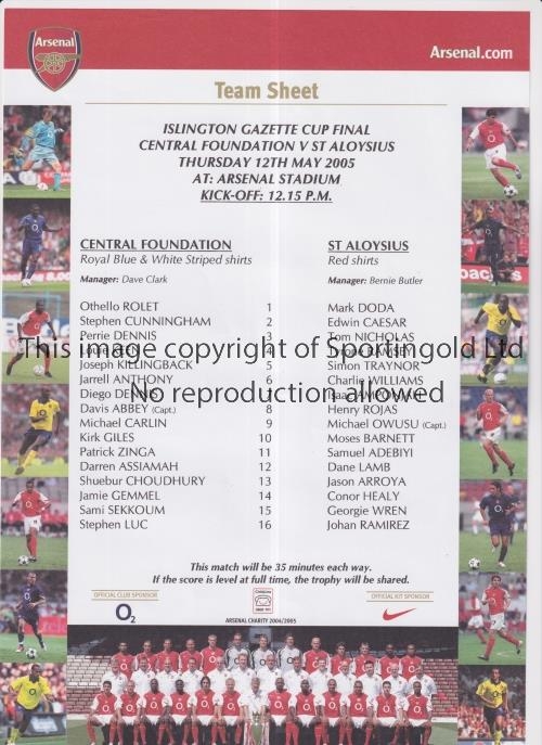 AT ARSENAL / ISLINGTON GAZETTE CUP FINAL 2005 Single sheet programme for Central Foundation v St. Aloysius 12/5/2005. Good