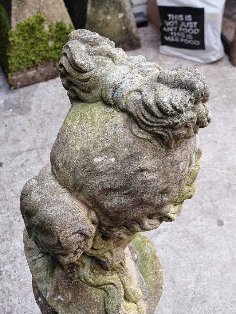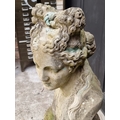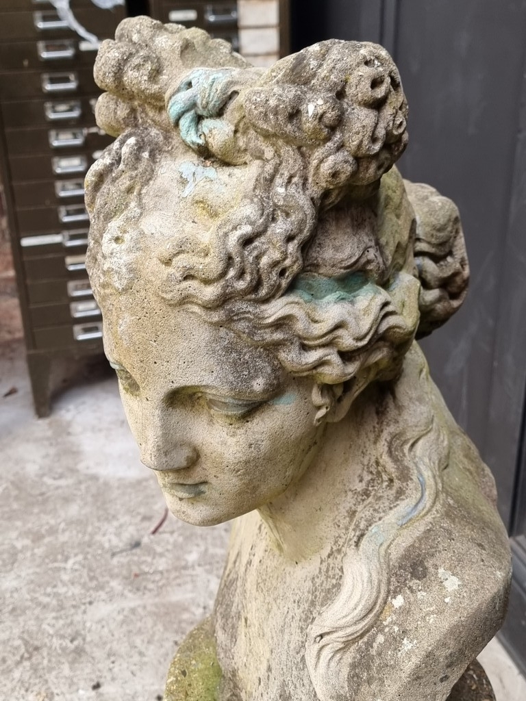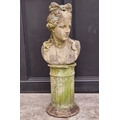 A life-sized composition stone female bust, on associated pedestal, 102.5cm high.