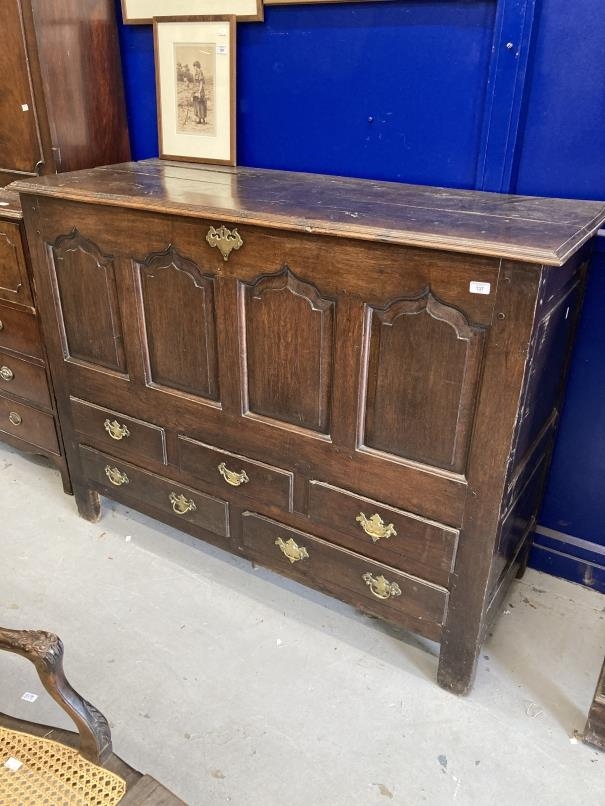 18th cent. Oak peg jointed mule chest, lift up top and three short and two long drawers. 59ins. x 46ins. x 23ins.