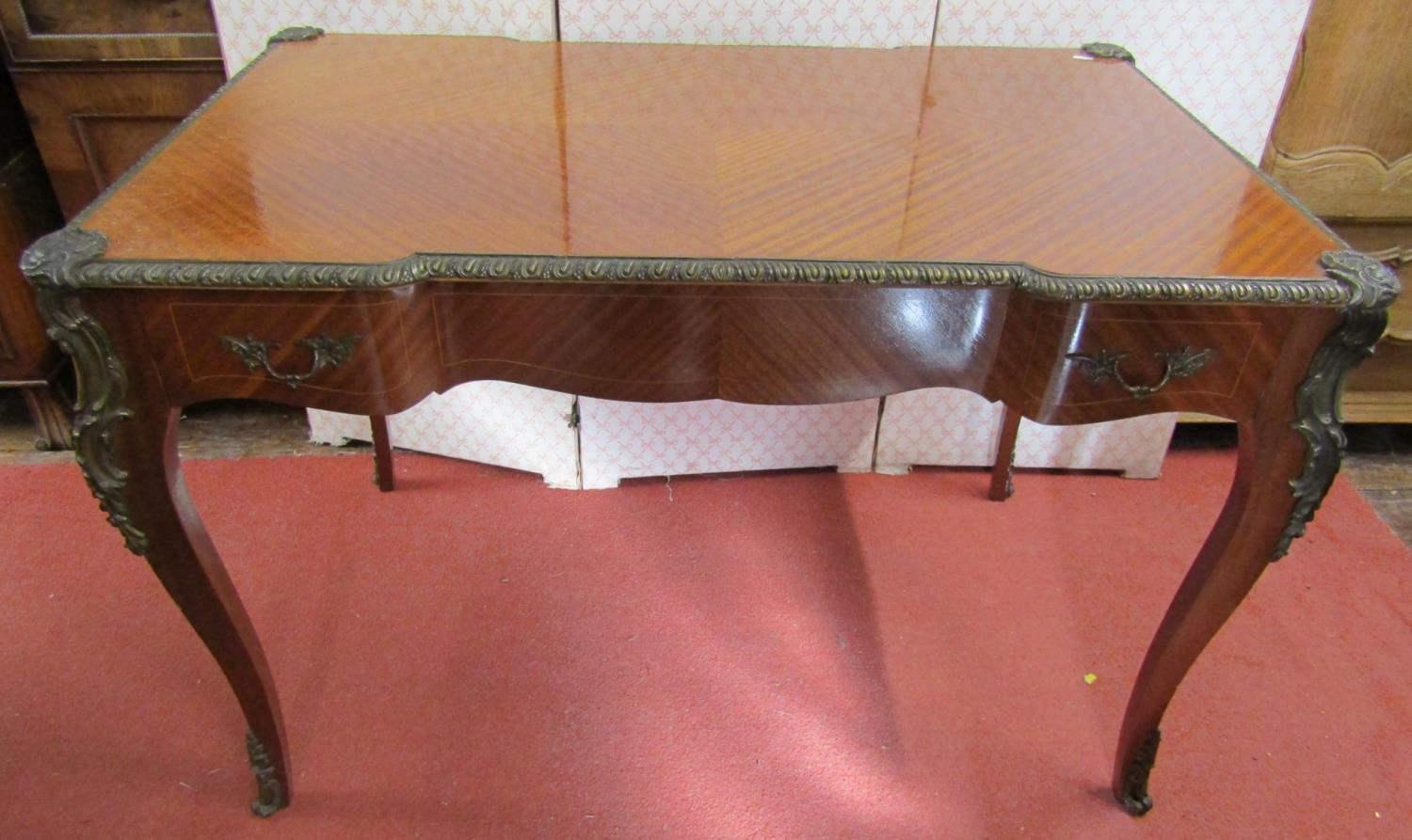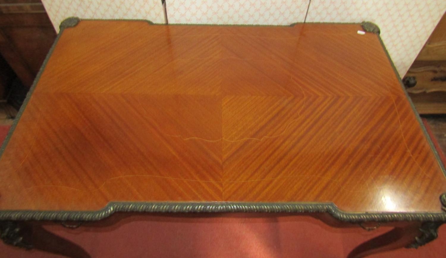 A good quality reproduction French writing desk with quarter panelled top over a single frieze drawer, raised on four shaped supports with applied cast brass fittings, 110cm wide