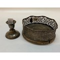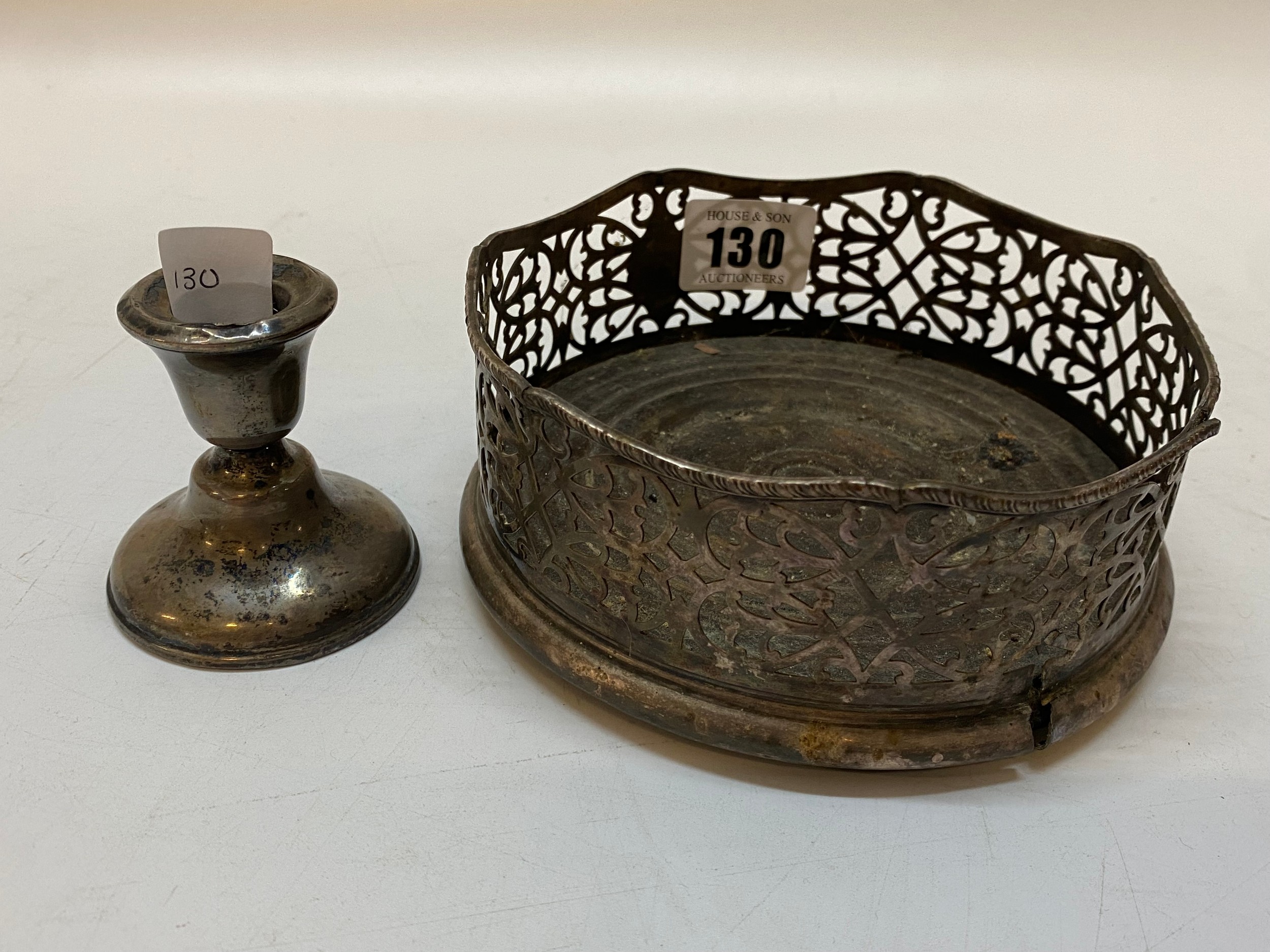 A silver coloured metal bottle coaster with saw pierced decoration and a silver desk candlestick