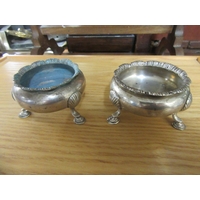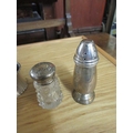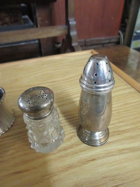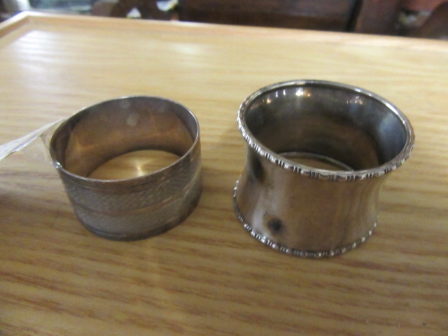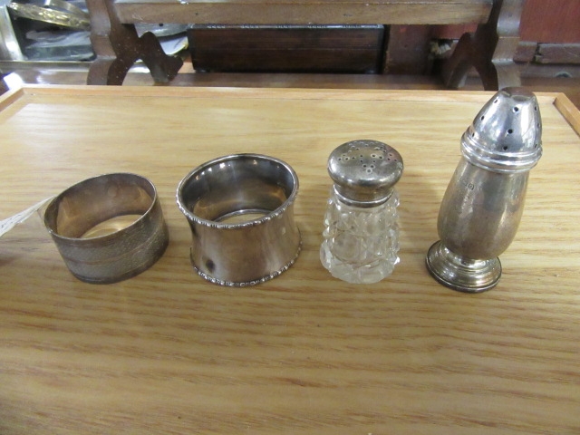 TWO SILVER NAPKIN RINGS AND A PEPPERETTE 1OZ 19DWT PLUS GLASS PEPPERETTE