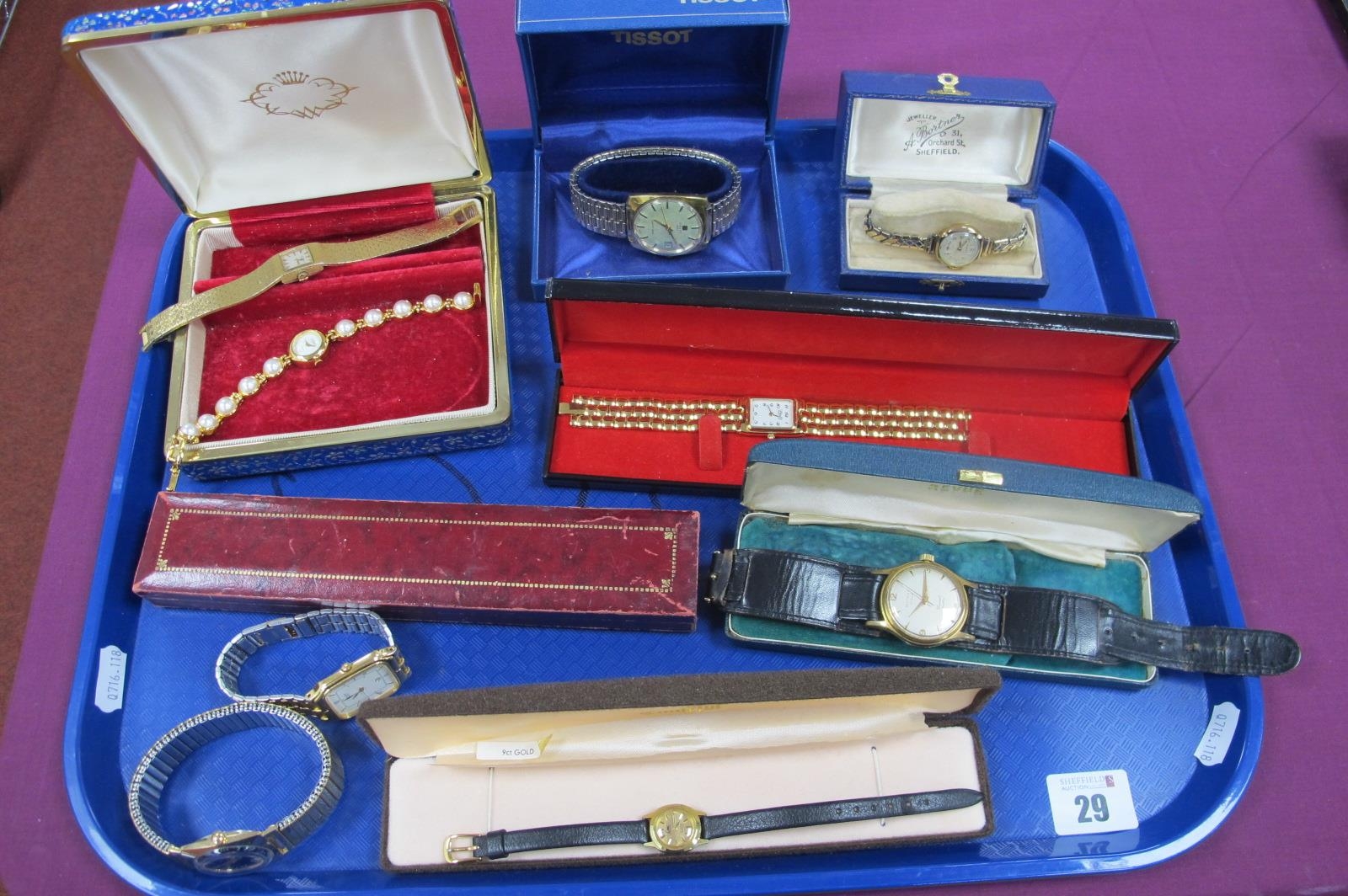 Assorted Ladies and Gent's Wristwatches, including a 9ct gold cased ladies wristwatch, on expanding bracelet, Tissot, Rotary, Timex, Limit, etc :- One Tray