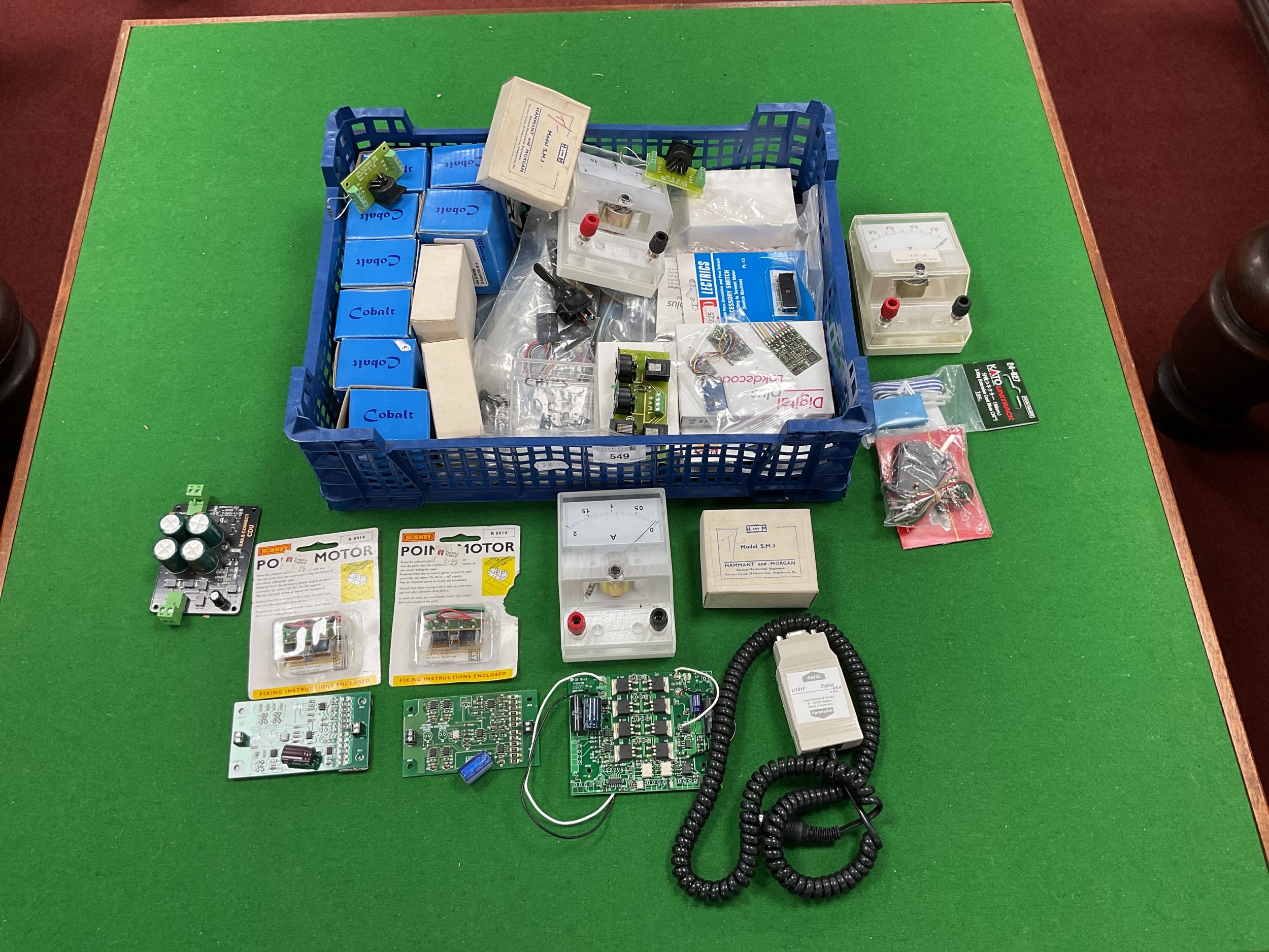 A quantity of model railway electrical and electronic control equipment including eight boxed Cobalt point motors, digital decoders and circuit boards, all untested.