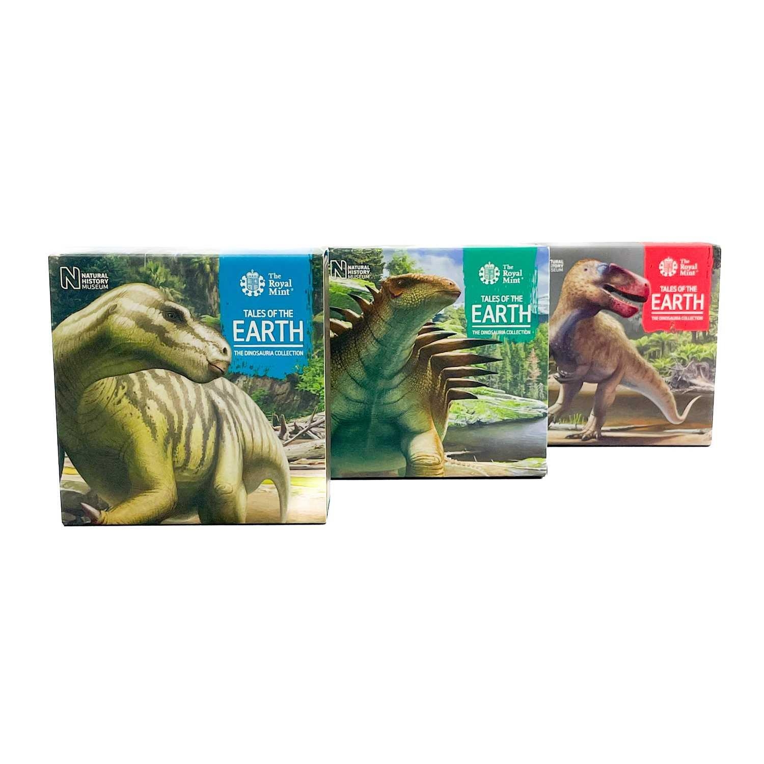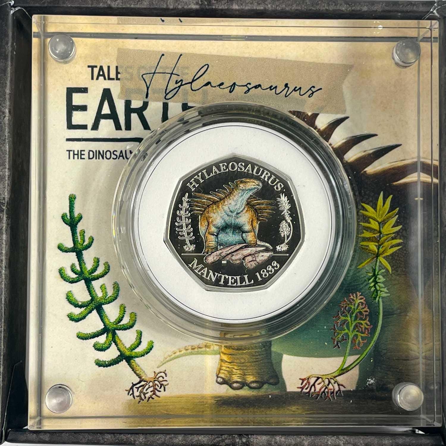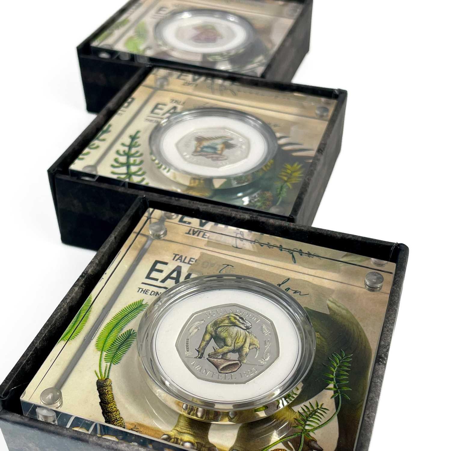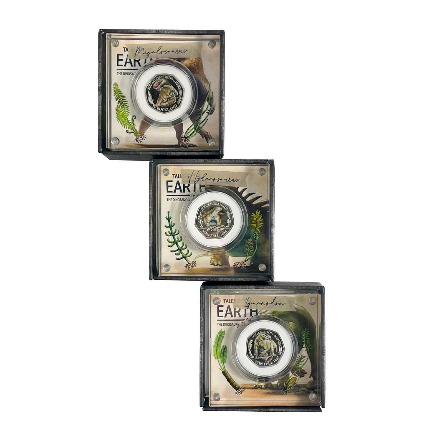 UK 2020 50 pence colourised silver proof Dinosaurs "Tales of the Earth" in Royal Mint packages (x3) Comprising 3 different colourised silver proof and encapsulated coins in perspex display stands.