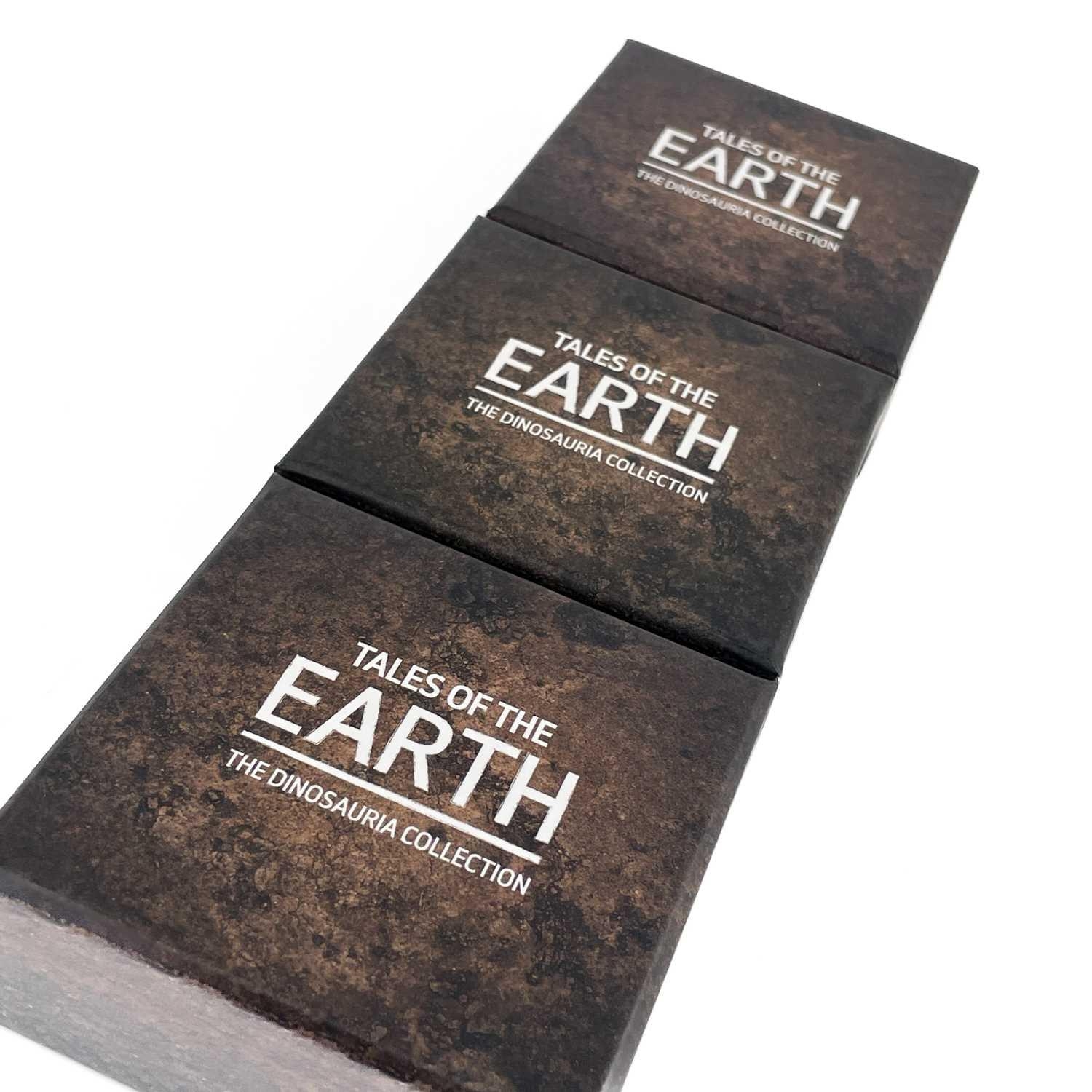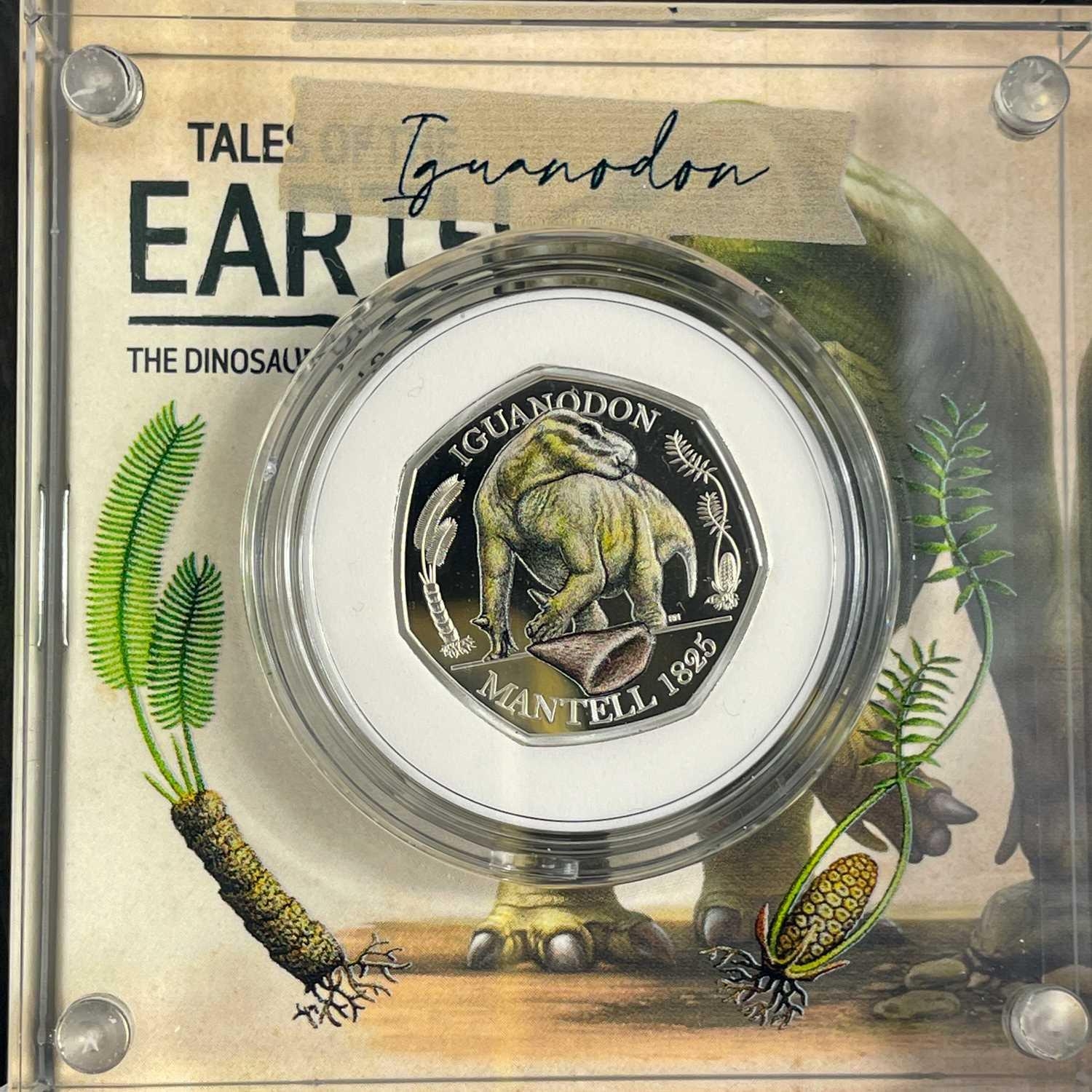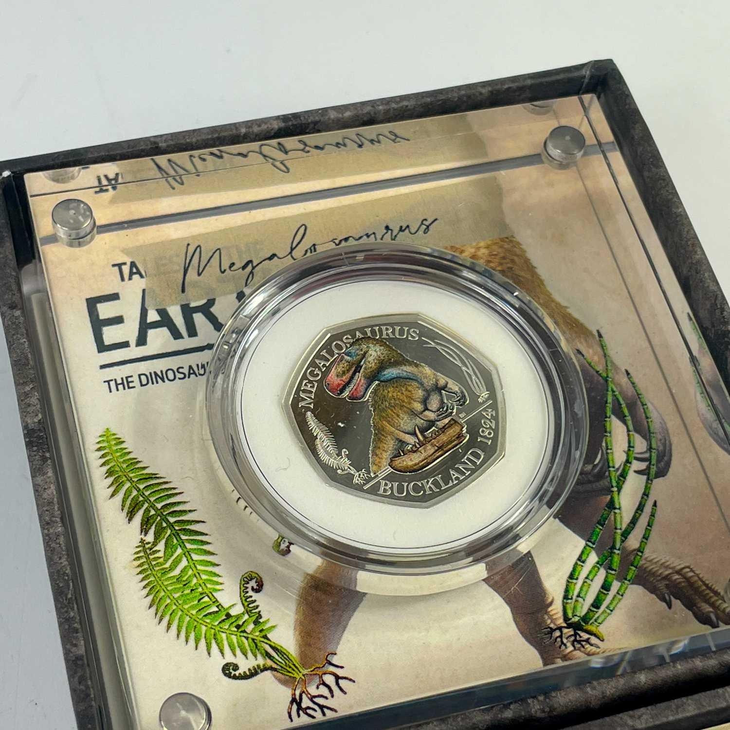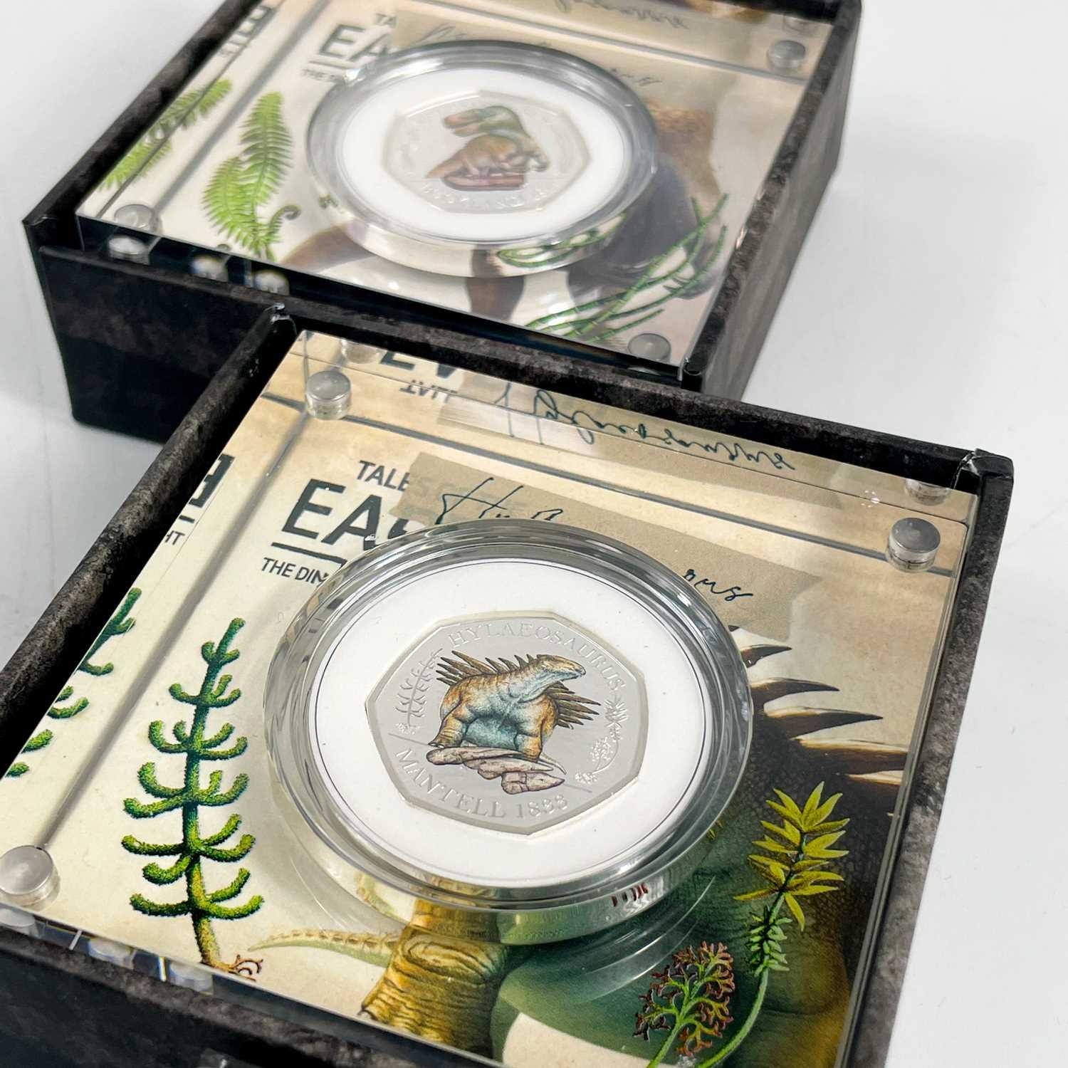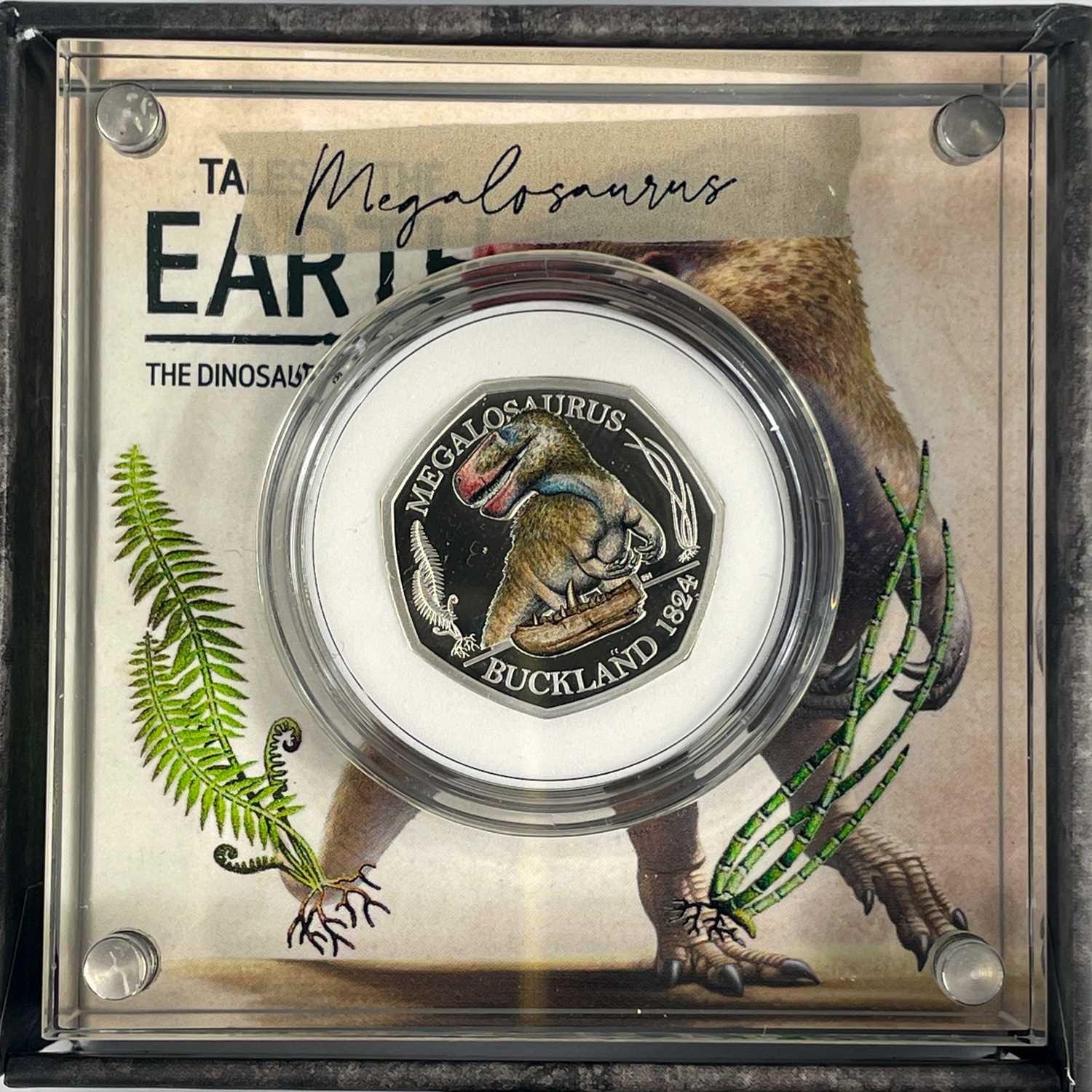 UK 2020 50 pence colourised silver proof Dinosaurs "Tales of the Earth" in Royal Mint packages (x3) Comprising 3 different colourised silver proof and encapsulated coins in perspex display stands.