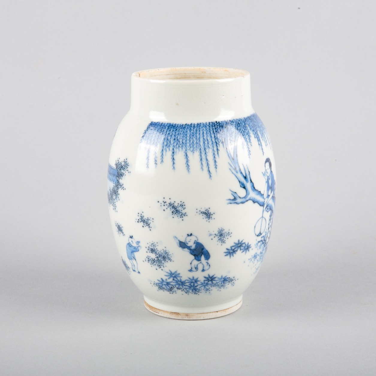probably Transitional period, with bands of anhua decoration to the rim and towards the foot, the body decorated with boys playing in a garden landscape and a woman looking on, 17cm high