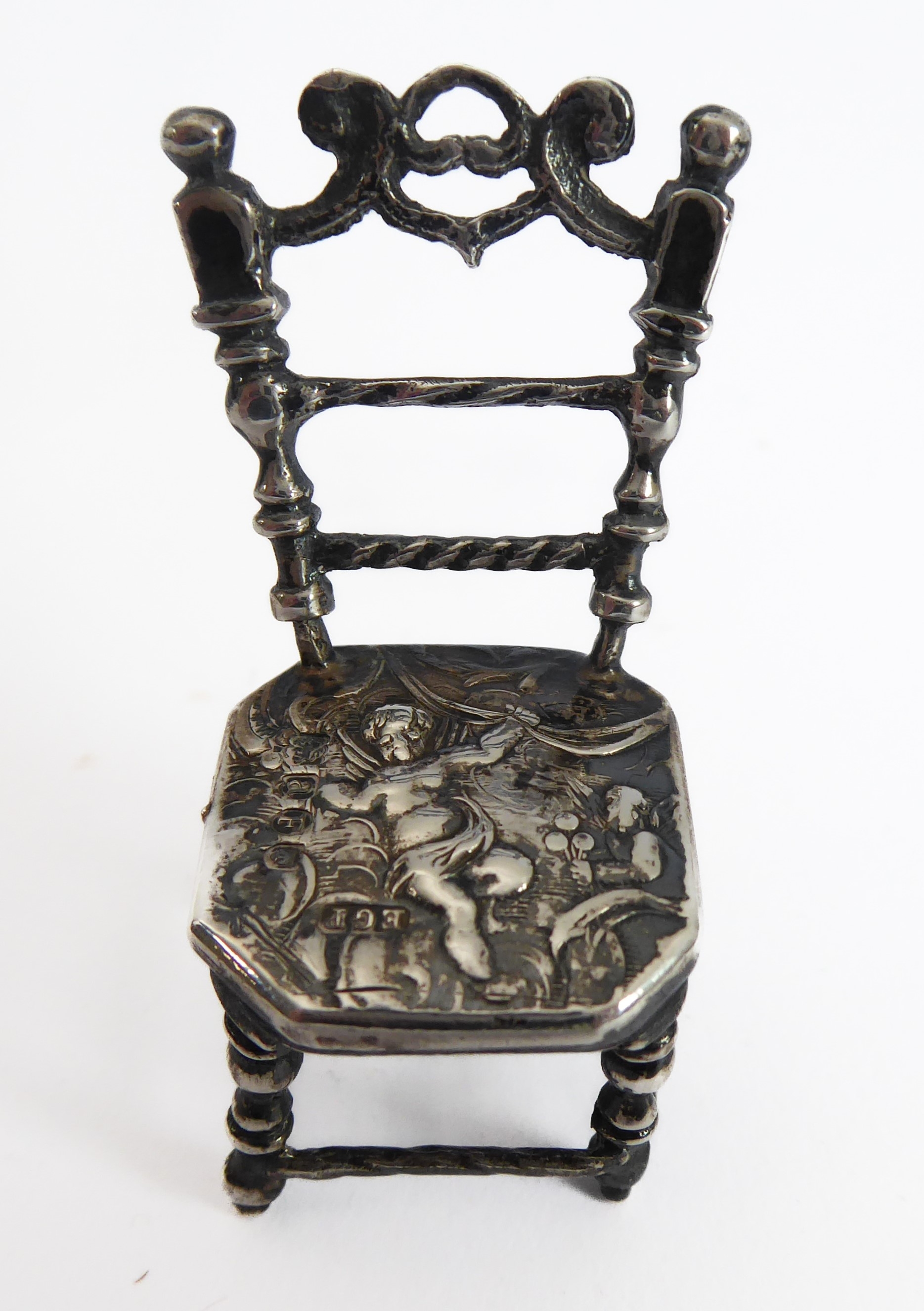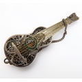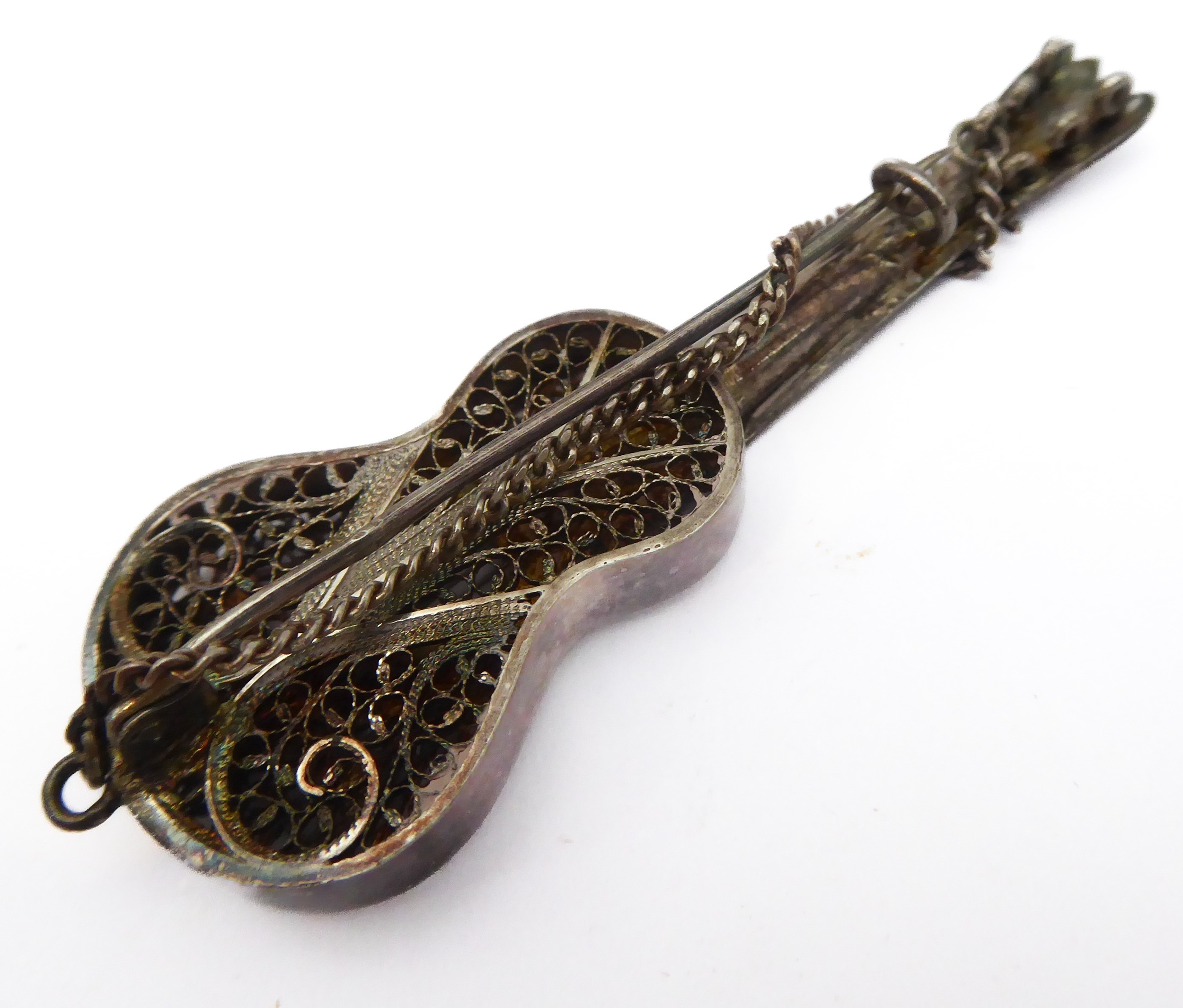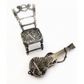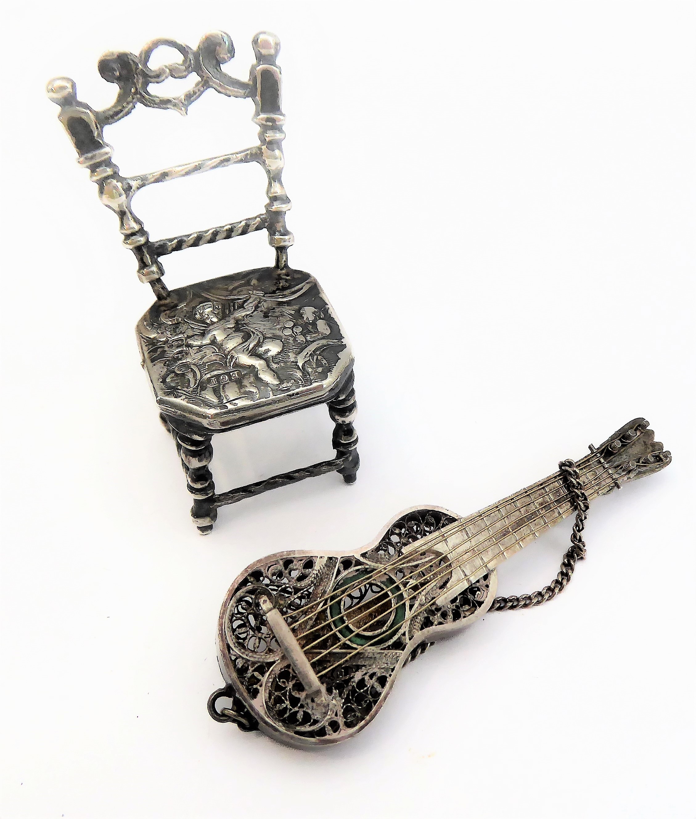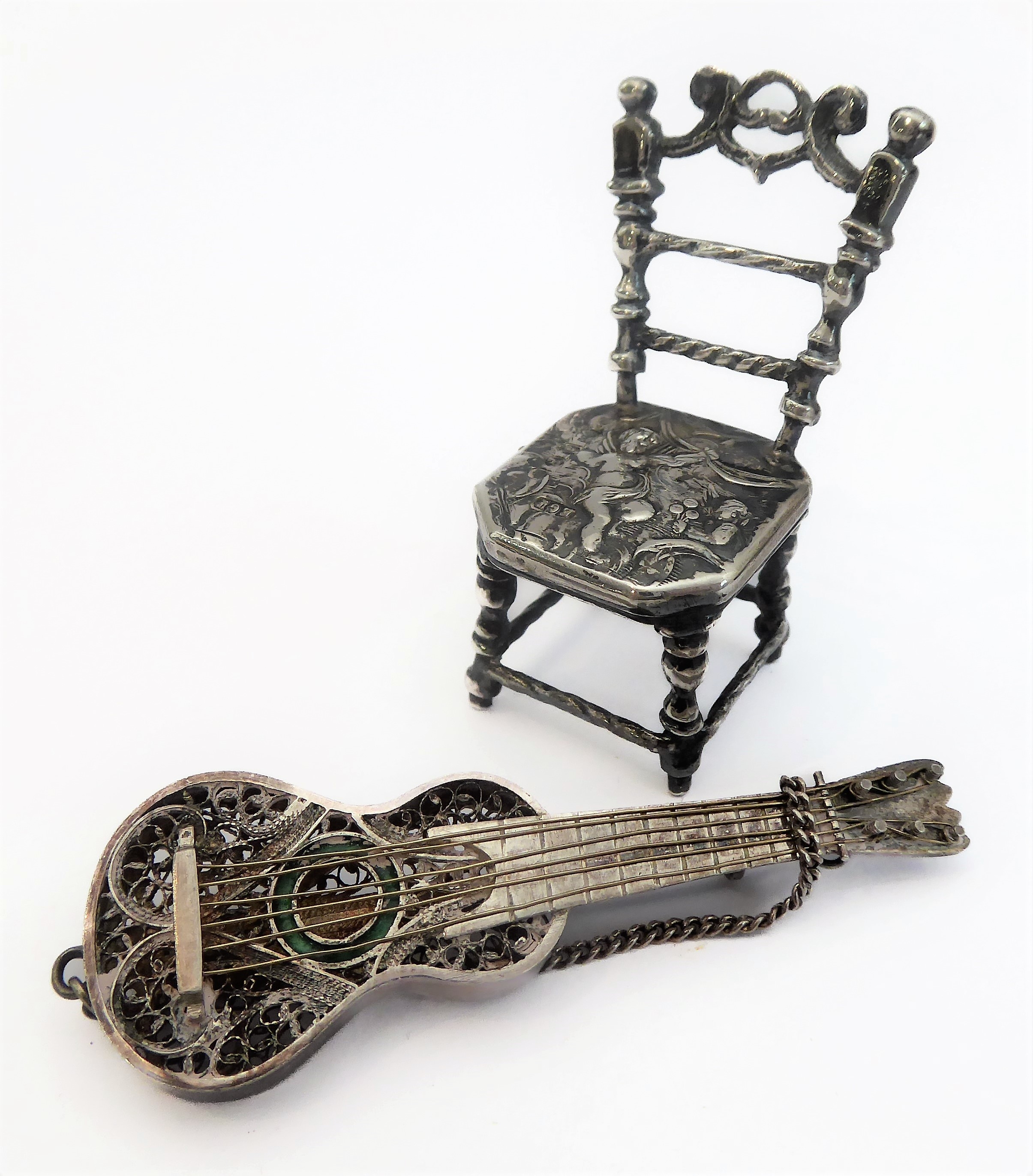 A novelty miniature hallmarked-silver chairs (probably Dutch): the seat decorated repoussé style with cherubic figures (with English import marks), together with a white metal filigree style brooch modelled as a Spanish classical acoustic guitar (2)