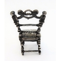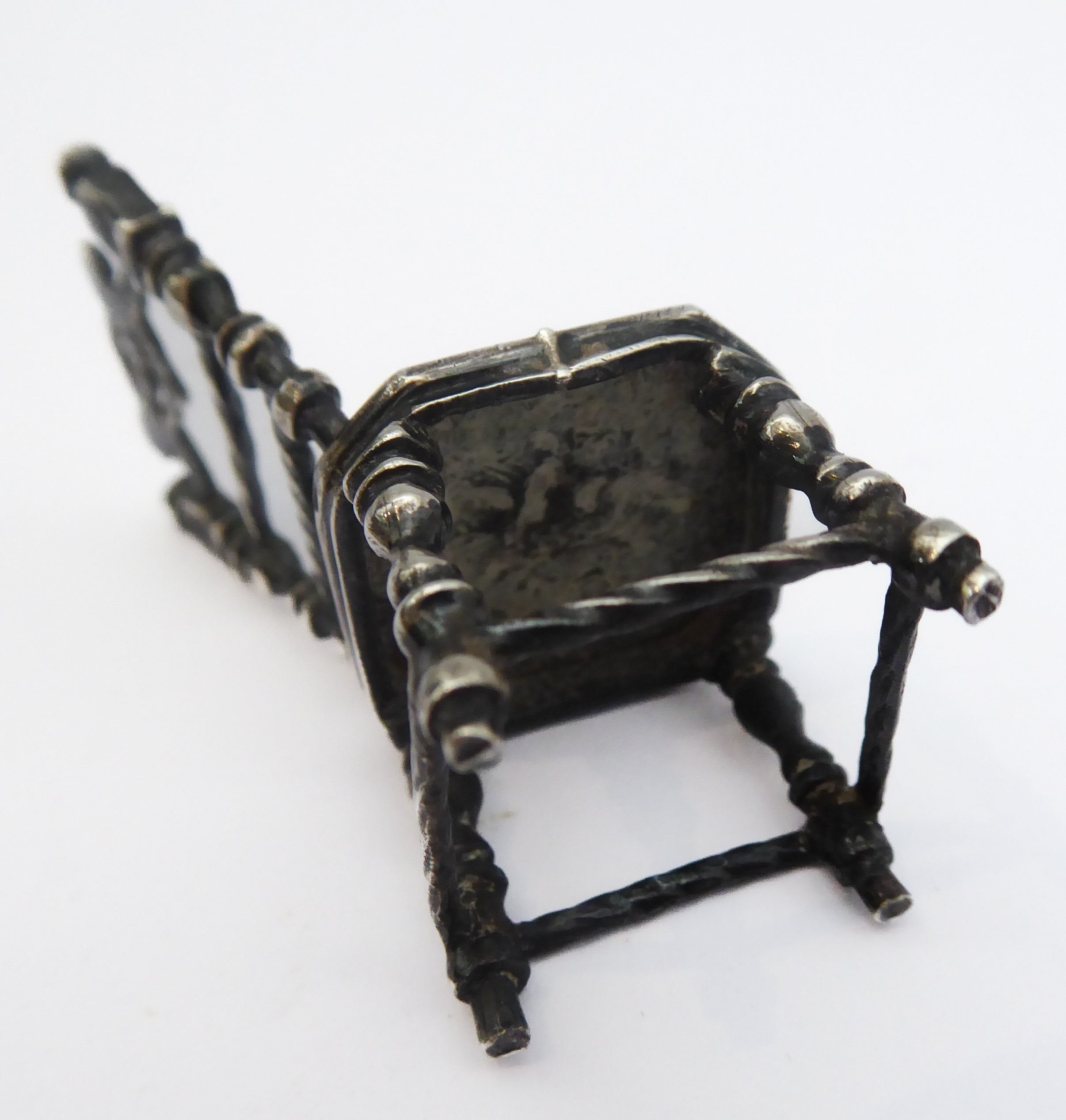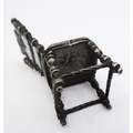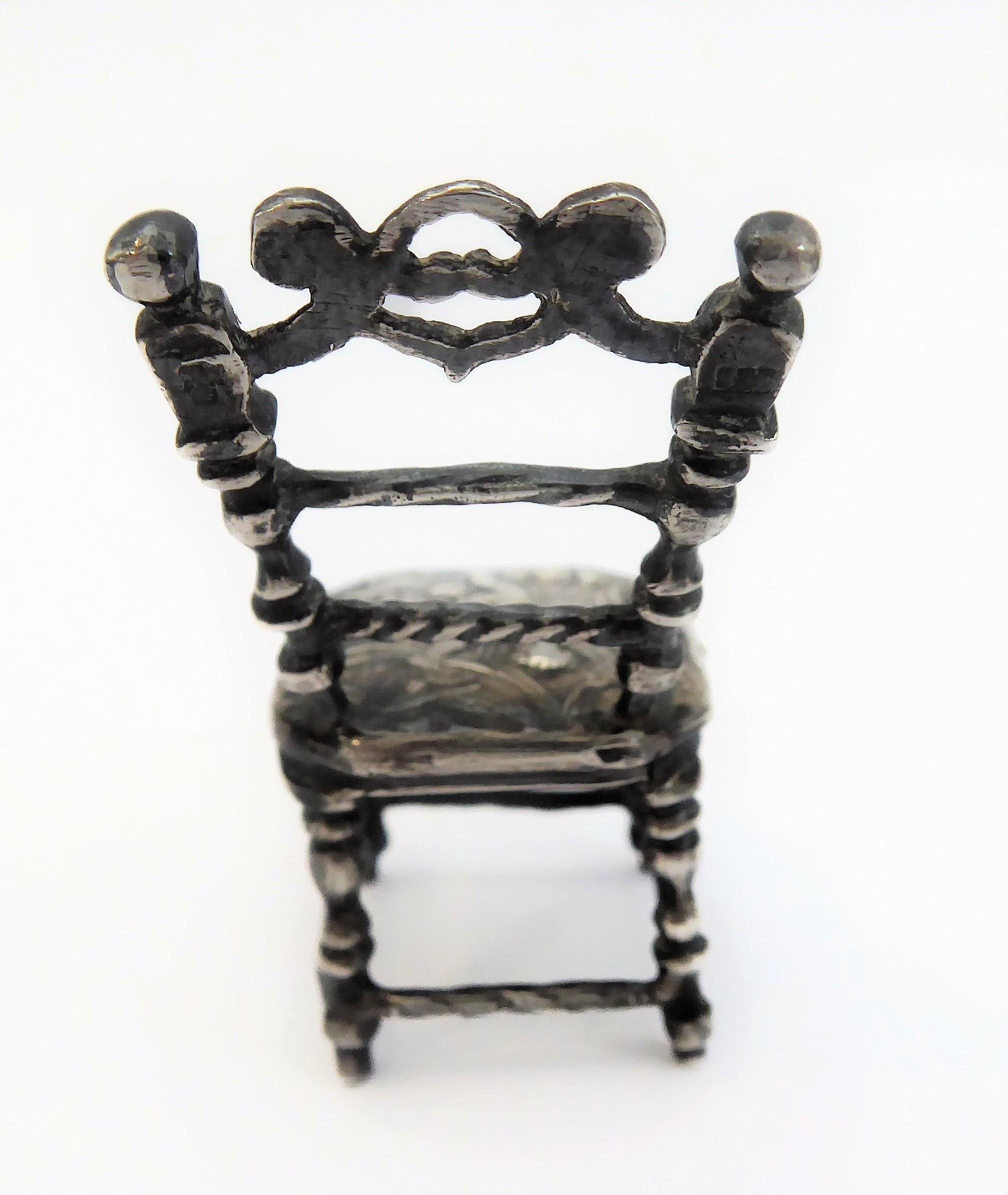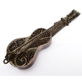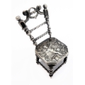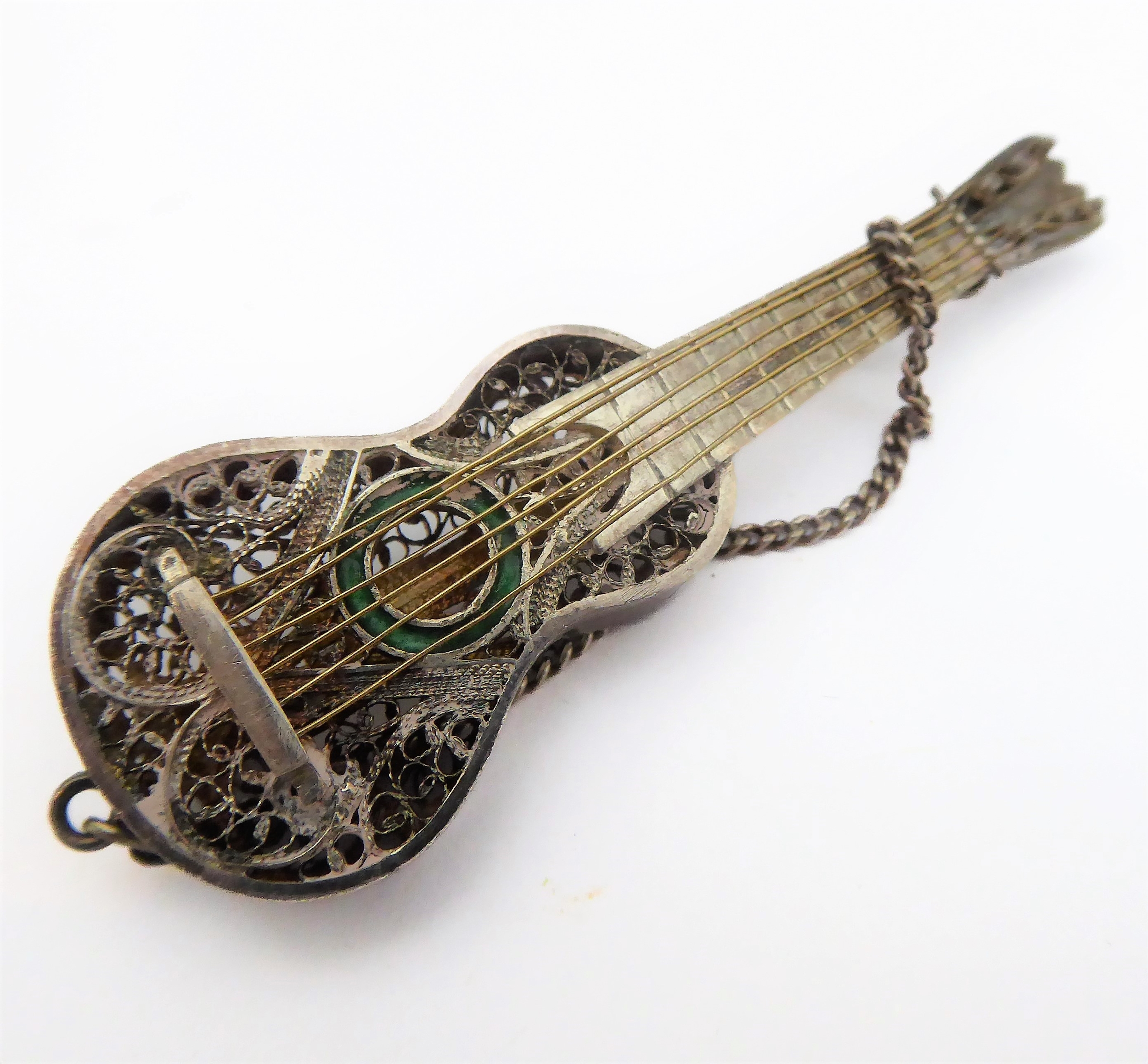 A novelty miniature hallmarked-silver chairs (probably Dutch): the seat decorated repoussé style with cherubic figures (with English import marks), together with a white metal filigree style brooch modelled as a Spanish classical acoustic guitar (2)