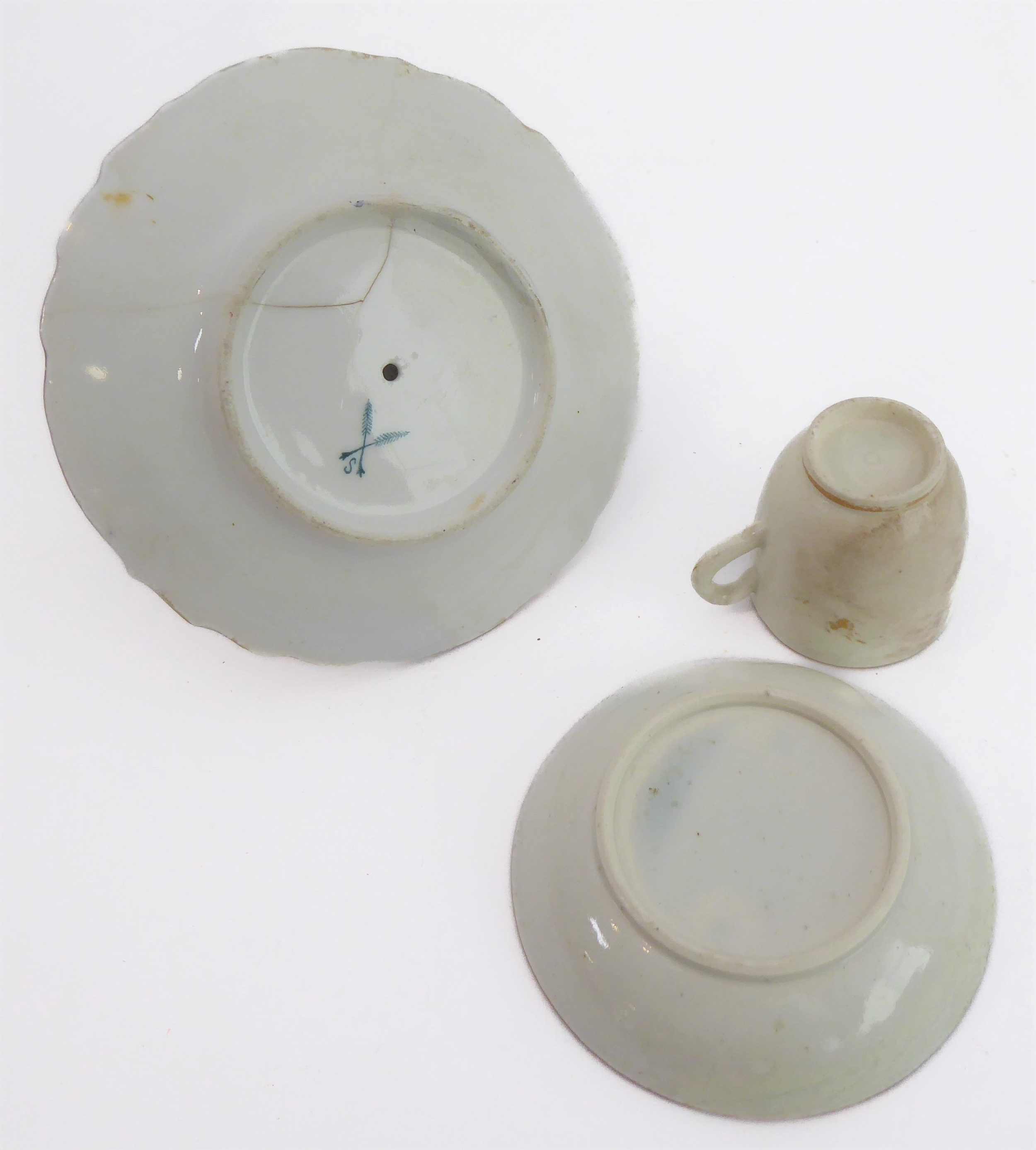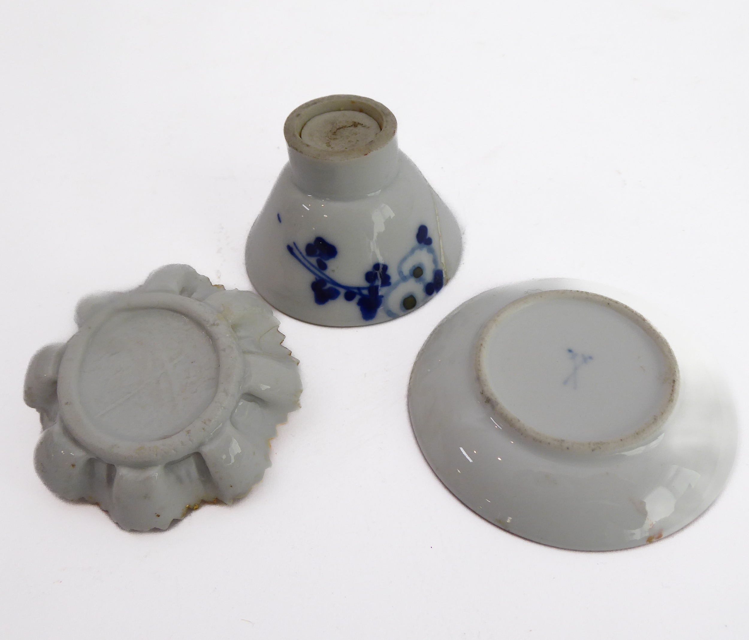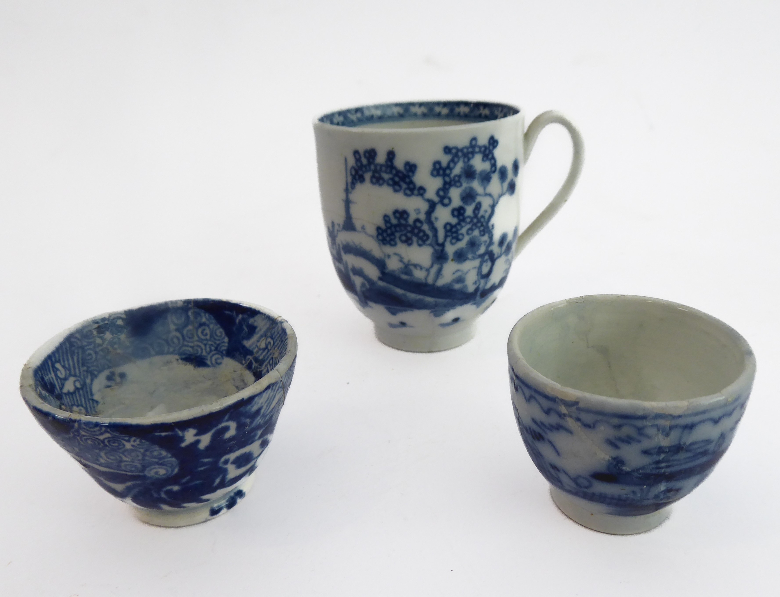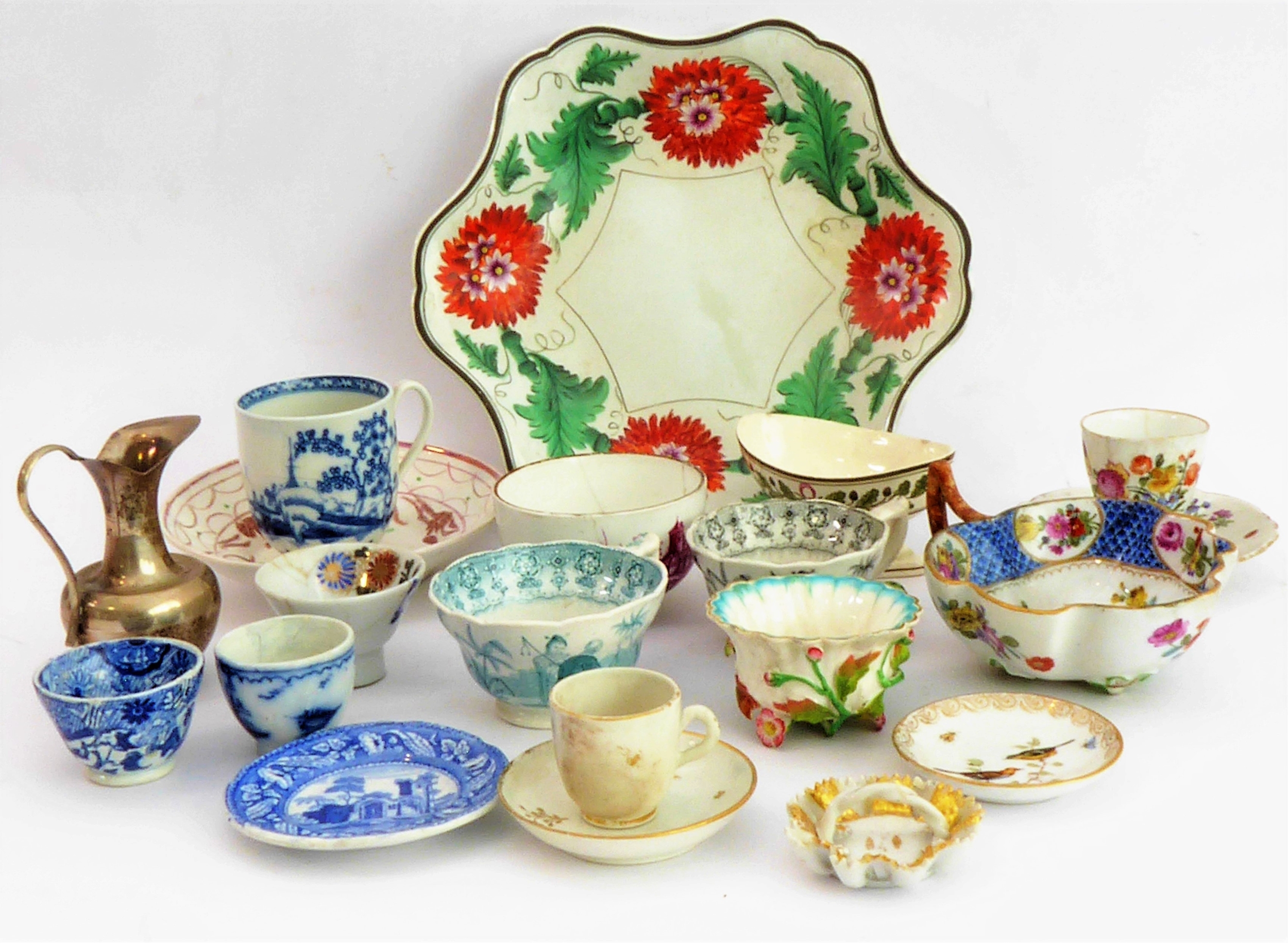 Early/mid 19th century ceramics to include various cups, bowls, saucers, a leaf-shaped cup with hand-painted blue 'AR' mark underneath, together with other items including a late 18th/early 19th century boat-shaped salt by Wedgwood of Etruria (selection)