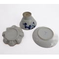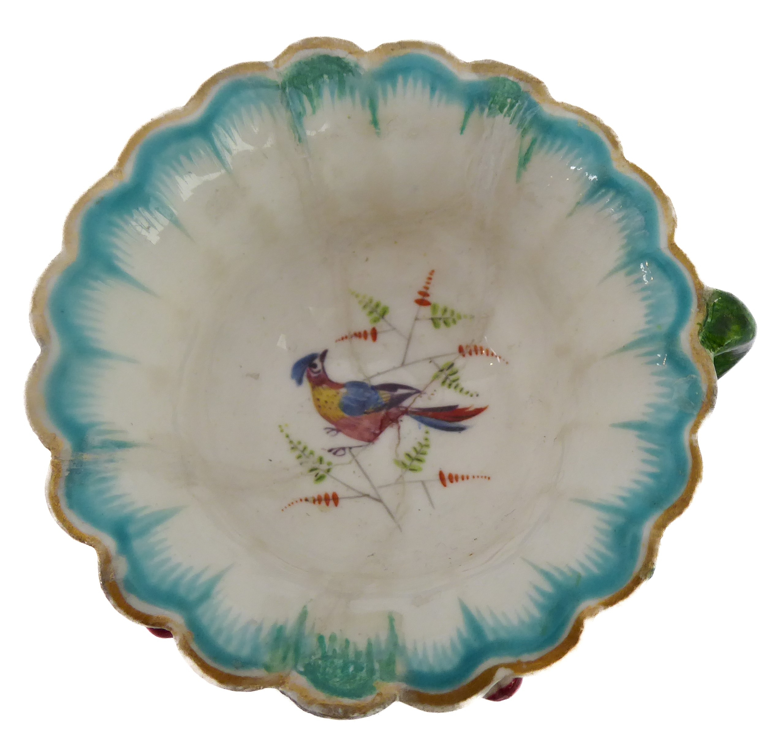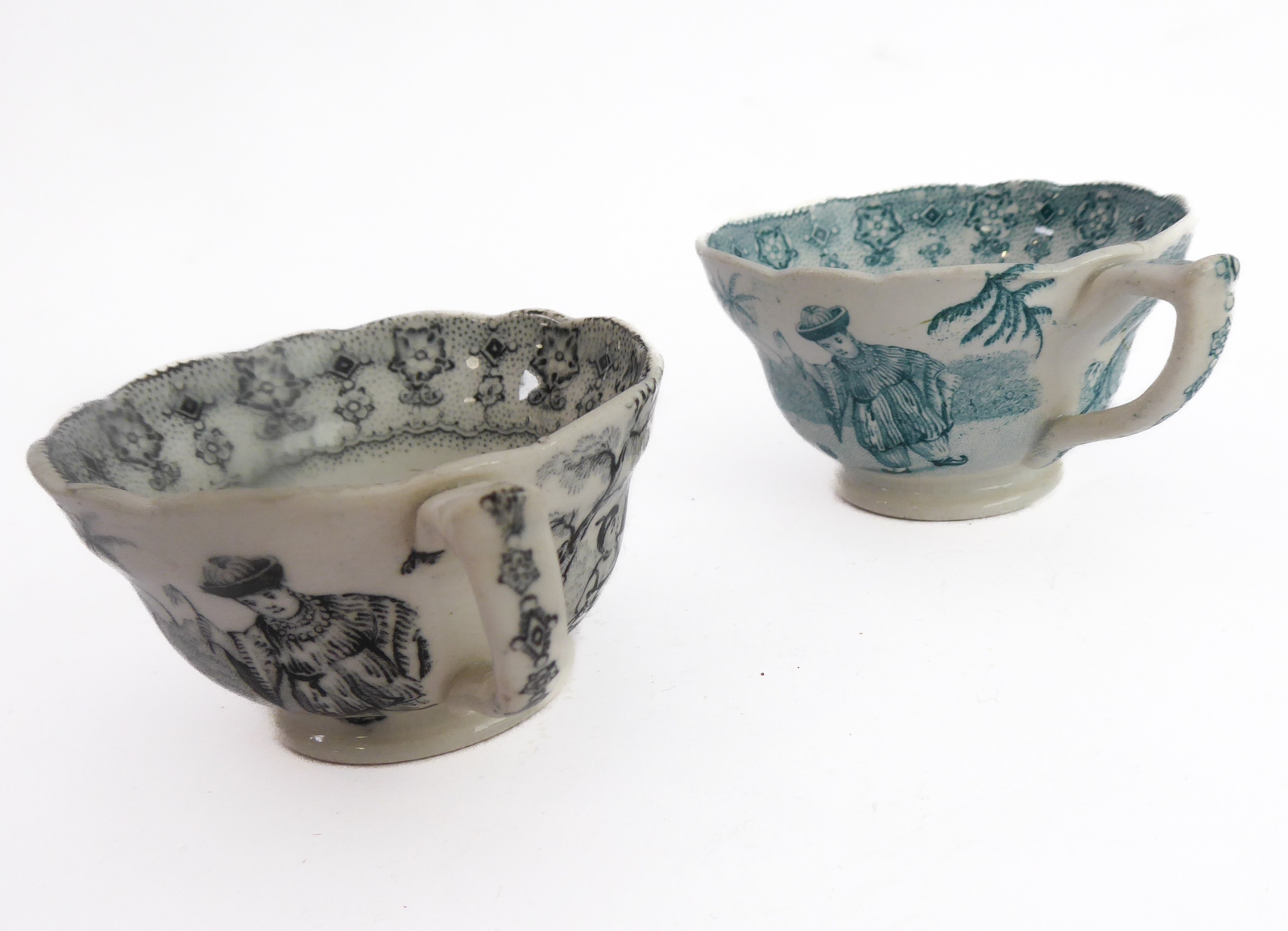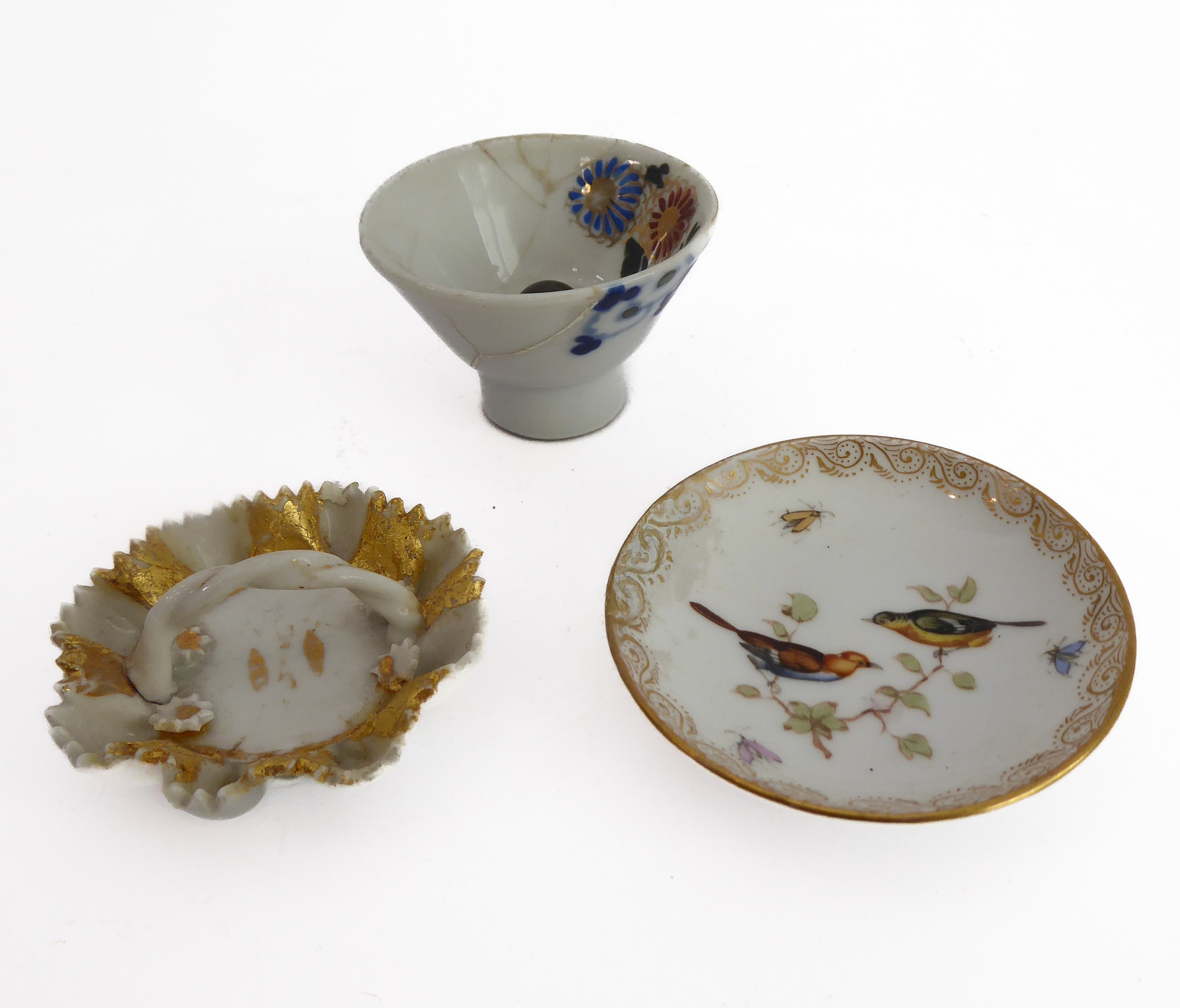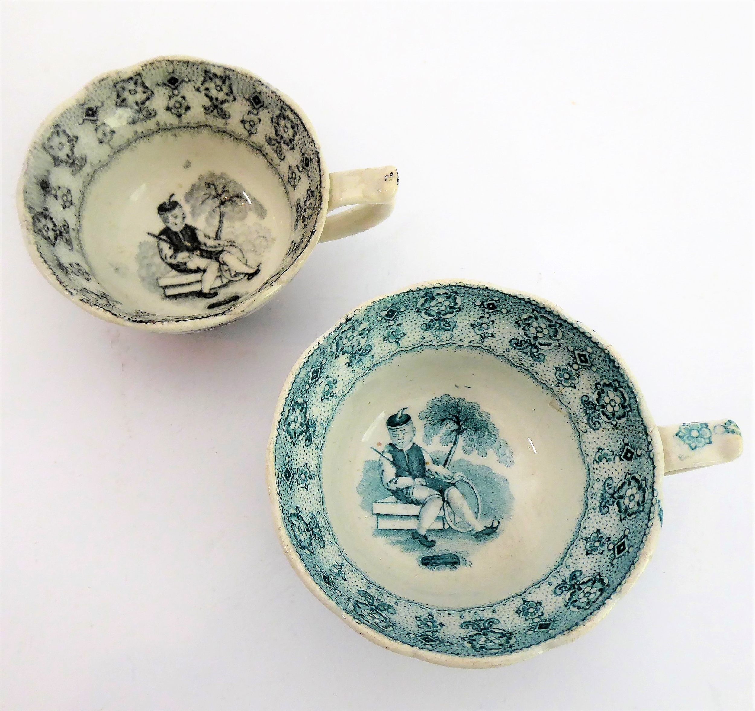 Early/mid 19th century ceramics to include various cups, bowls, saucers, a leaf-shaped cup with hand-painted blue 'AR' mark underneath, together with other items including a late 18th/early 19th century boat-shaped salt by Wedgwood of Etruria (selection)