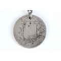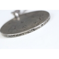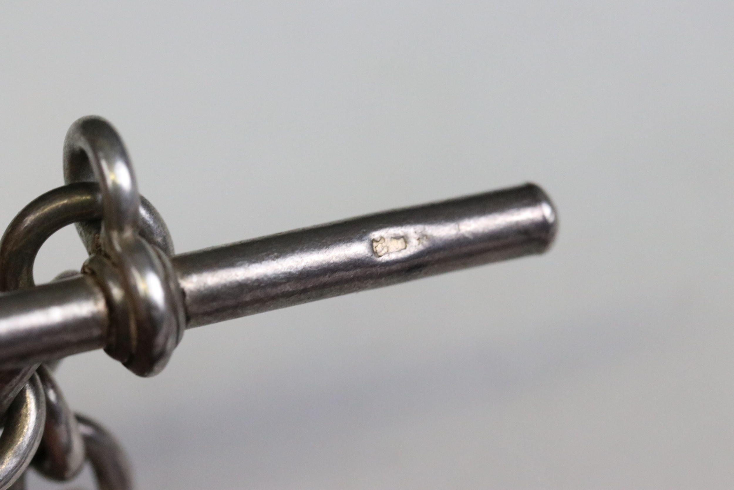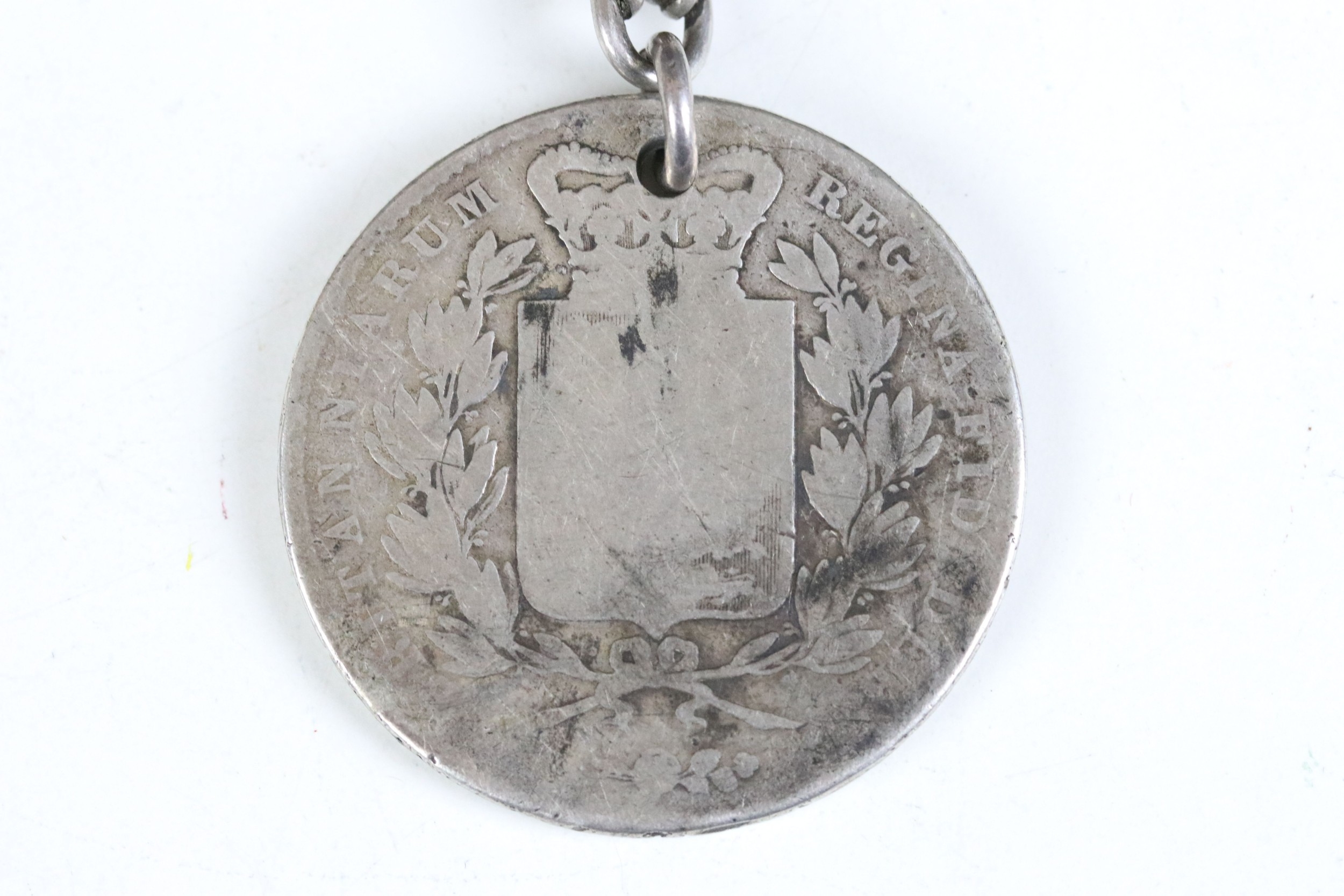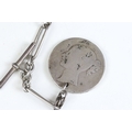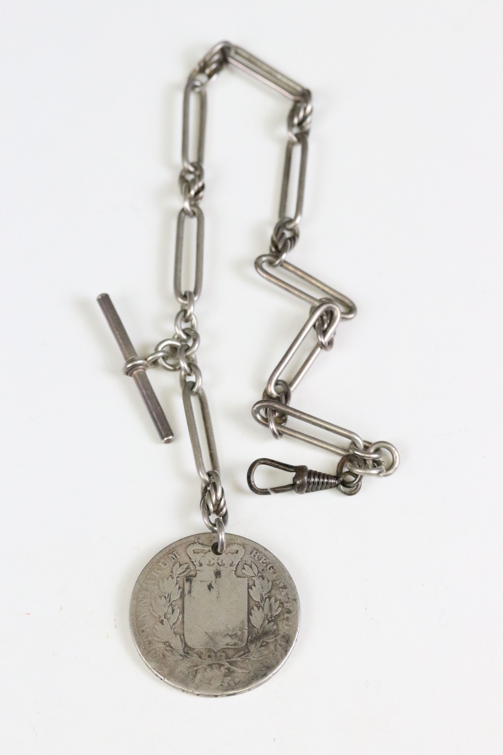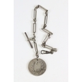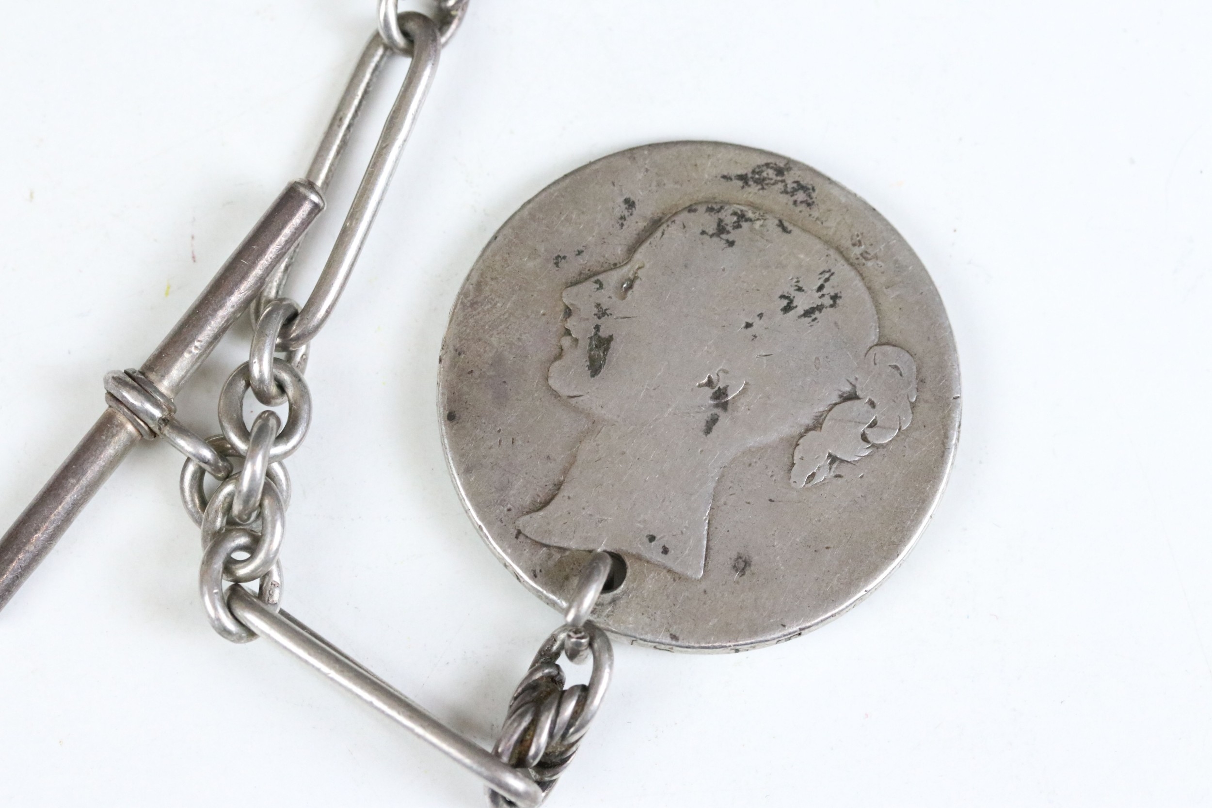 An antique hallmarked sterling silver fancy link pocket watch Albert chain with Queen Victoria crown coin fob, Lion marked to each link for sterling silver with full hallmarks to T-Bar, chain measures approx 30cm, weight is approx 59g