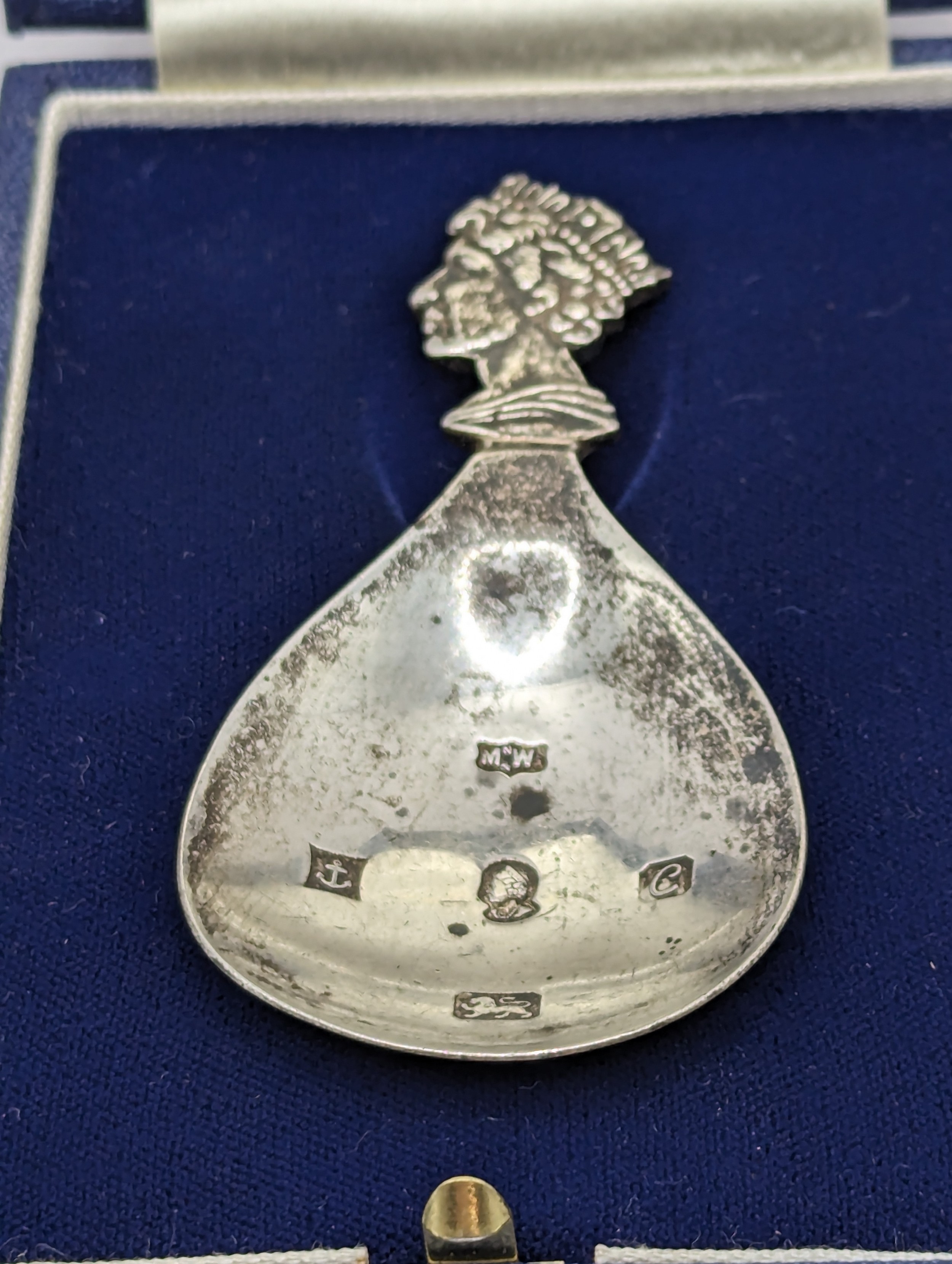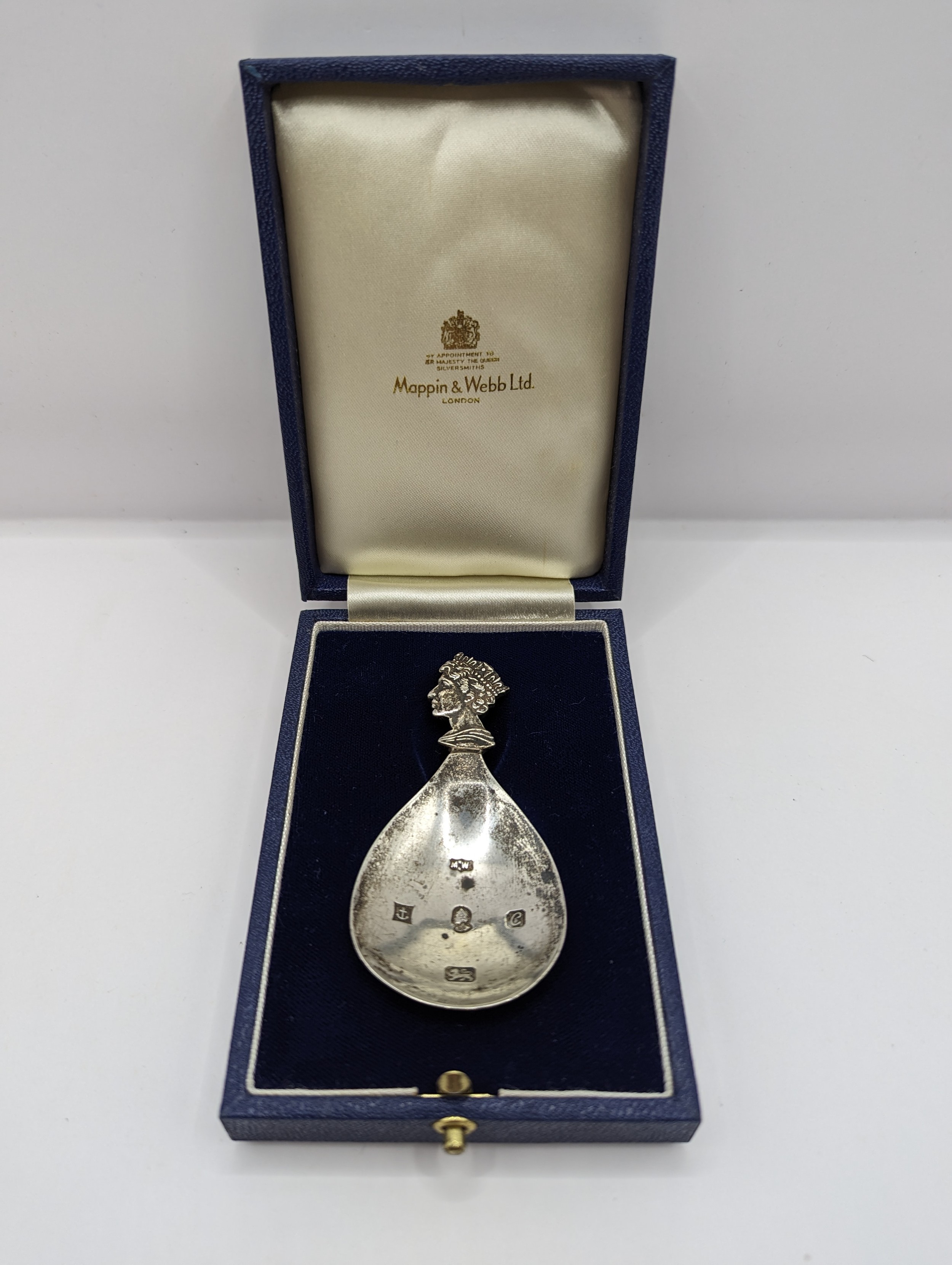 A.E. Webb silver silver jubilee commemorative caddy spoon, Mappin & Webb Ltd., Birmingham 1977, together with a fitted box