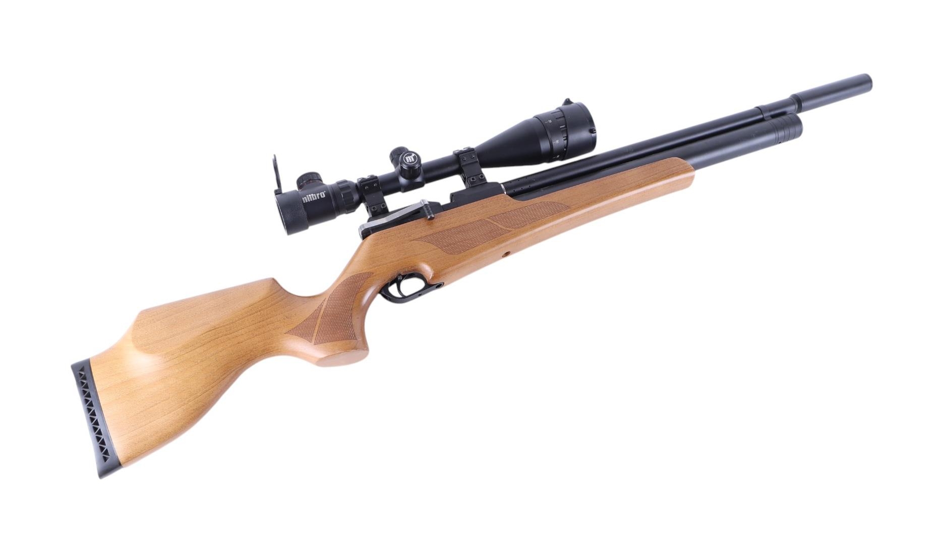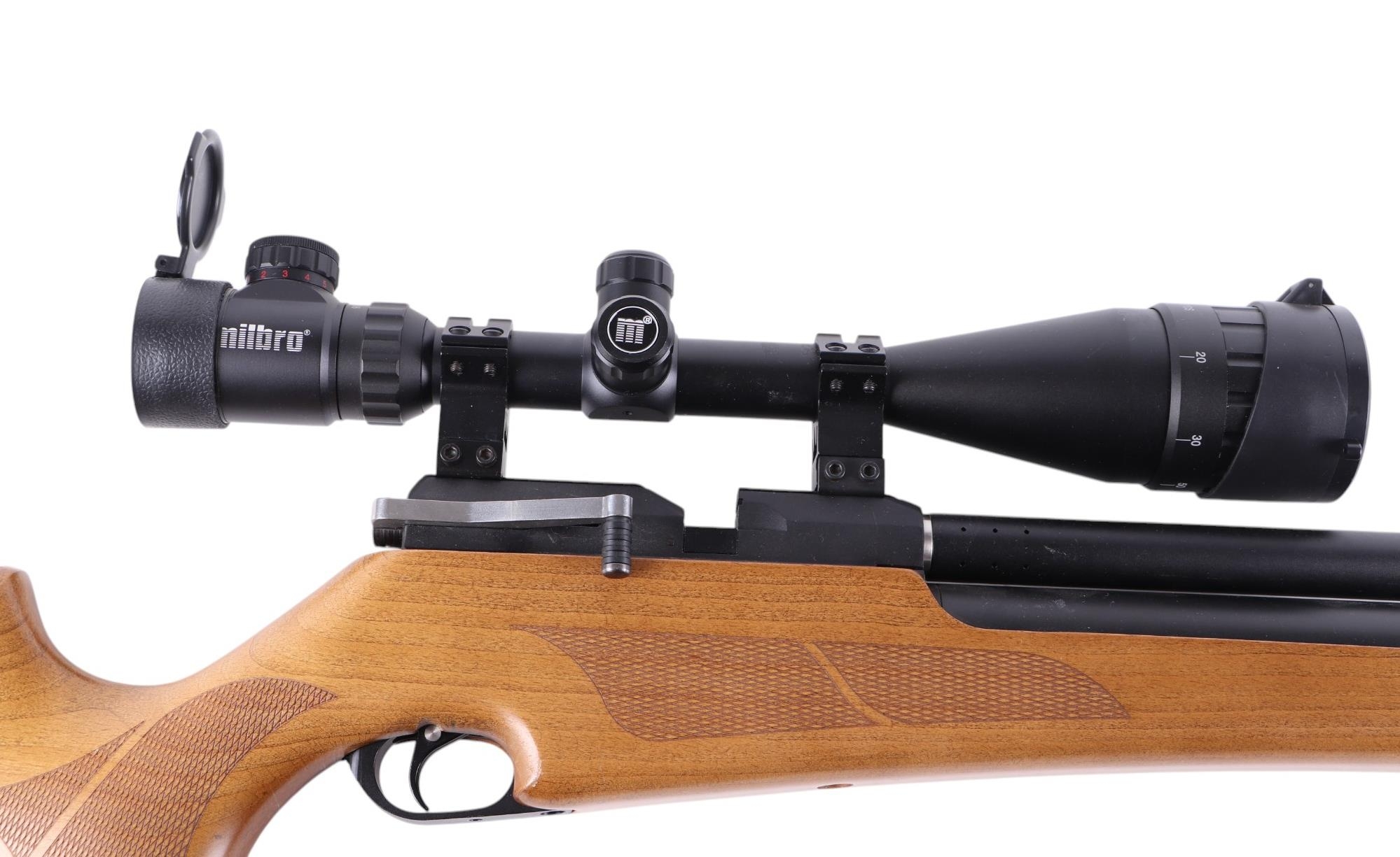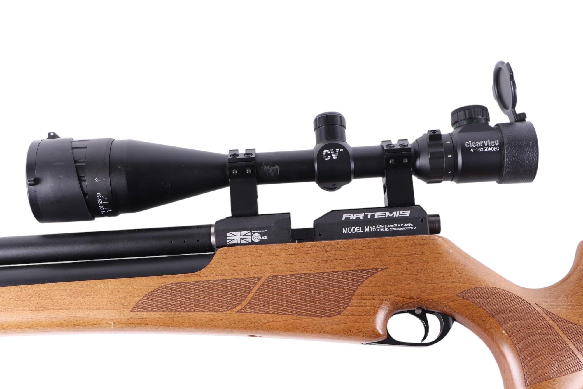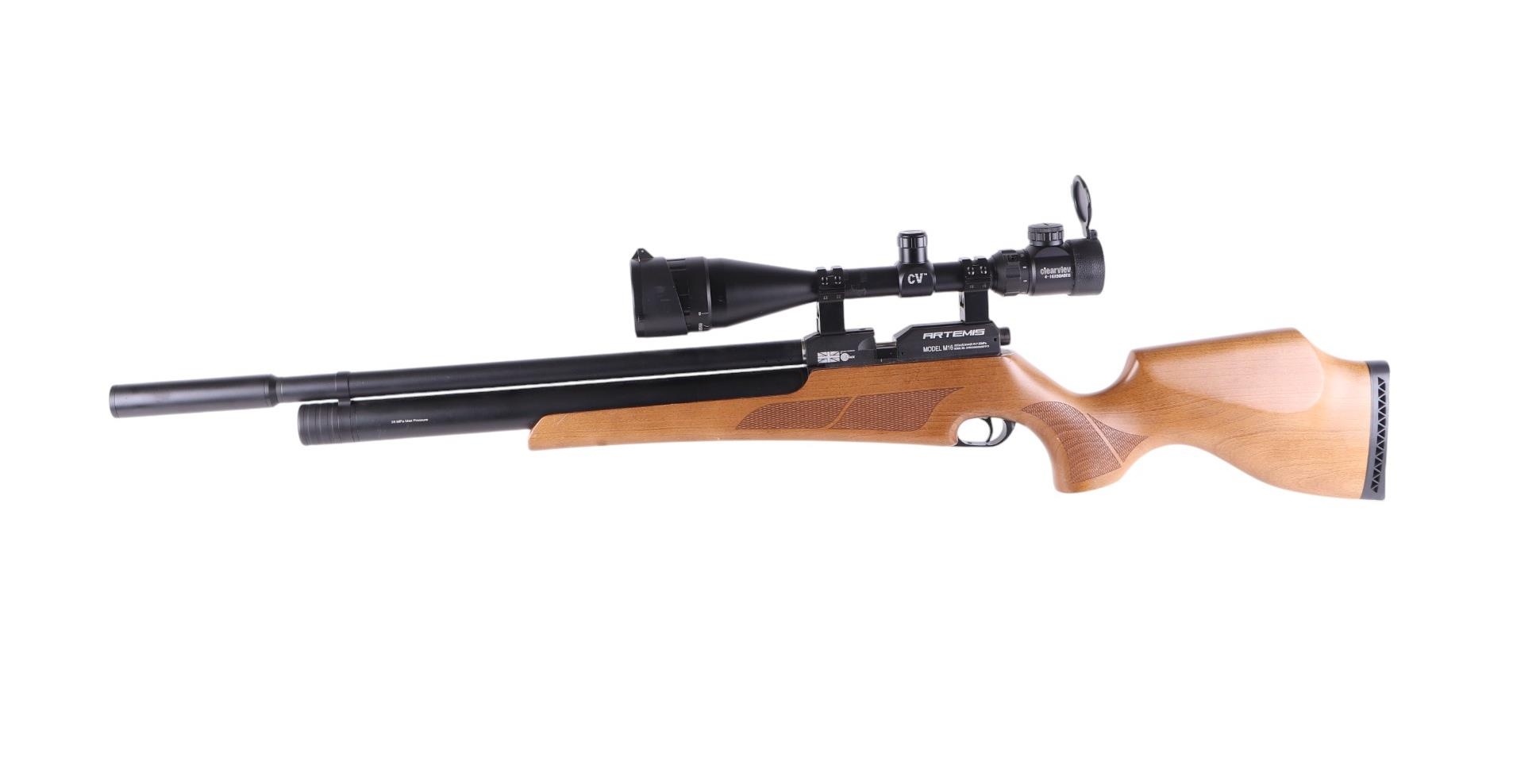 An Artemis model M16 .22 air rifle with Milbro clear view telescopic sight, 106cms long.