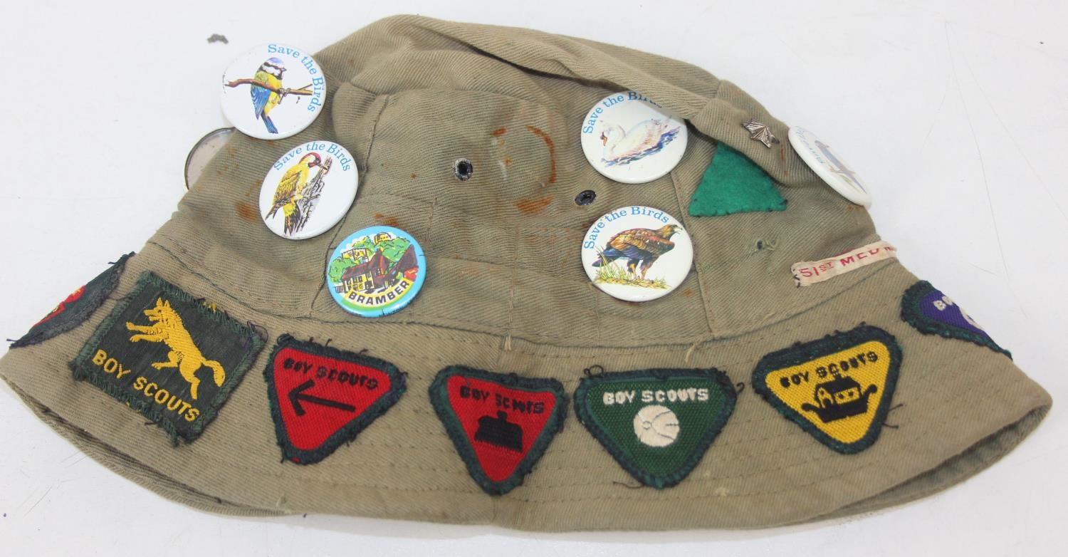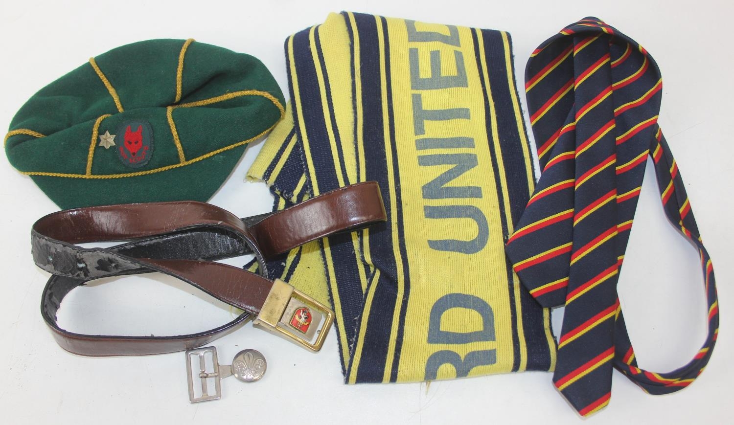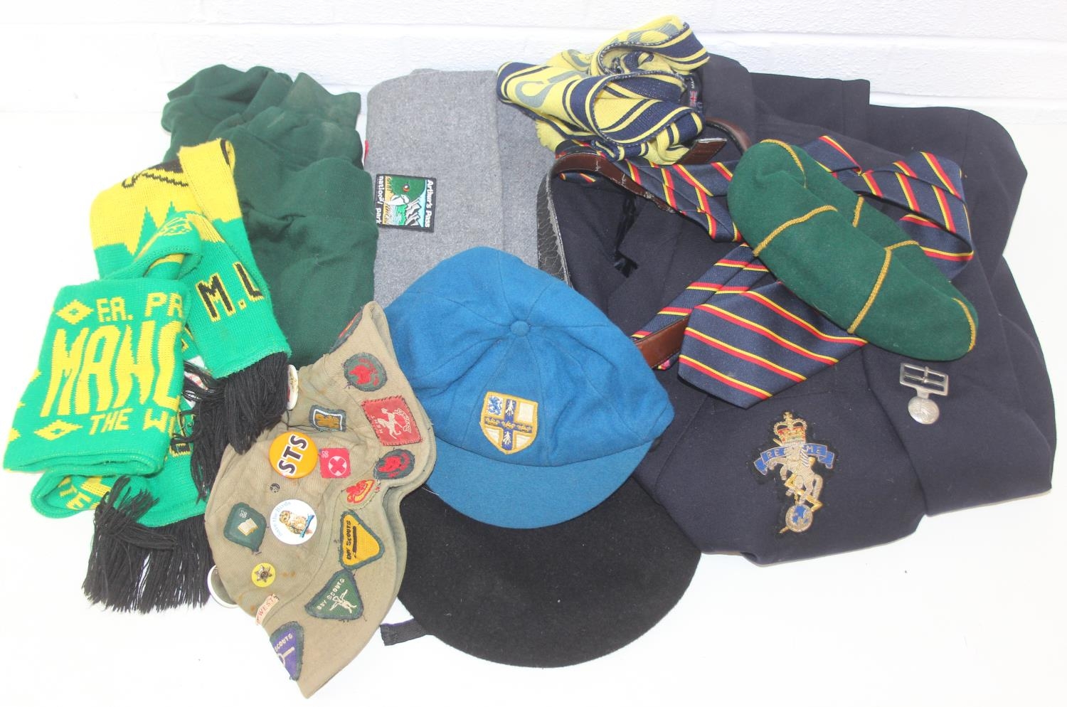 Qty of assorted vintage clothing and curios to inc scout clothing sewn with badges, a vintage Oxford United scarf, a number of military REME related pieces