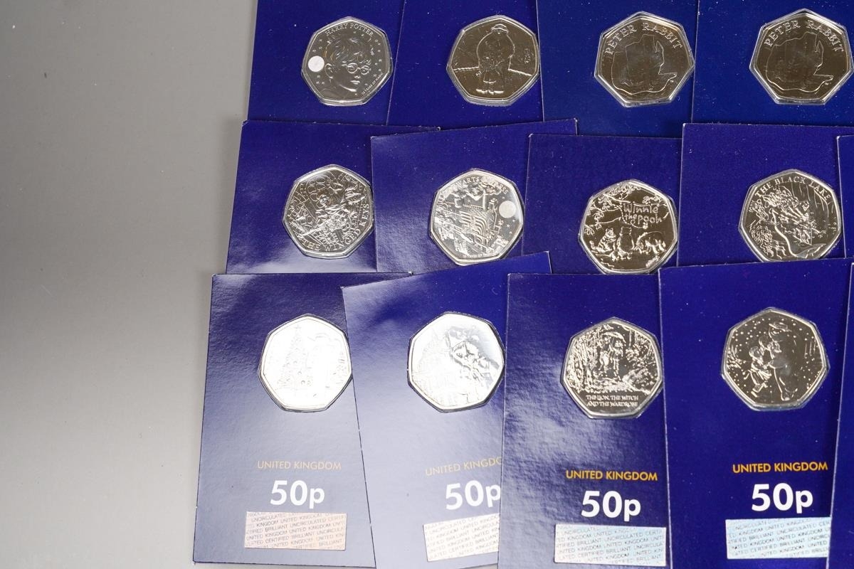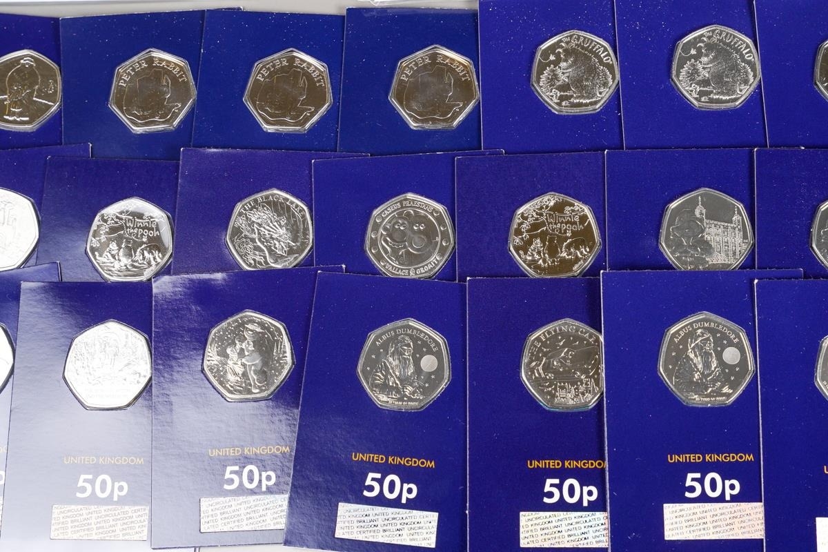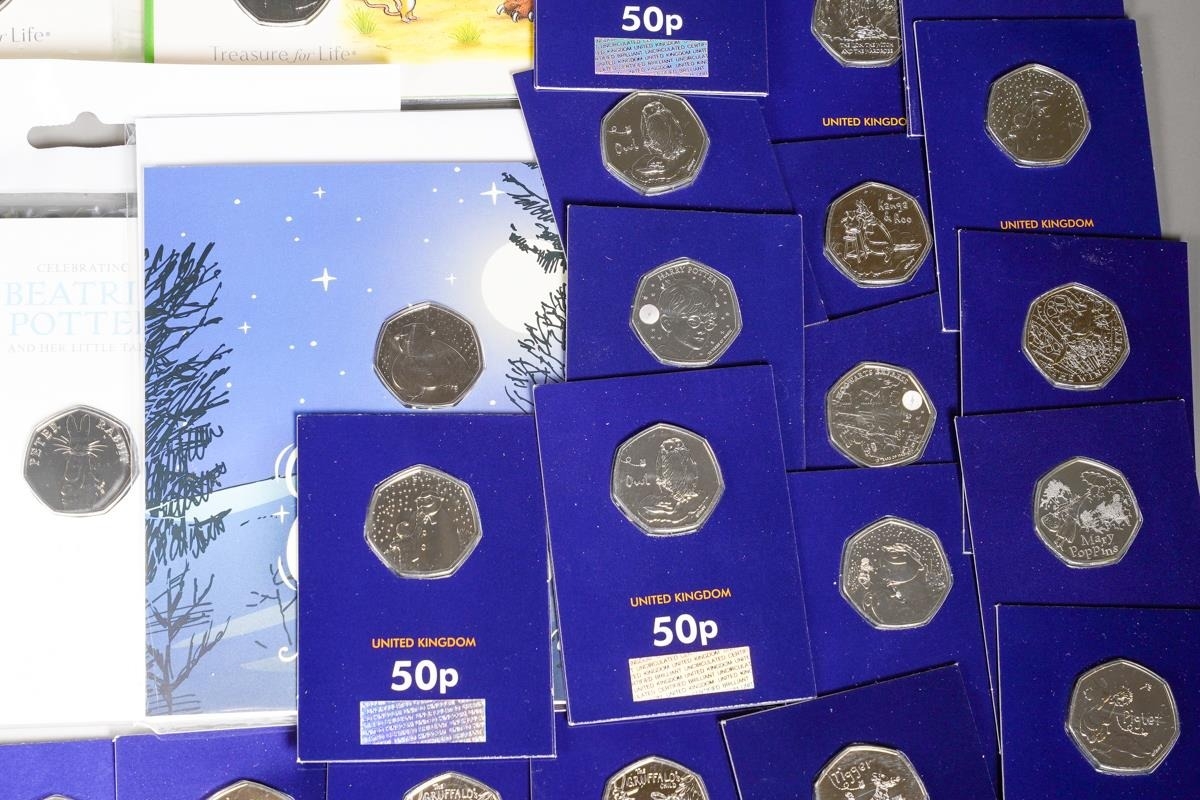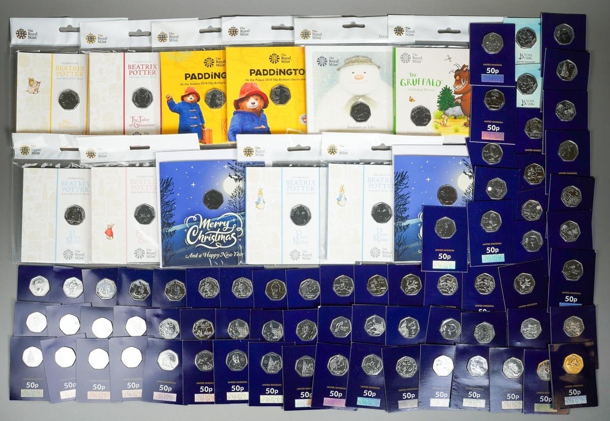UK COINS: A collection of current pictorial back 50 pence pieces all of children's story themes, including Beatrix Potter, Harry Potter, The Gruffalo, The Snowman, Paddington, etc, twelve in sealed Royal Mint packs, two for Magic Light (Julia Donaldson's Zog), the remaining sixty four in Change Checker packs, £39 total in legal tender (1 bag)